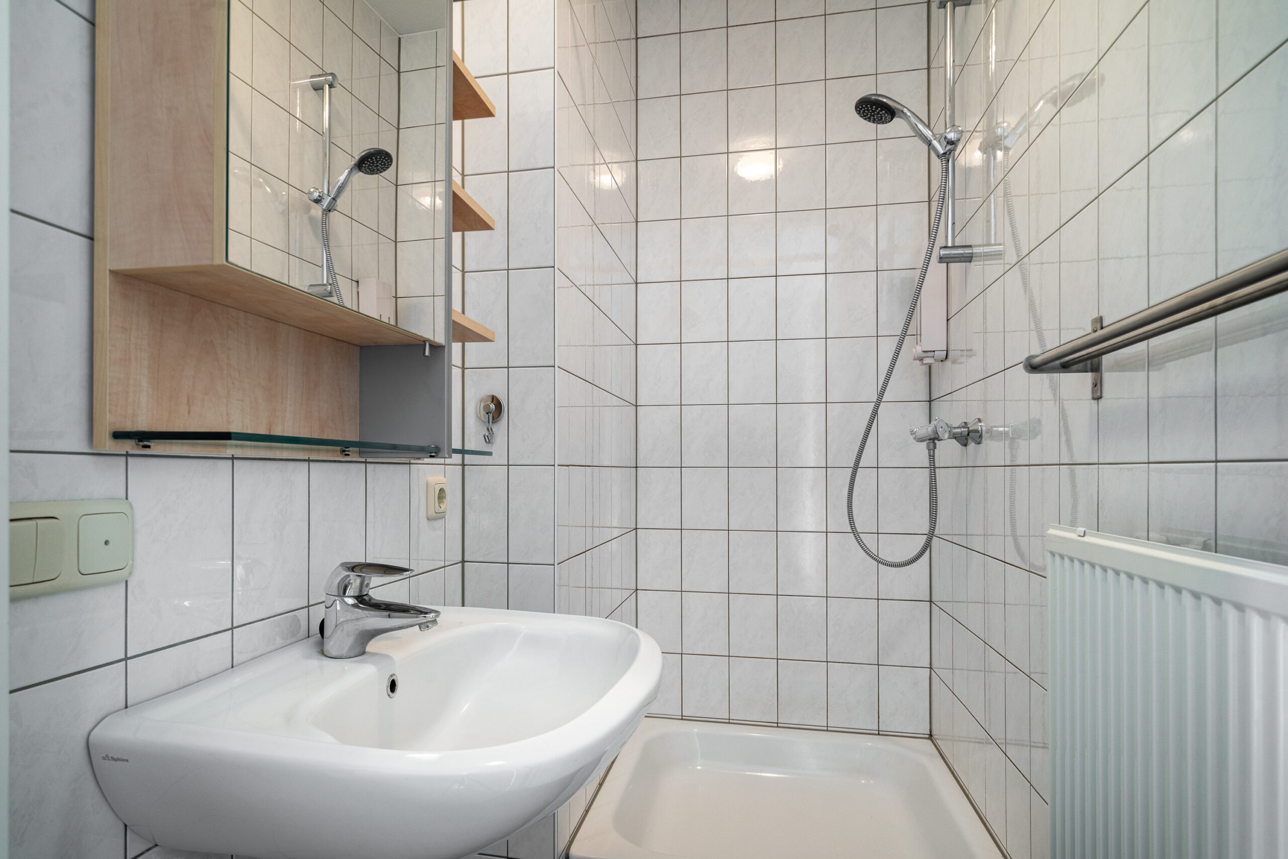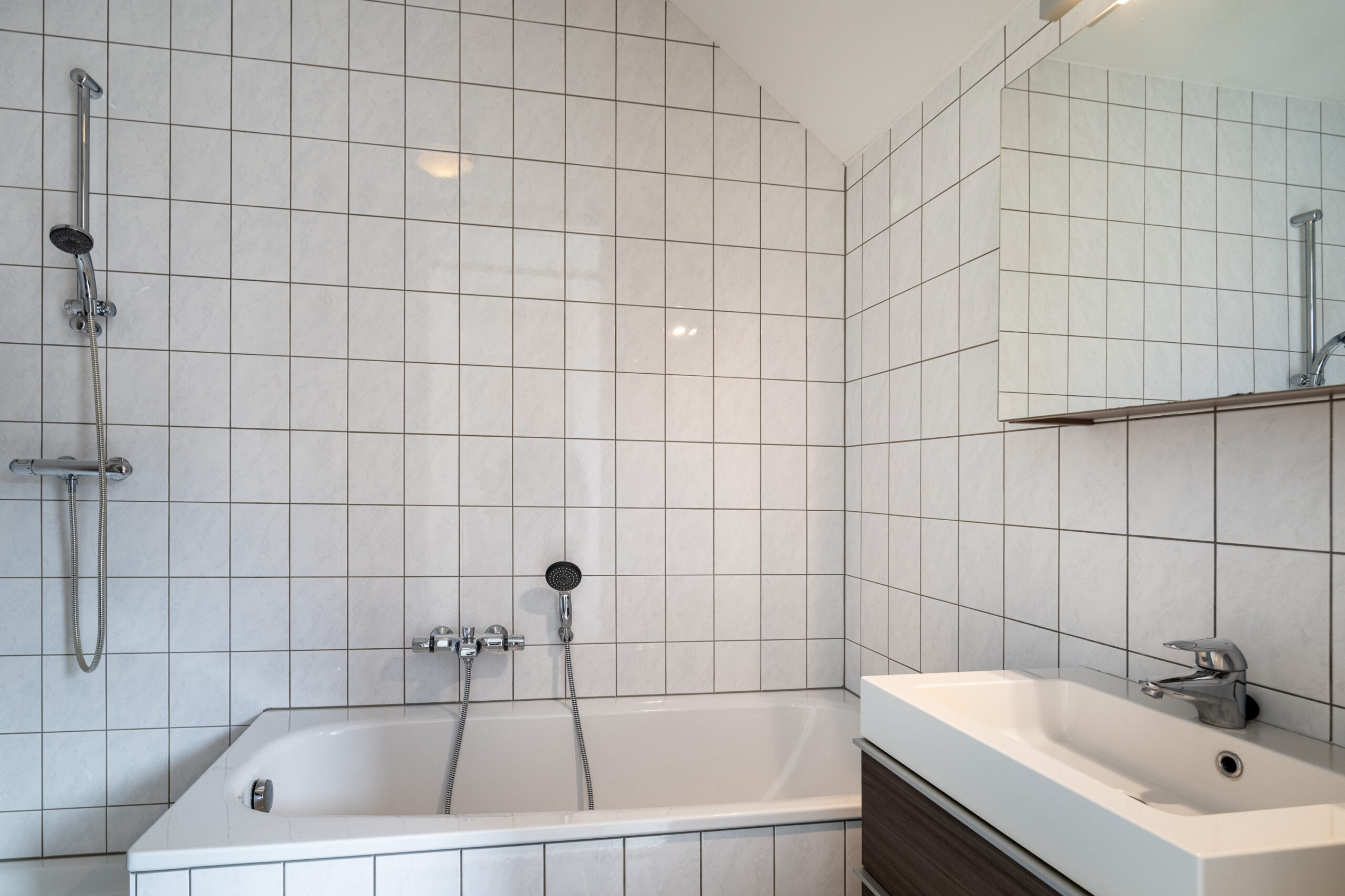 Naast de slaapkamers bevindt zich de tweede badkamer, welke eveneens geheel betegeld is en is voorzien van een douche, wastafel, spiegelkast en mechanische ventilatie. Daarnaast is er een technische ruimte aanwezig met de WTW-installatie (Brink, 2004, eigendom) en de combi cv/hr-ketel (Intergas, 2025, huur via Volta).