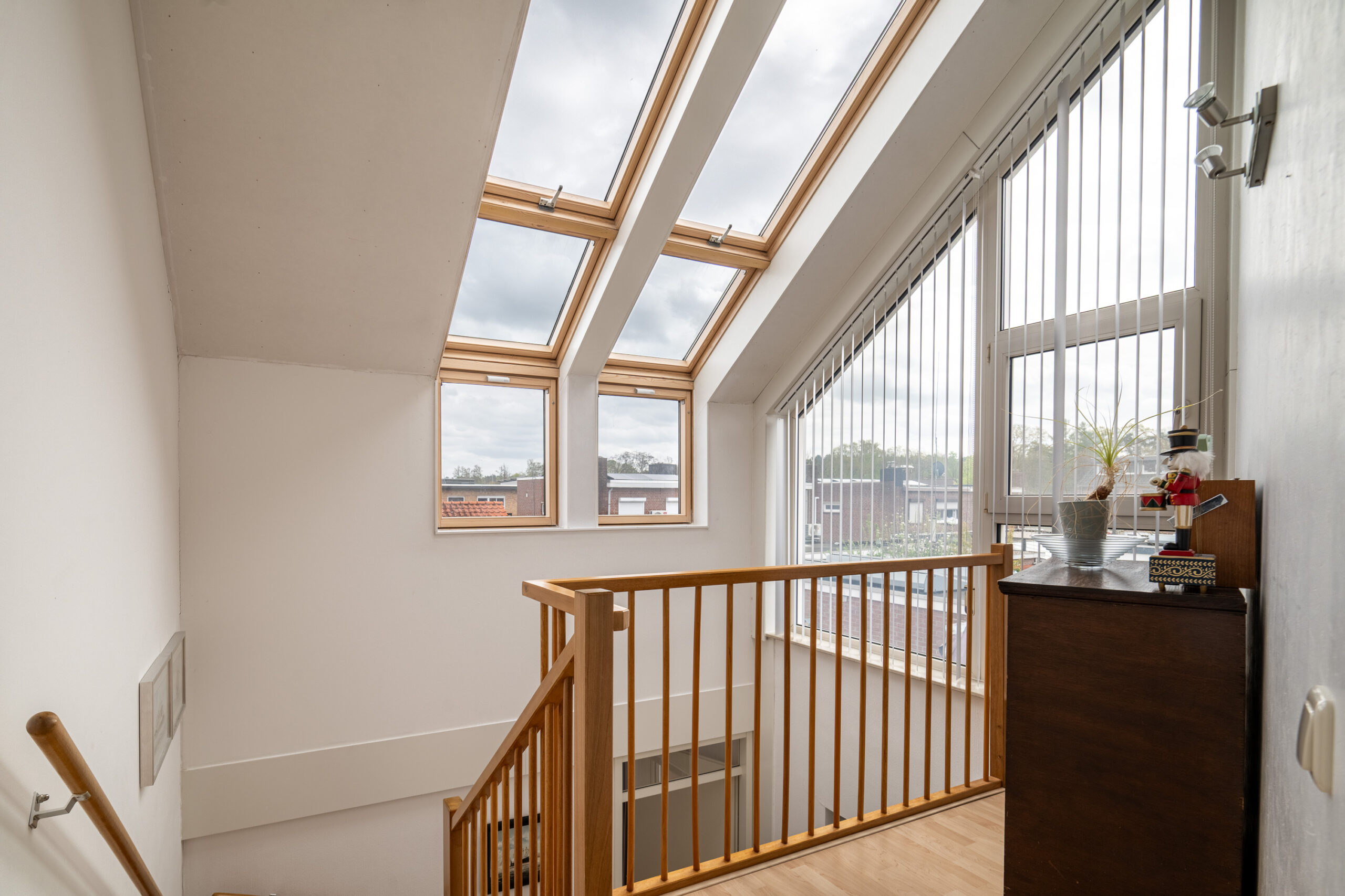Via de brede hardhouten trap bereikt u de overloop met vide. Dankzij de royale raampartijen is dit een bijzonder lichte en open ruimte, wat bijdraagt aan een aangename ruimtelijke beleving.