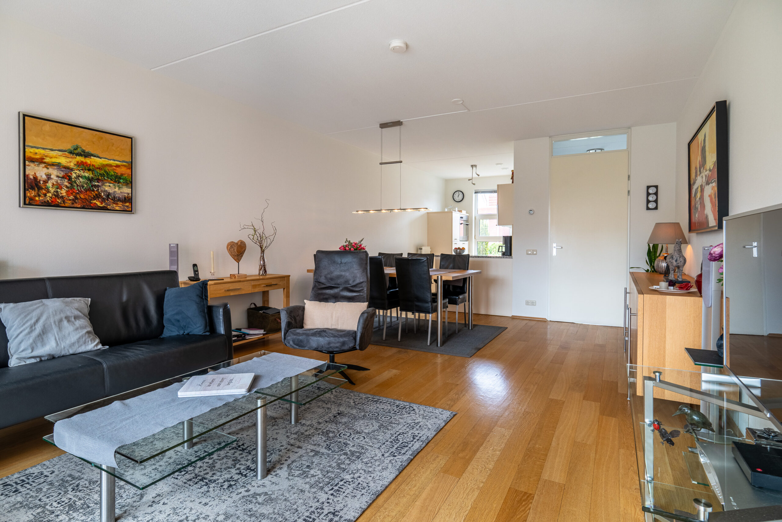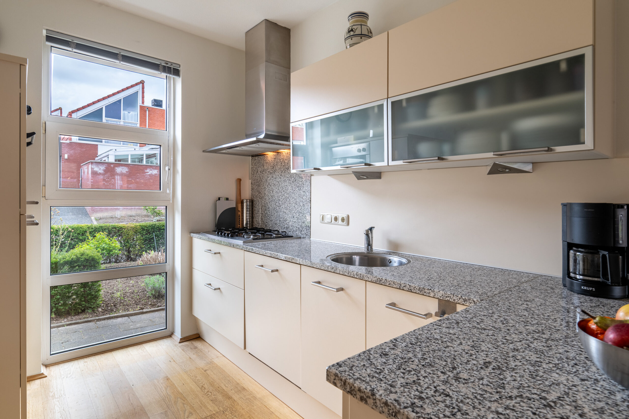 Via de netjes aangelegde voortuin en eigen oprit bereikt u de entree van de woning. U komt binnen in een ruime en verzorgde hal, voorzien van een plavuizen vloer. Vanuit de hal heeft u toegang tot de woonkamer en de inpandige garage. Tevens bevinden zich hier de meterkast en een praktische garderobenis. De woonkamer betreft een sfeervolle en verrassend diepe living van circa 36 m², met een prettige lichtinval dankzij de grote raampartijen. De ruimte is afgewerkt met een parketvloer en biedt een comfortabele en huiselijke sfeer. Aan de voorzijde van de woonkamer bevindt zich de open keuken. Deze is voorzien van een granieten werkblad en uitgerust met diverse inbouwapparatuur, te weten: een 5-pits gaskookplaat, afzuigkap, koelkast, oven en vaatwasser.