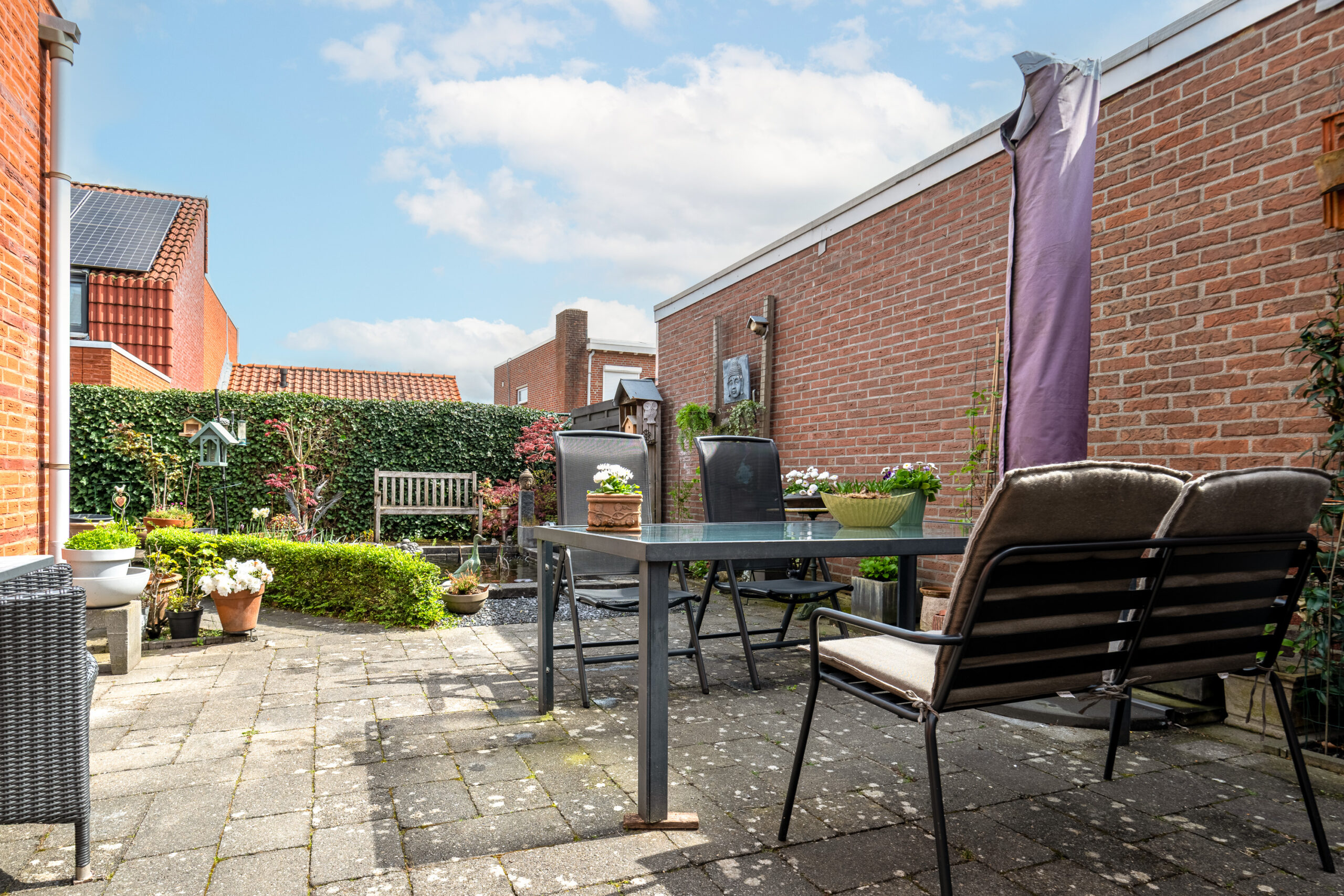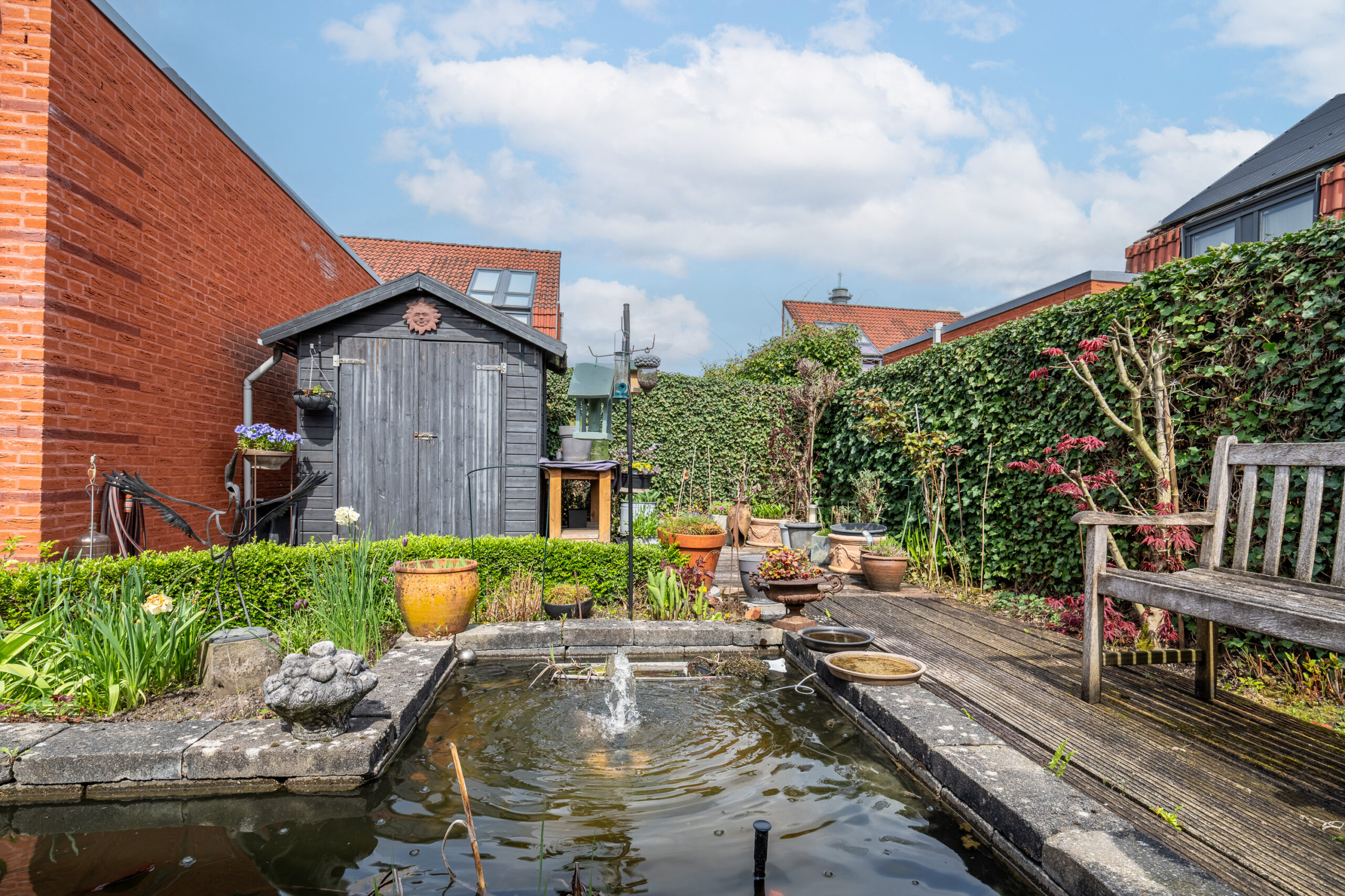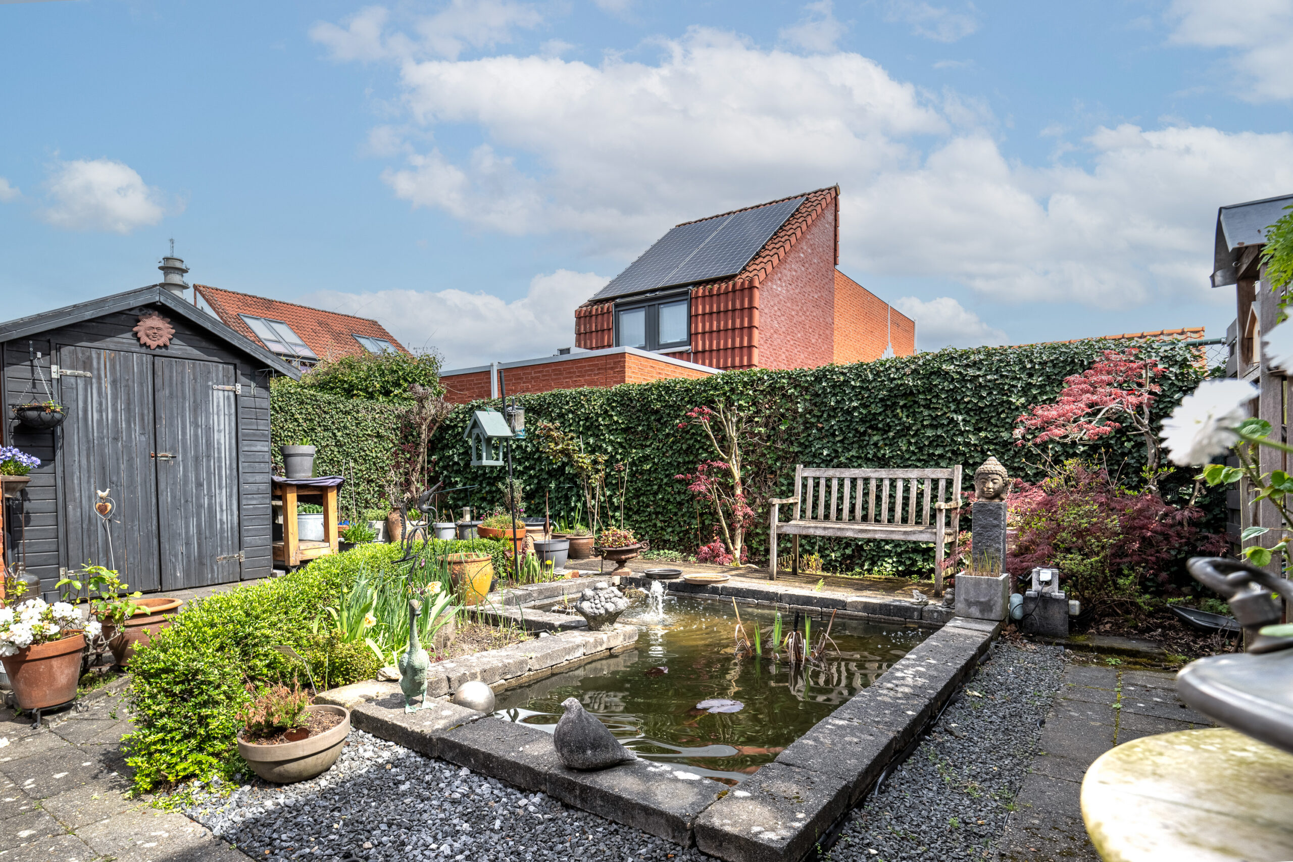 Via de schuifpui in de woonkamer en de loopdeur in de verdeelhal bereikt u de zonnige, volledig omsloten achtertuin. De tuin biedt veel privacy en is deels onderhoudsvriendelijk aangelegd, met een fijne balans tussen groen en bestrating. Daarnaast beschikt de tuin over een vijverpartij en een praktisch tuinhuis, waardoor u hier in alle rust kunt genieten van het buitenleven.