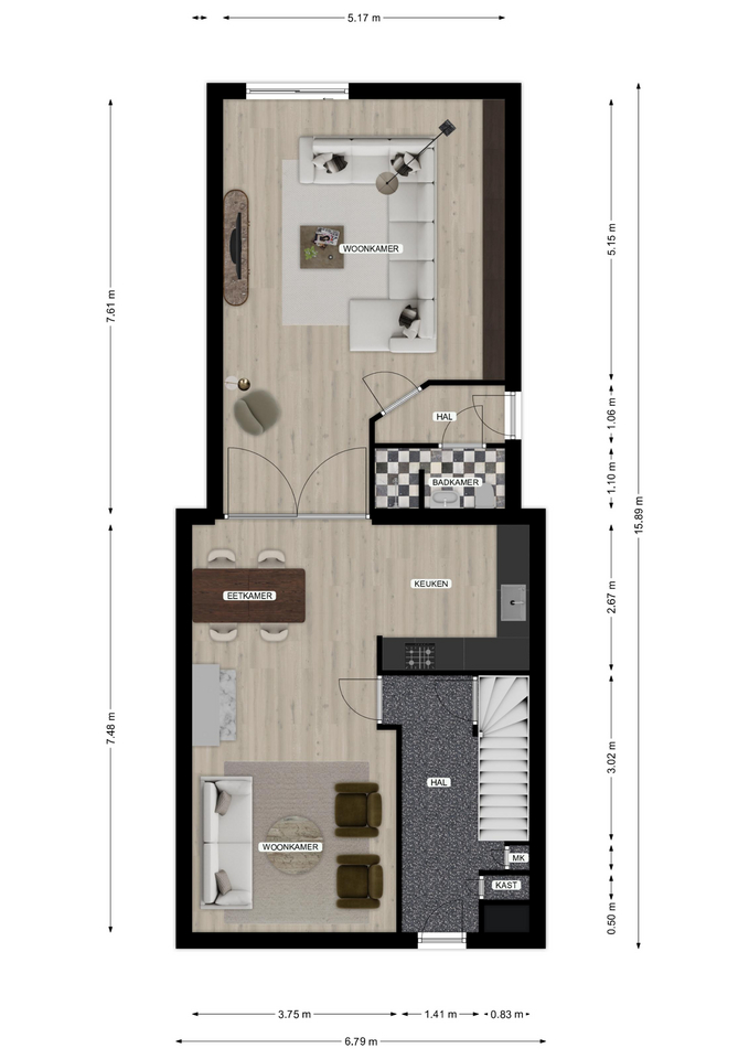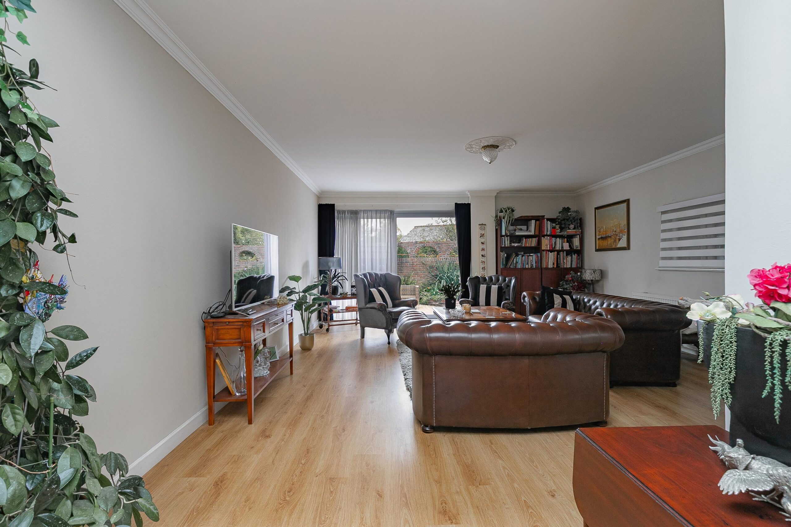 Dubbele stalendeuren bieden toegang tot de tweede woonkamer, een lichte leefruimte met laminaatvloer, grote lichtstraat en schuifpui naar de tuin. Vanuit deze kamer is tevens de hal bereikbaar die toegang biedt tot de achteruitgang en de eerste badkamer met toilet en douche.