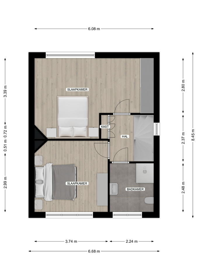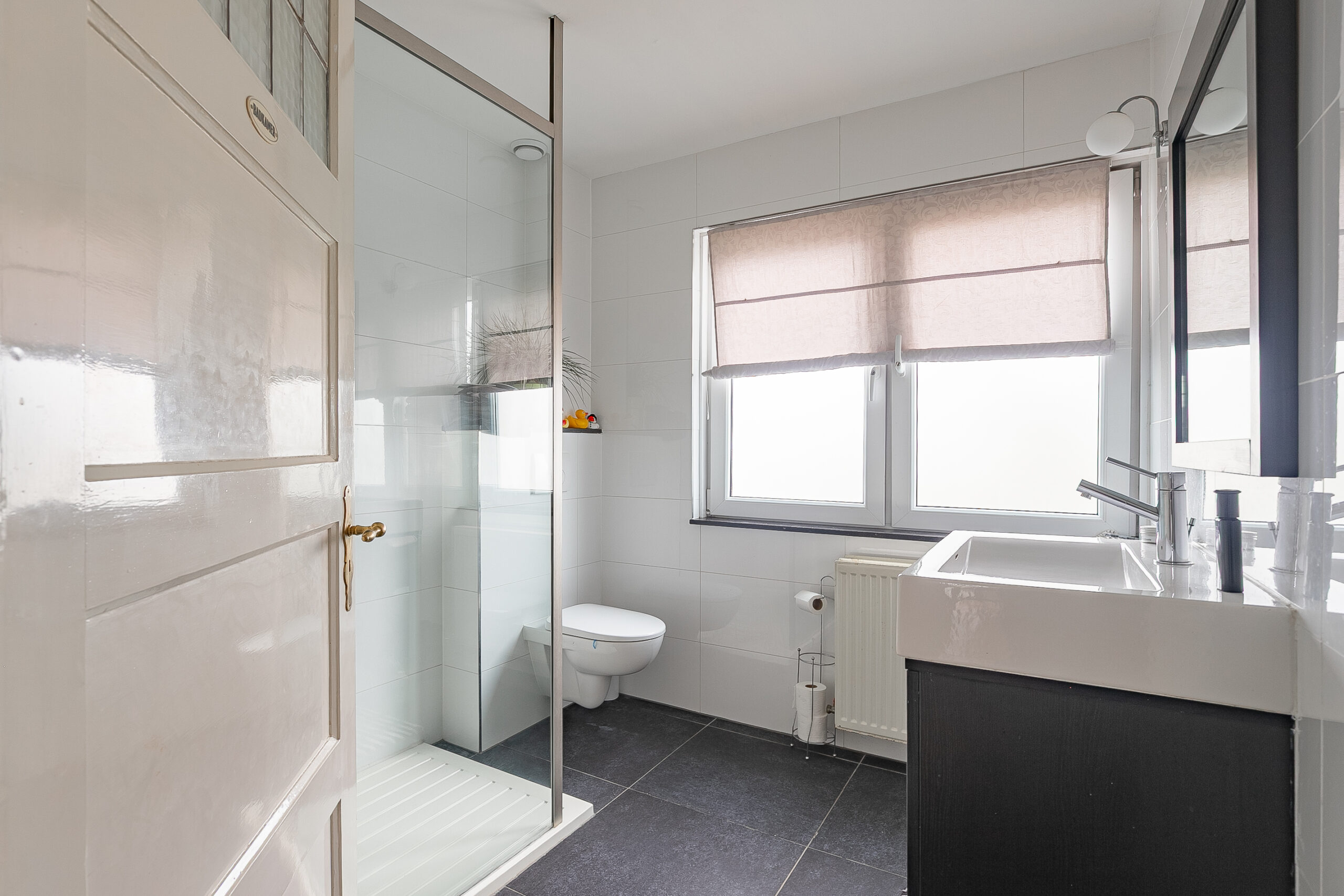 De eerste verdieping omvat twee ruime slaapkamers en een modern afgewerkte badkamer met inloopdouche voorzien van hardglazen wand, inbouwtoilet en wastafelmeubel. De slaapkamer aan de achterzijde beschikt over een inbouwkast met geïntegreerde verlichting. De gehele verdieping is afgewerkt met laminaatvloeren. De slaapkamers bedragen ca.: