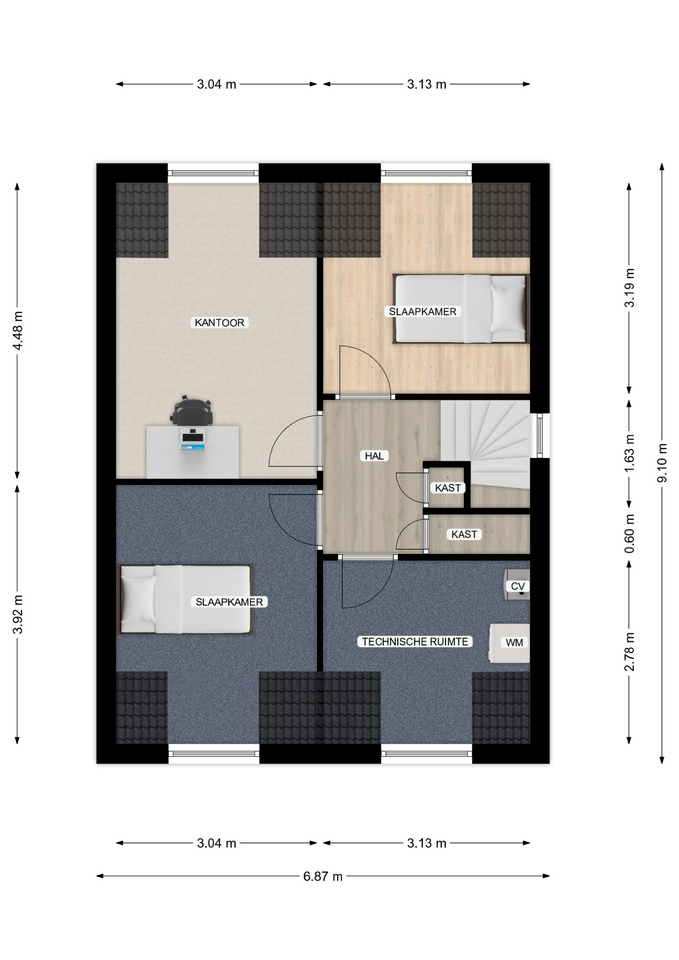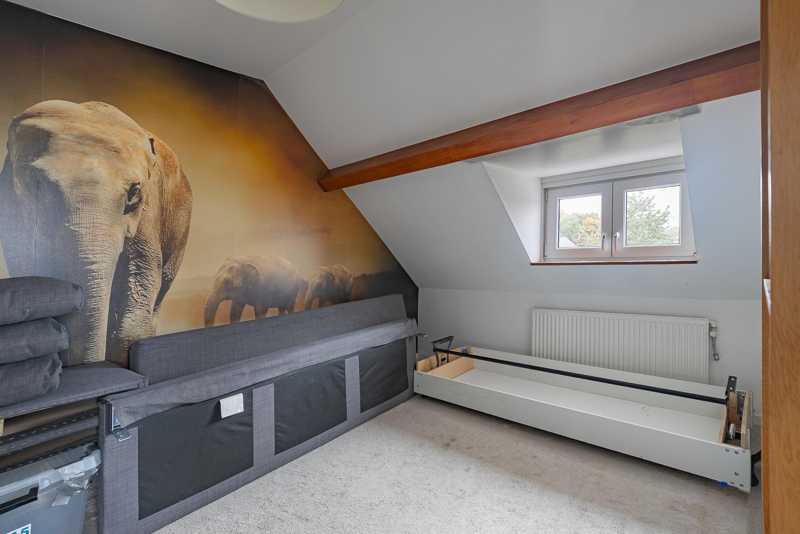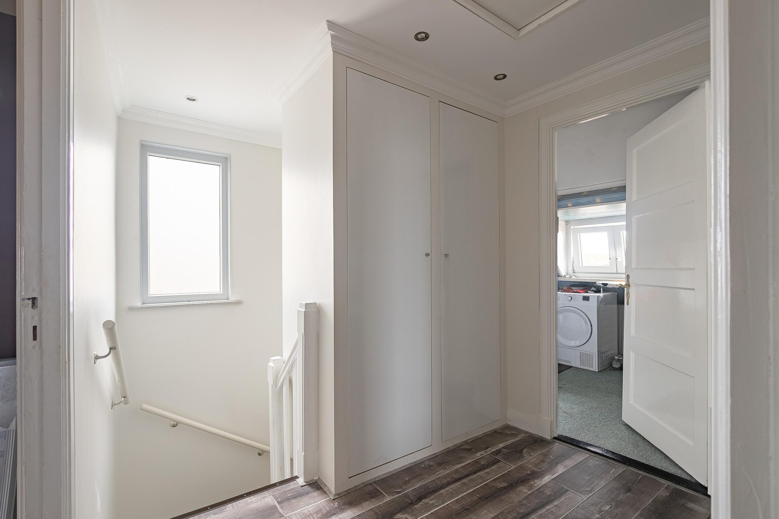 Via de vaste trap toegang tot de tweede verdieping met overloop, drie slaapkamers, technische ruimte en bergruimte. De technische ruimte beschikt over een aansluiting voor witgoed en biedt plaats aan de tweede cv-ketel. Twee slaapkamers zijn voorzien van een vide, ideaal als slaap- of opbergruimte. Dankzij de dakkapellen beschikken alle vertrekken over aangename lichtinval. De slaapkamers bedragen ca.: