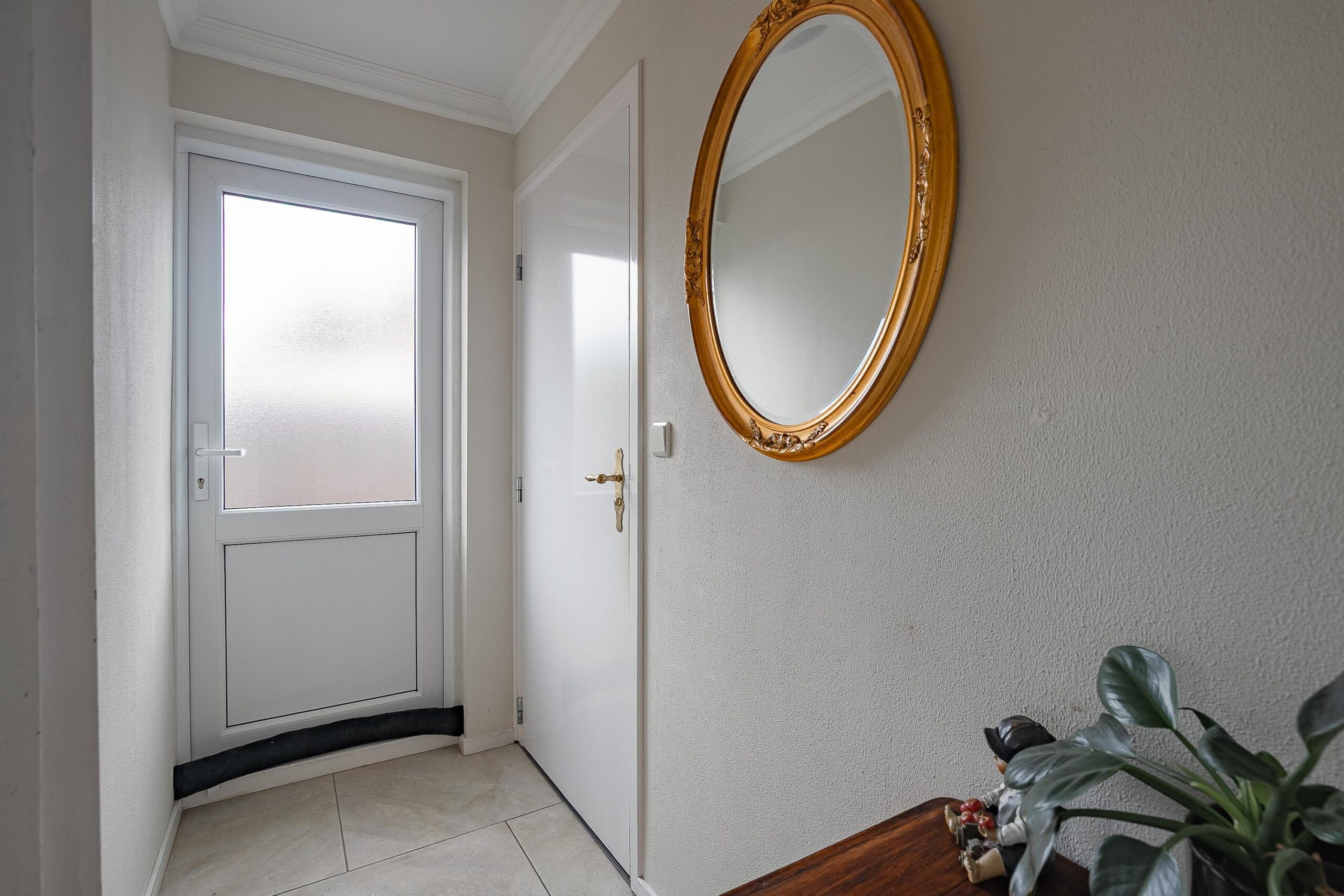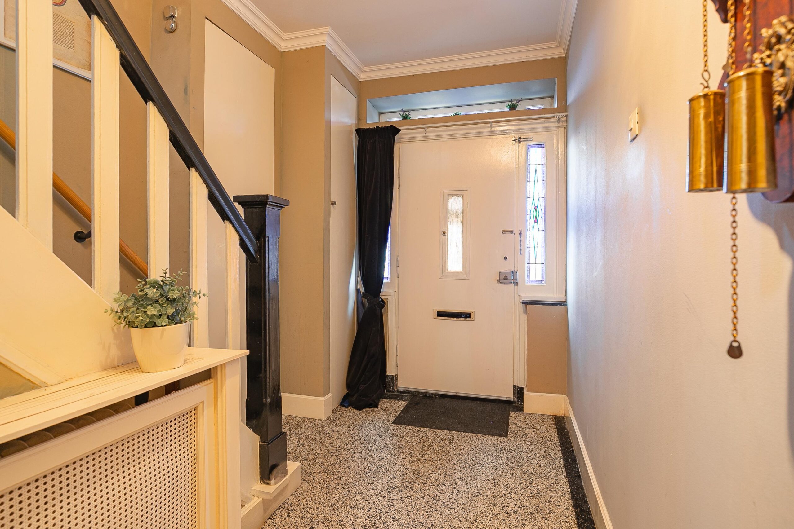 Via de overdekte entree toegang tot de hal met klassieke terrazzovloer en glas-in-loodramen. Vanuit de hal is de vaste houten trap naar de eerste verdieping bereikbaar, evenals de garderobe, meterkast, kelder en woonkamer.