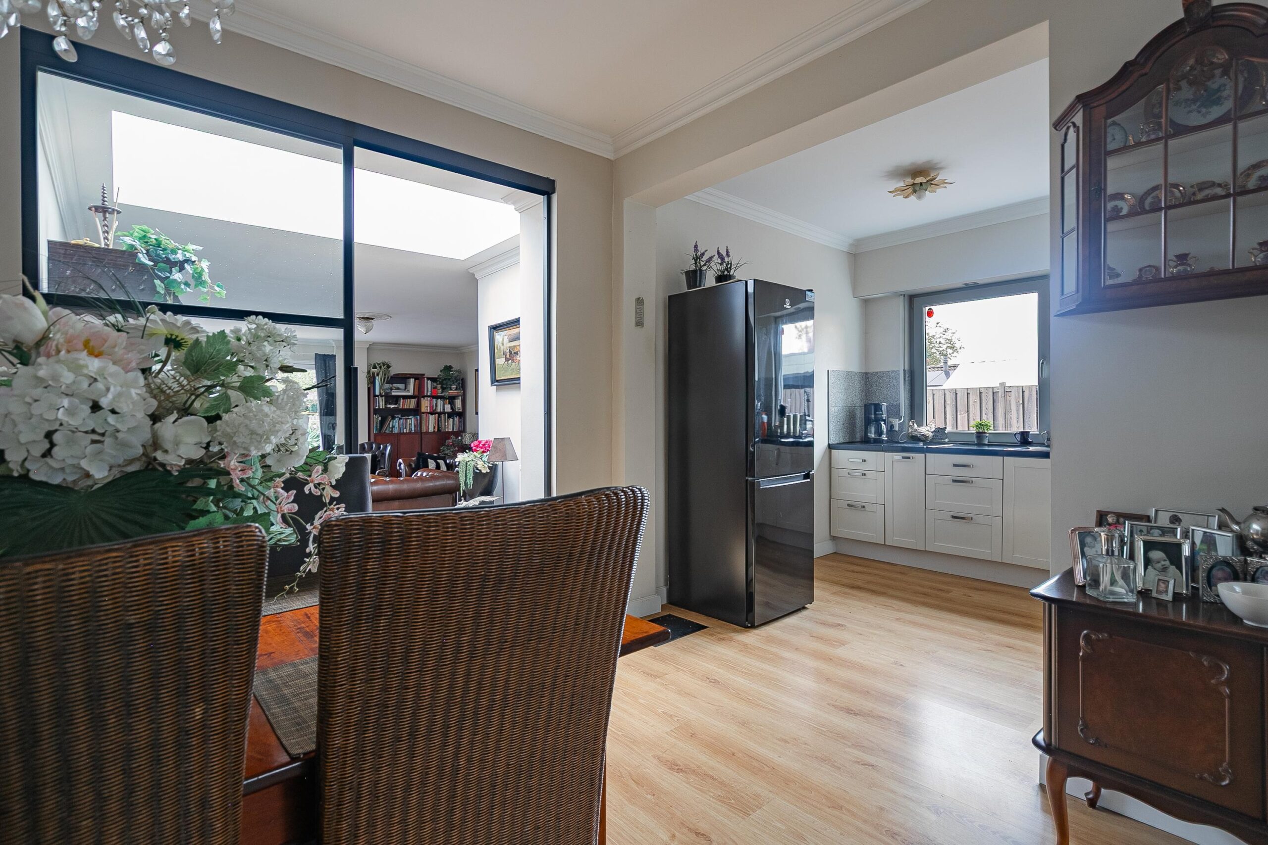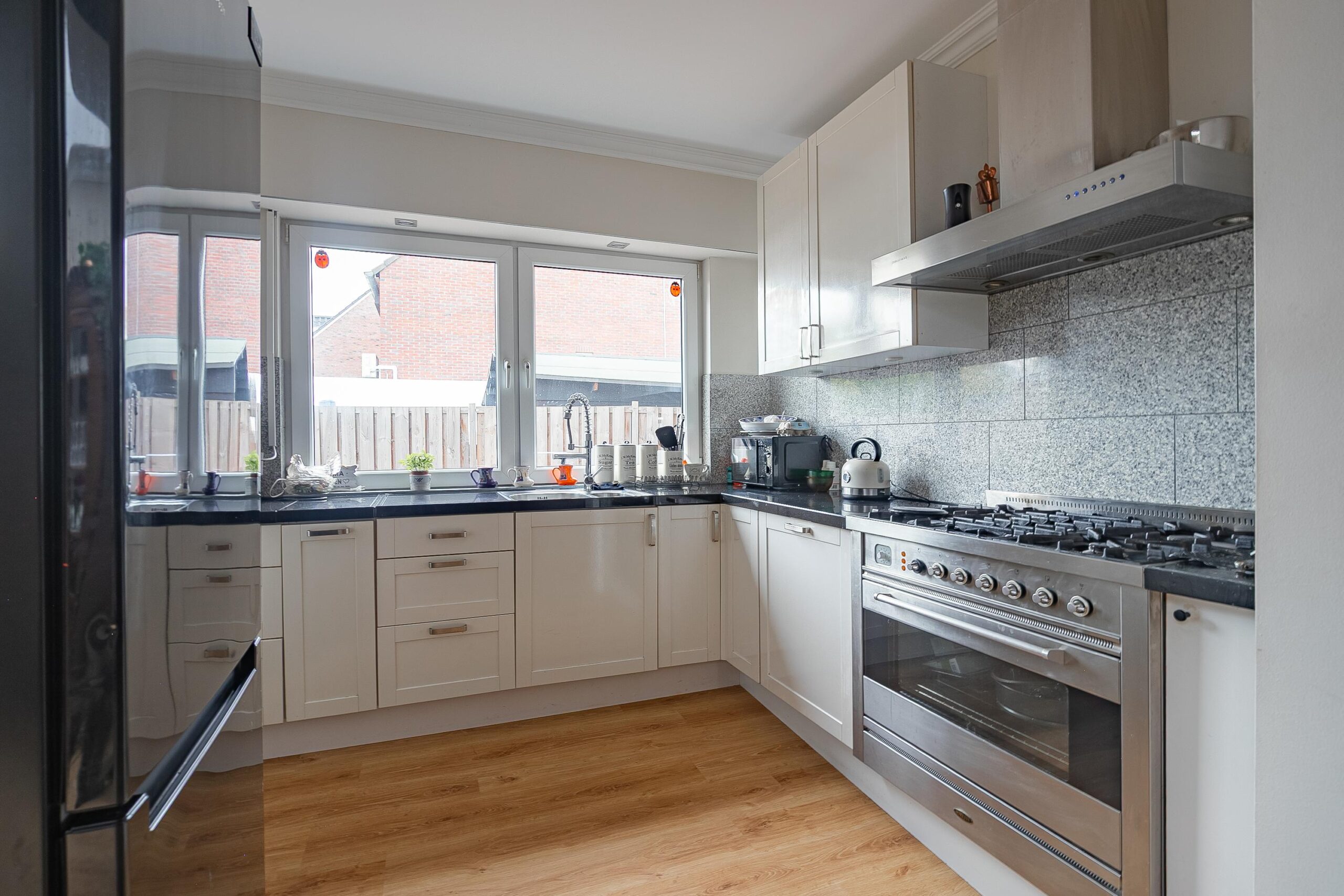 De ruime woonkamer beschikt over voldoende plaats voor een zit- en eethoek en is voorzien van een elektrische haard, gipsen plafondornamenten en laminaatvloer. De aangrenzende keuken in L-opstelling is uitgerust met een Boretti gasfornuis met oven, afzuigkap, vaatwasser en spoelbak.