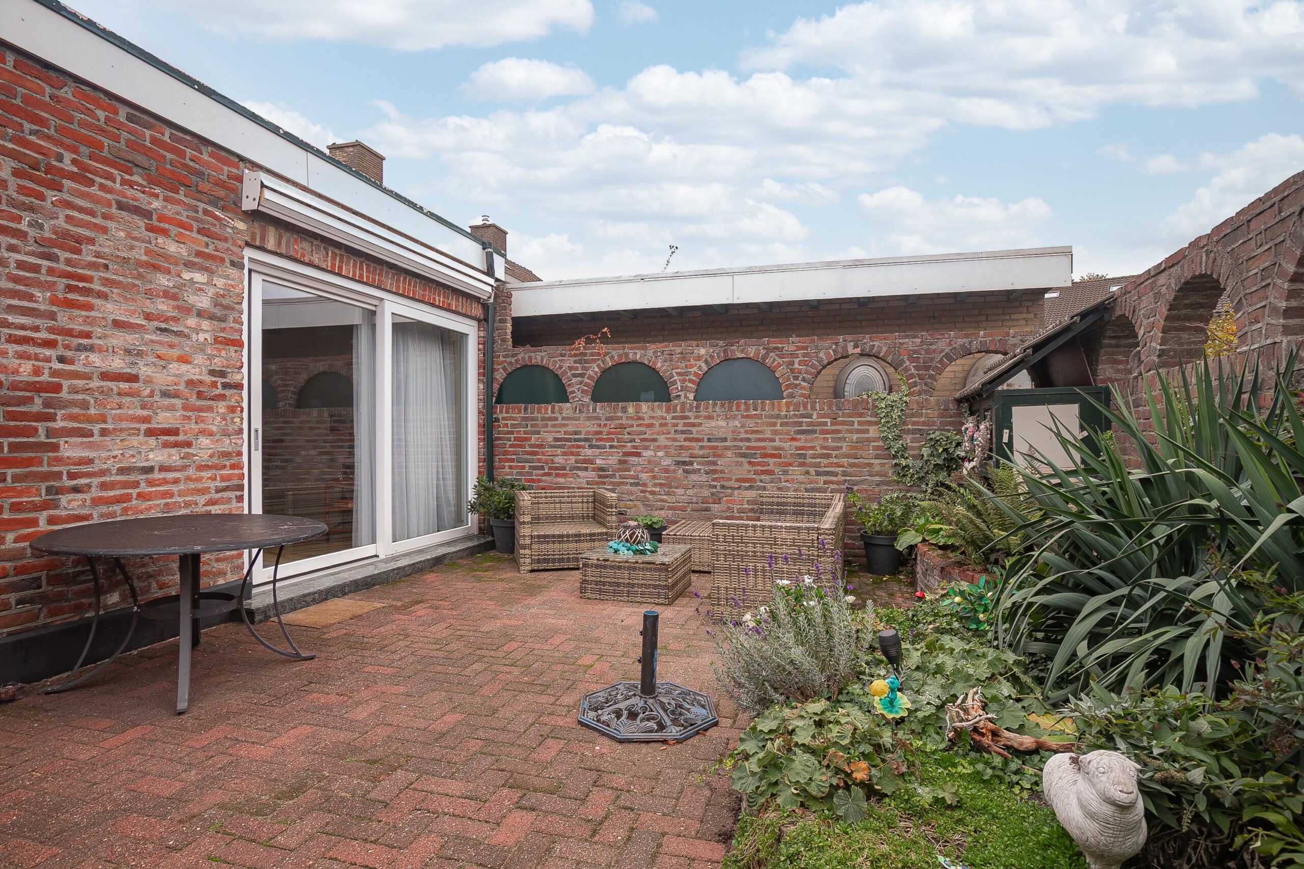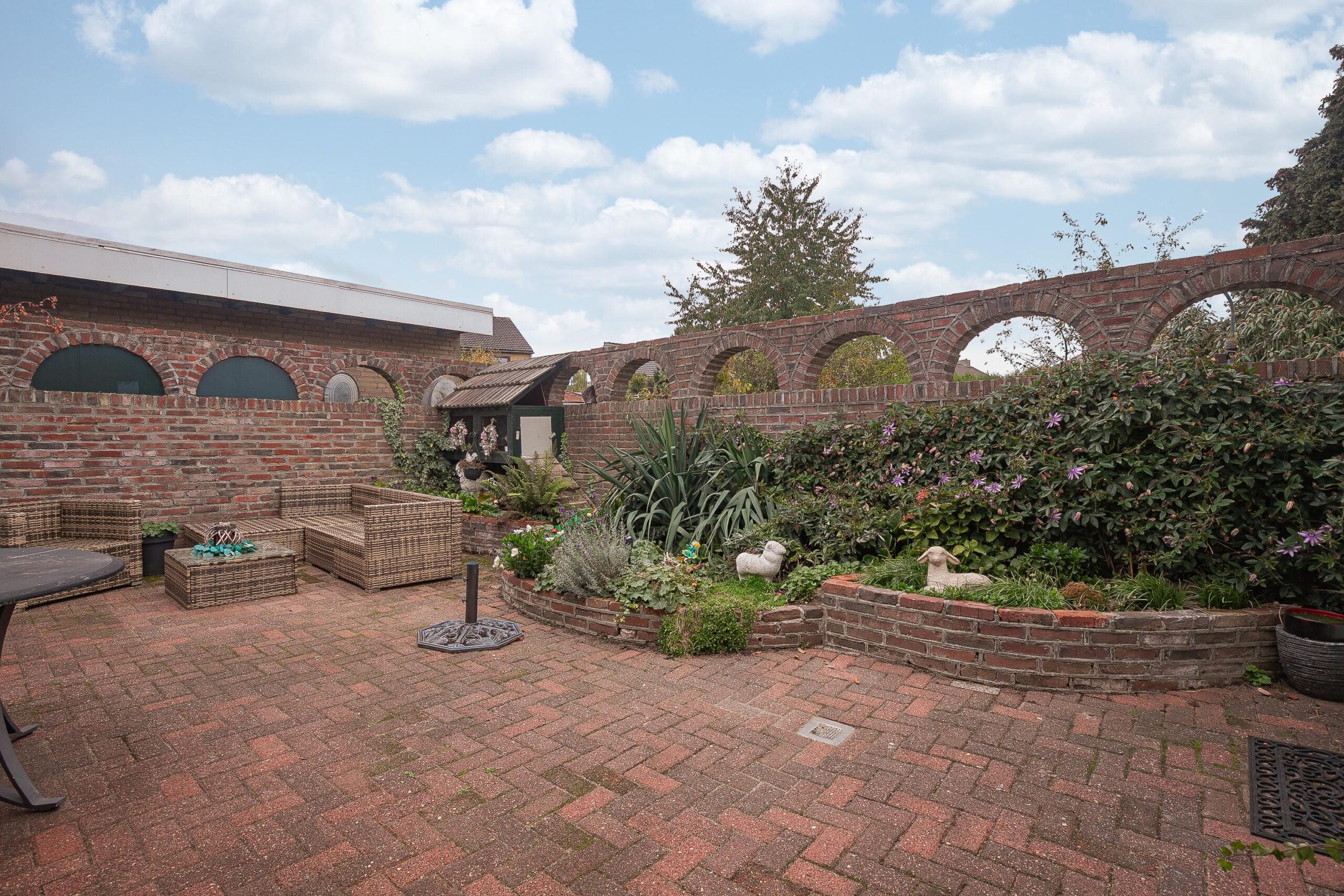 De achtertuin beschikt over een ruim terras met groene borders en een vrijstaande garage. Een fijne plek om te ontspannen of buiten te dineren.