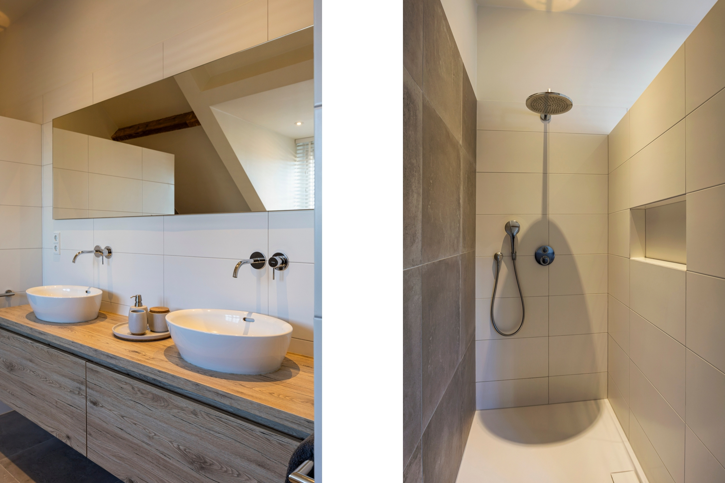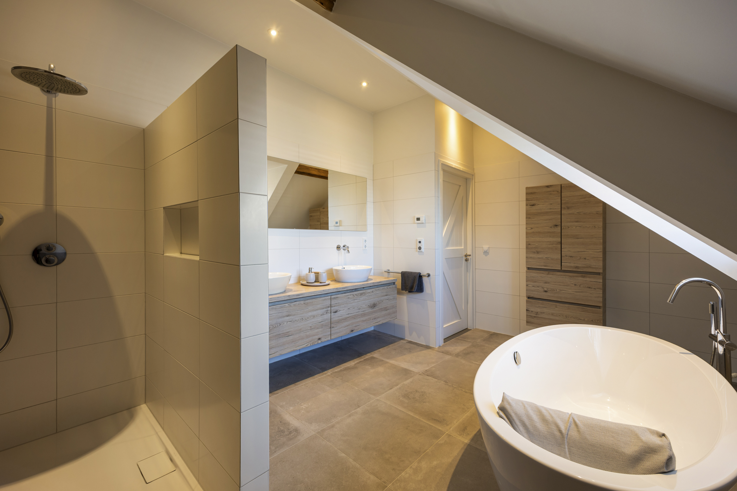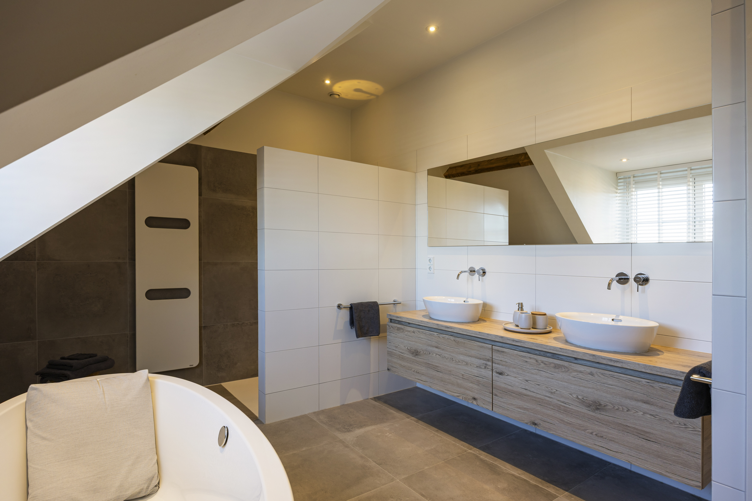 De twee badkamers zijn los van de slaapkamers gesitueerd en modern afgewerkt. De grootste badkamer is voorzien van een dubbele wastafel, een inloopdouche en een vrijstaand bad. De tweede badkamer beschikt over een inloopdouche, wastafel en toilet. Beide badkamers sluiten qua stijl en materiaalgebruik goed aan op de rest van de woning.