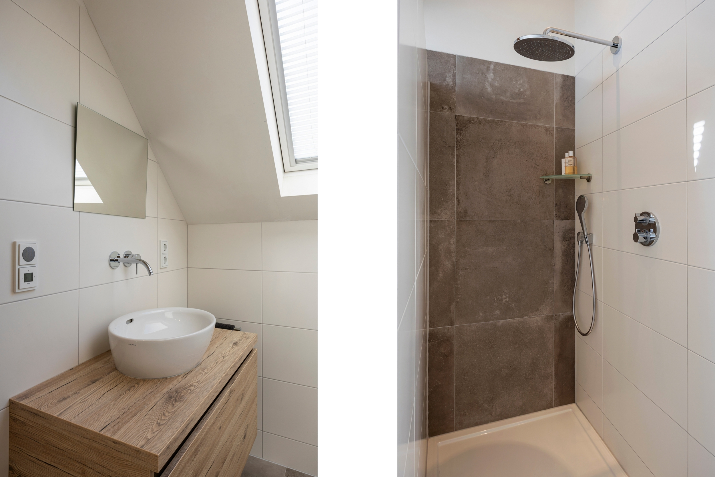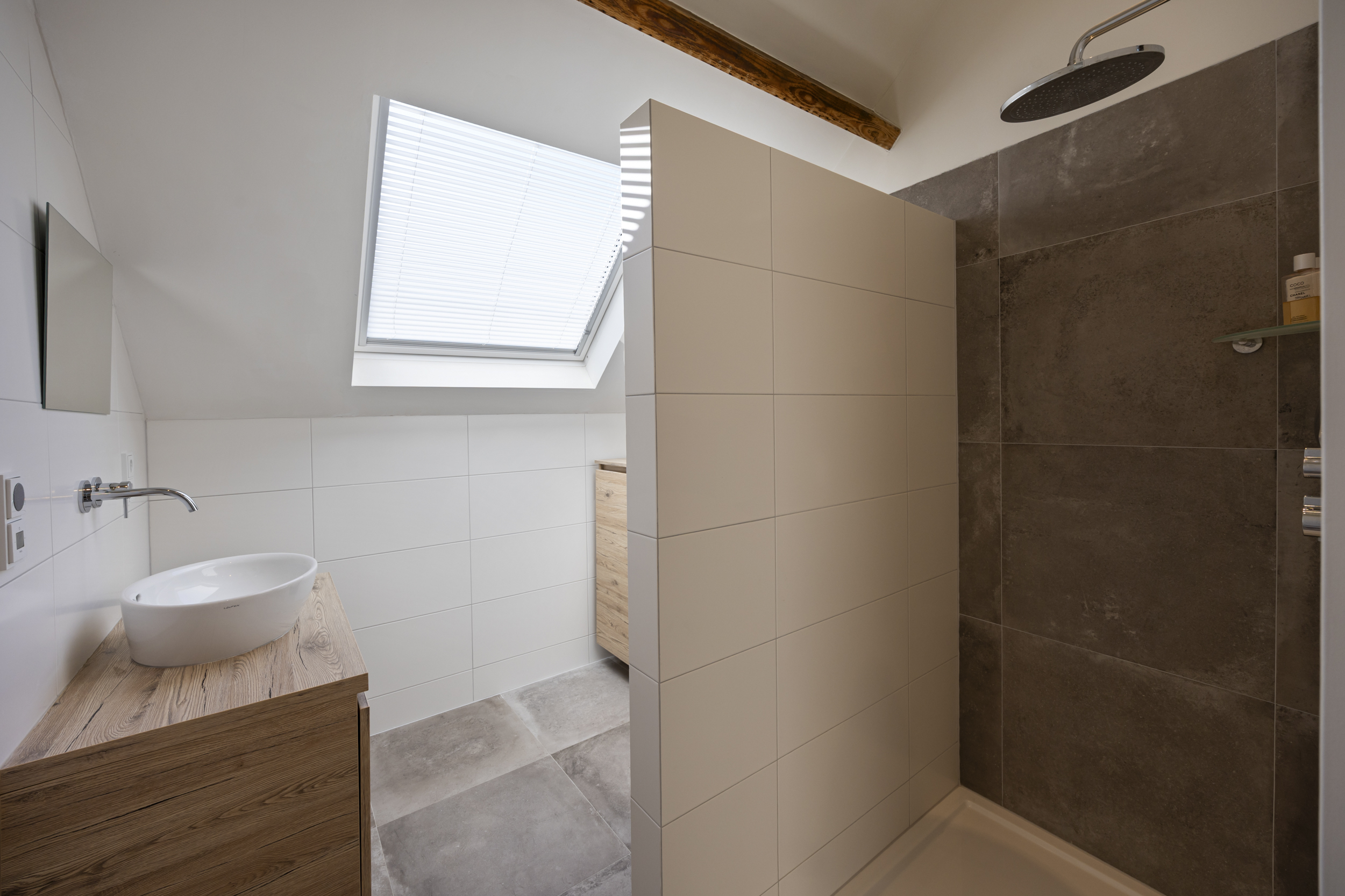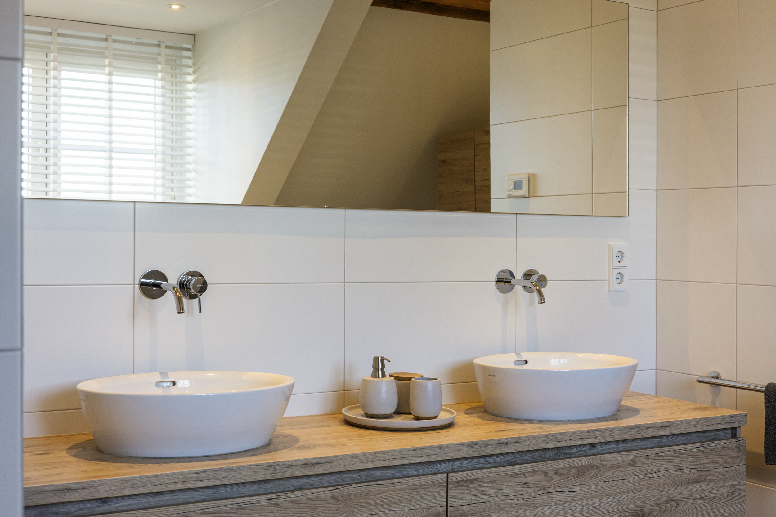 De twee badkamers zijn los van de slaapkamers gesitueerd en modern afgewerkt. De grootste badkamer is voorzien van een dubbele wastafel, een inloopdouche en een vrijstaand bad. De tweede badkamer beschikt over een inloopdouche, wastafel en toilet. Beide badkamers sluiten qua stijl en materiaalgebruik goed aan op de rest van de woning.