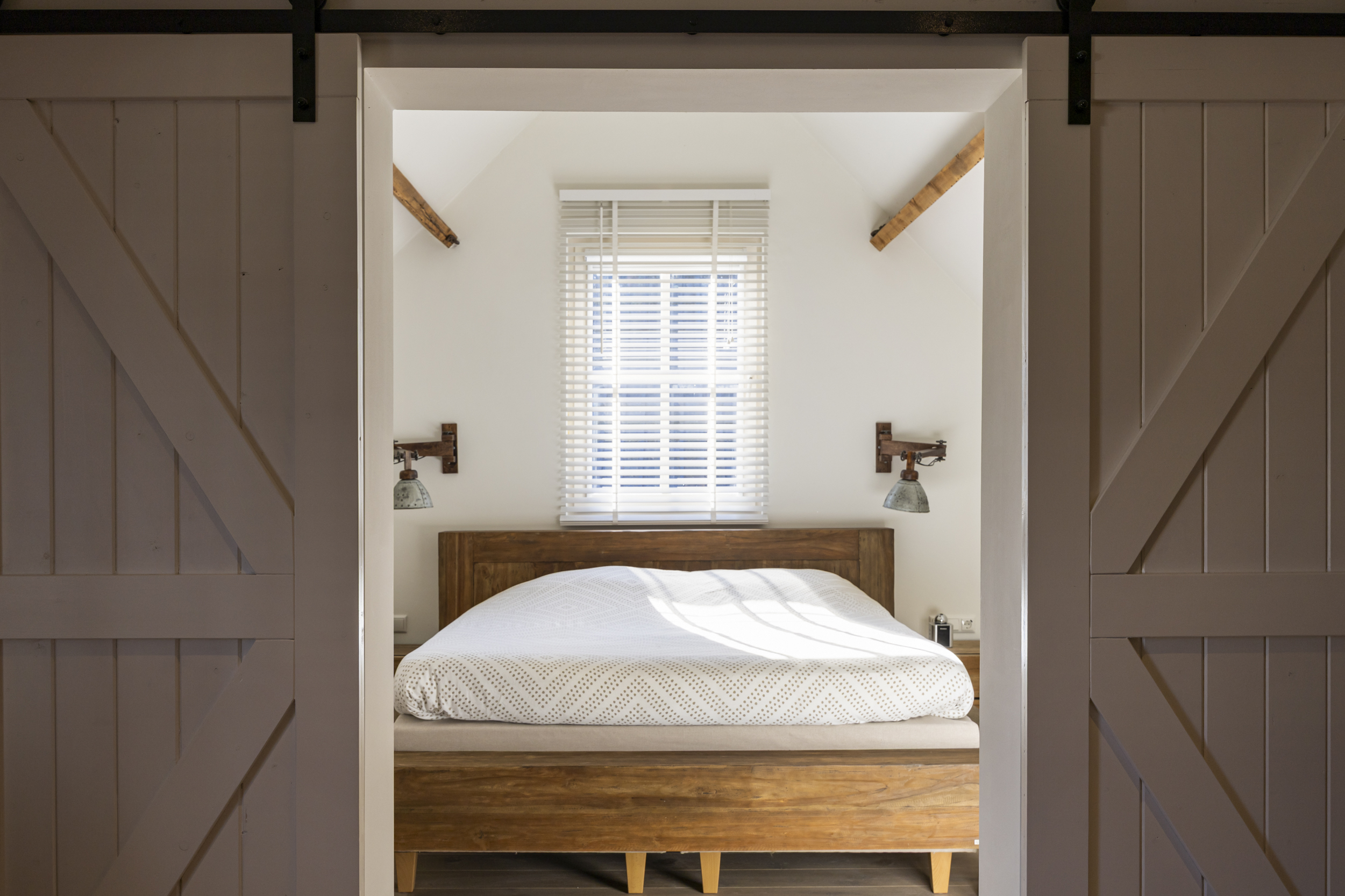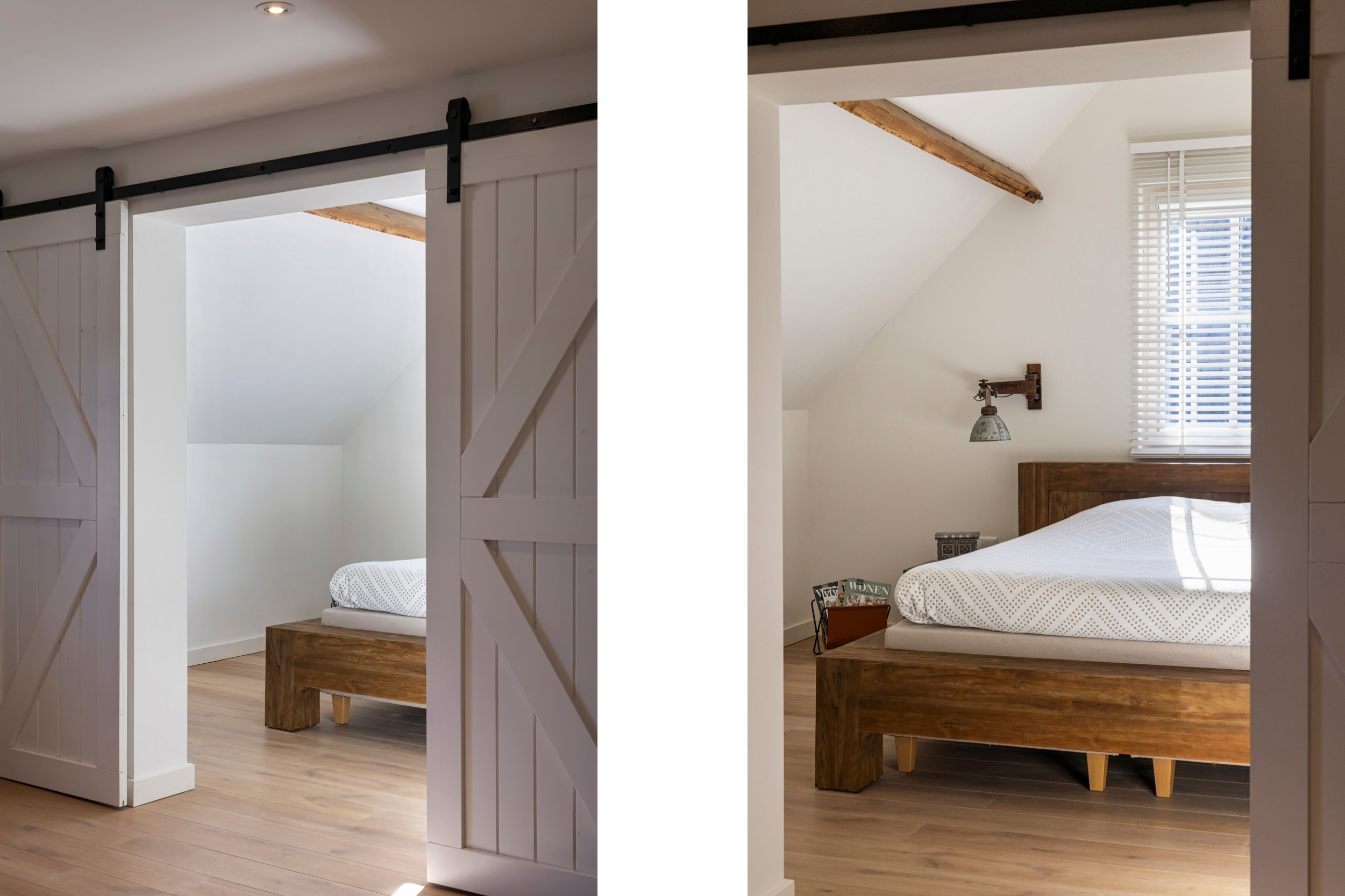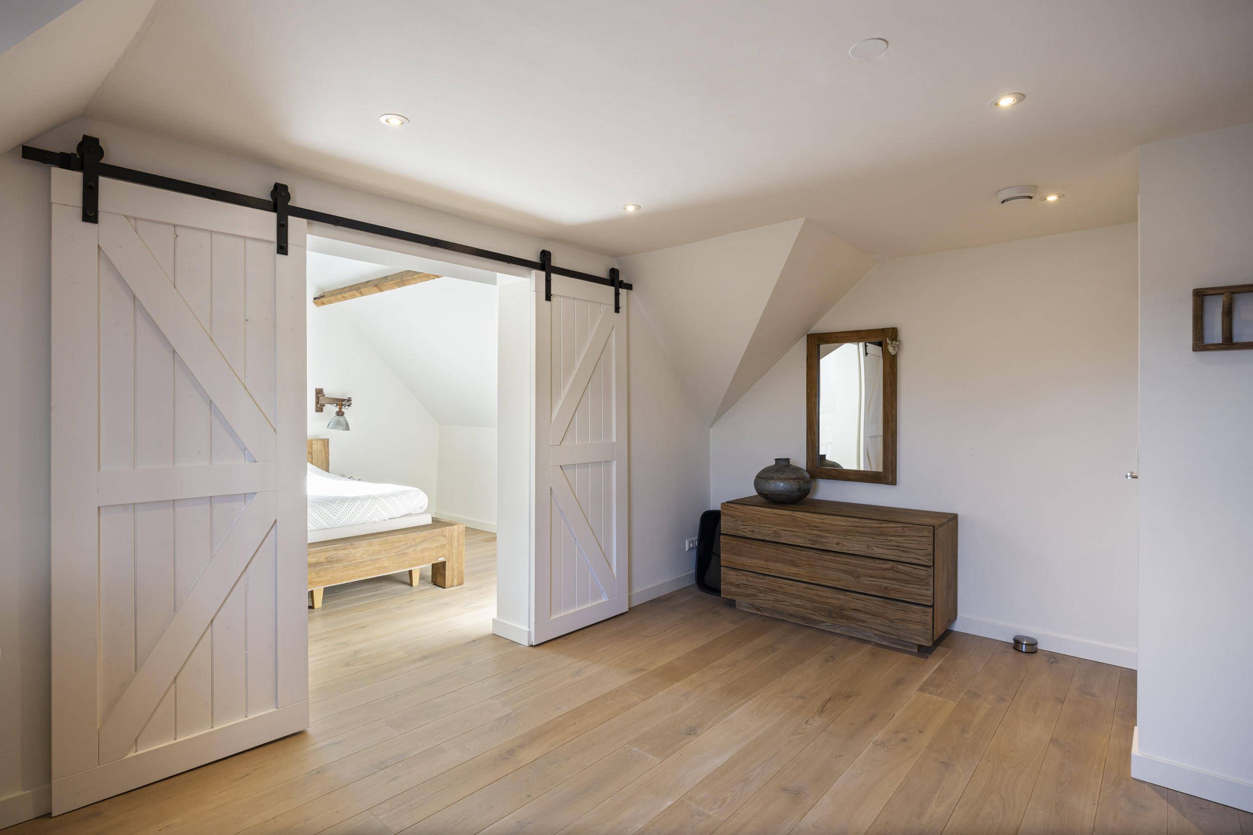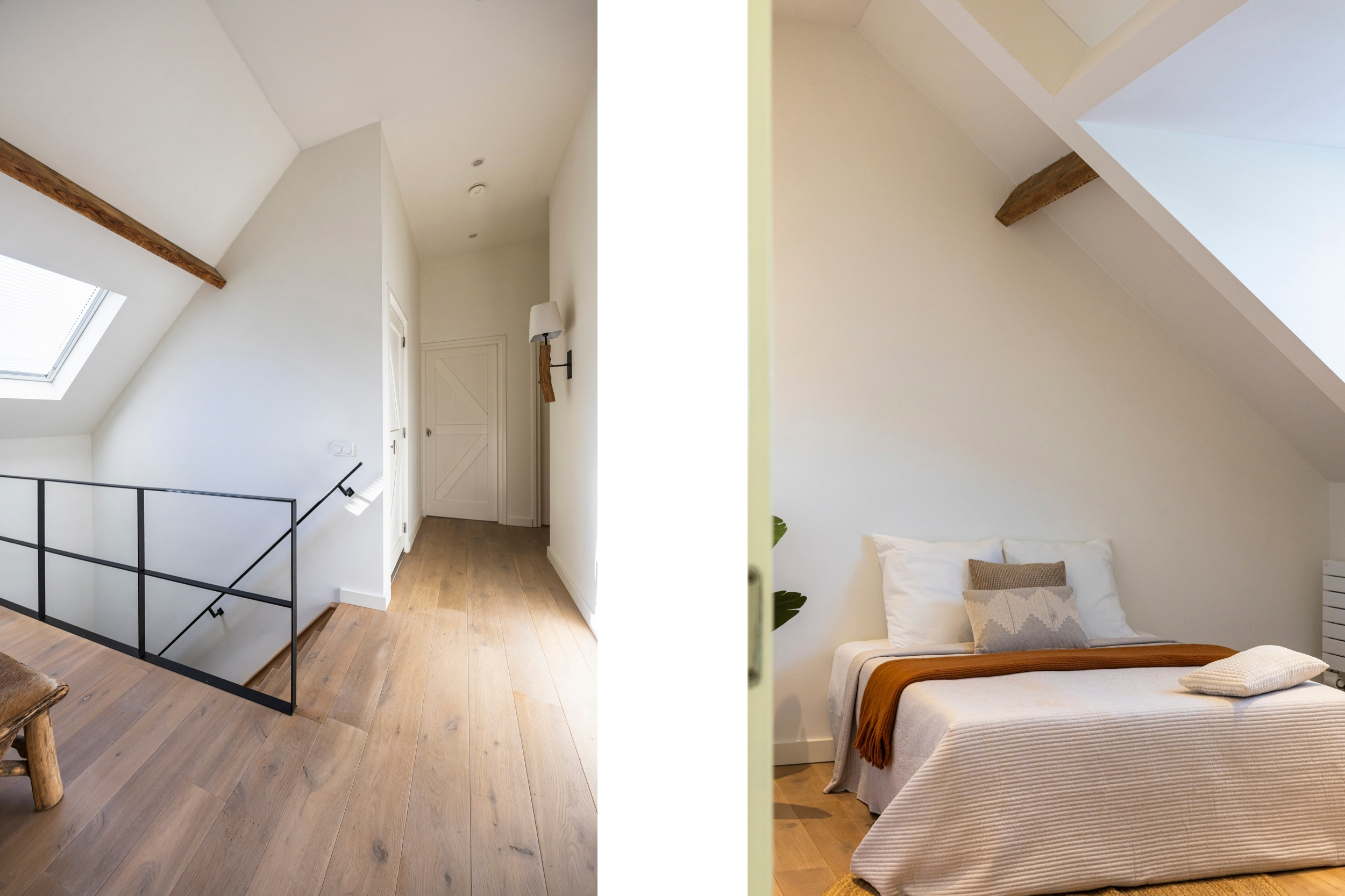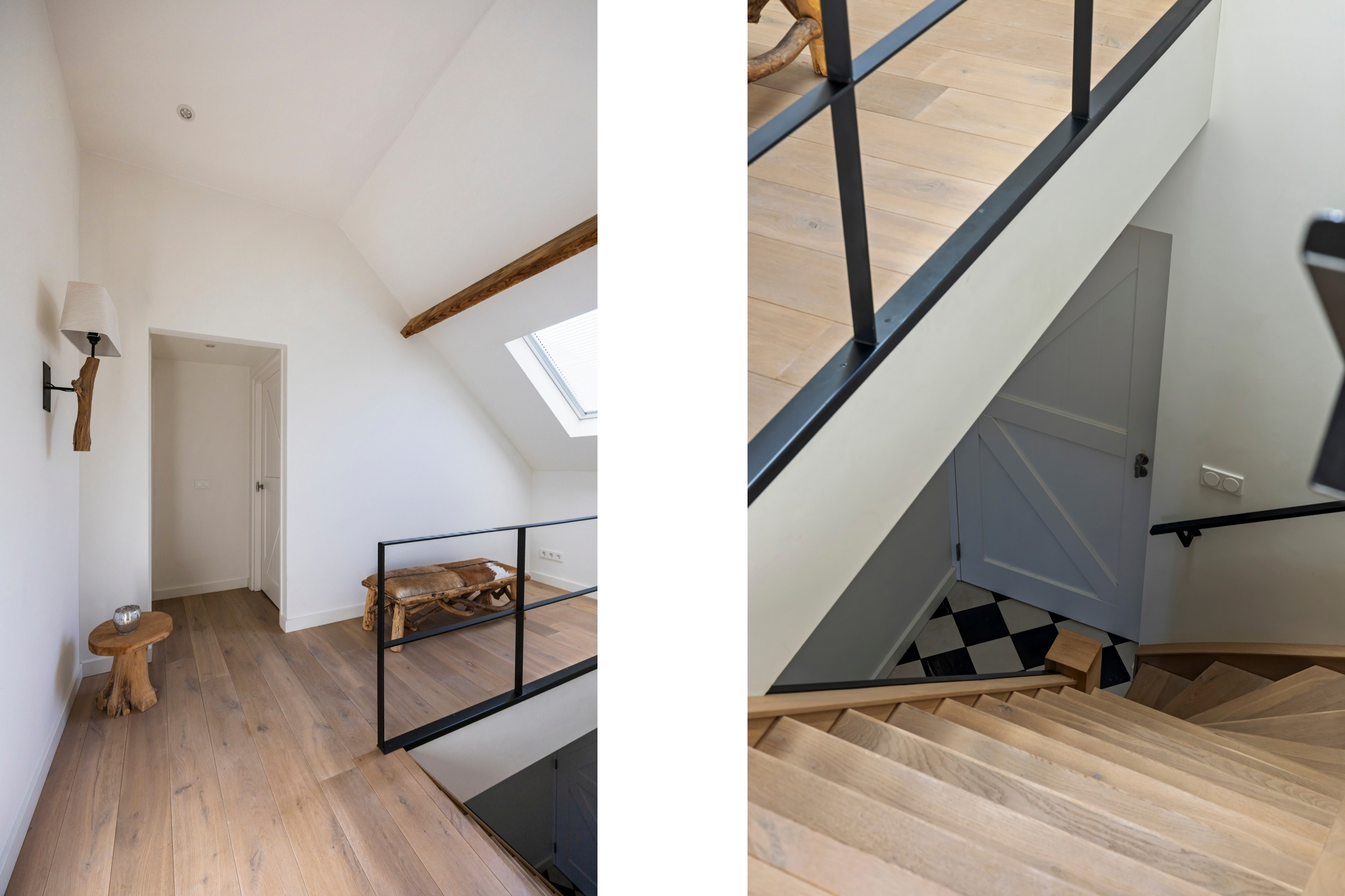 Op de eerste verdieping is de moderne boerderijstijl consequent doorgezet. De zichtbare houten balken vormen hier opnieuw een mooi contrast met de strakke, lichte wanden en de warme houten vloer. Dit zorgt voor een rustige en samenhangende uitstraling op de hele verdieping.