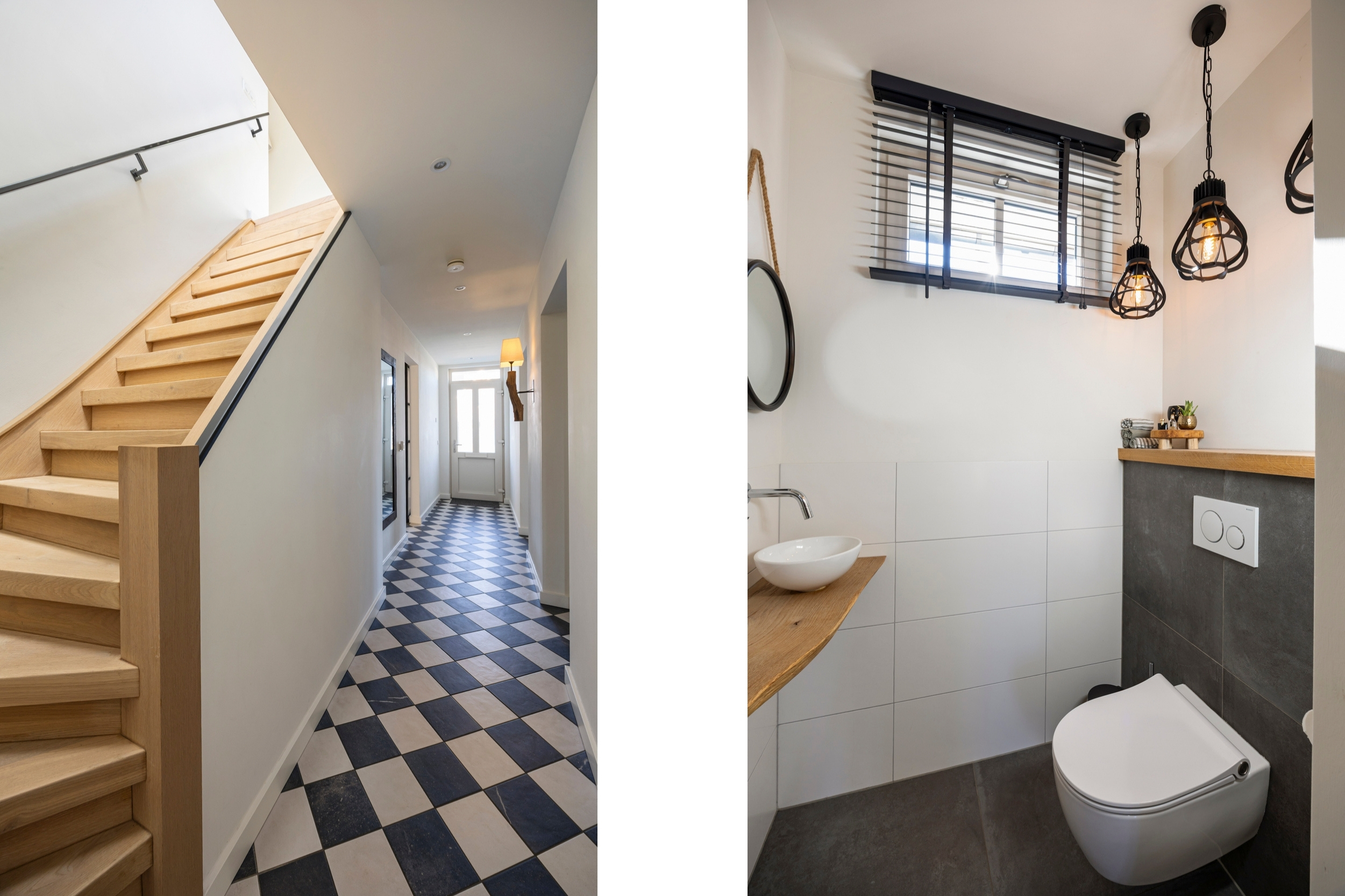Het gastentoilet is modern en netjes uitgevoerd. In de bijkeuken is gekozen voor een speels contrast met een zwart-witte tegelvloer, wat de ruimte een eigen karakter geeft zonder afbreuk te doen aan het geheel. De bijkeuken is praktisch ingericht met een wastafel en keukenblok, witgoedaansluitingen en een kastenwand.