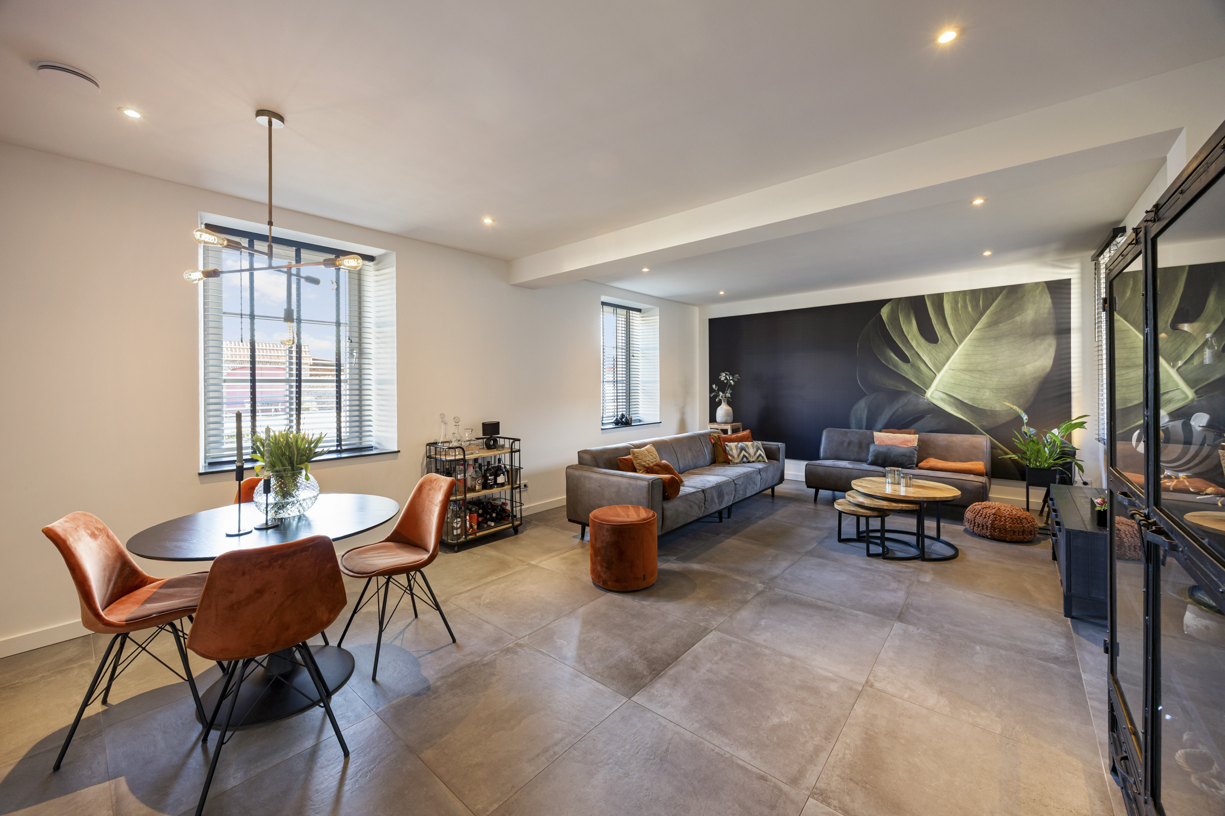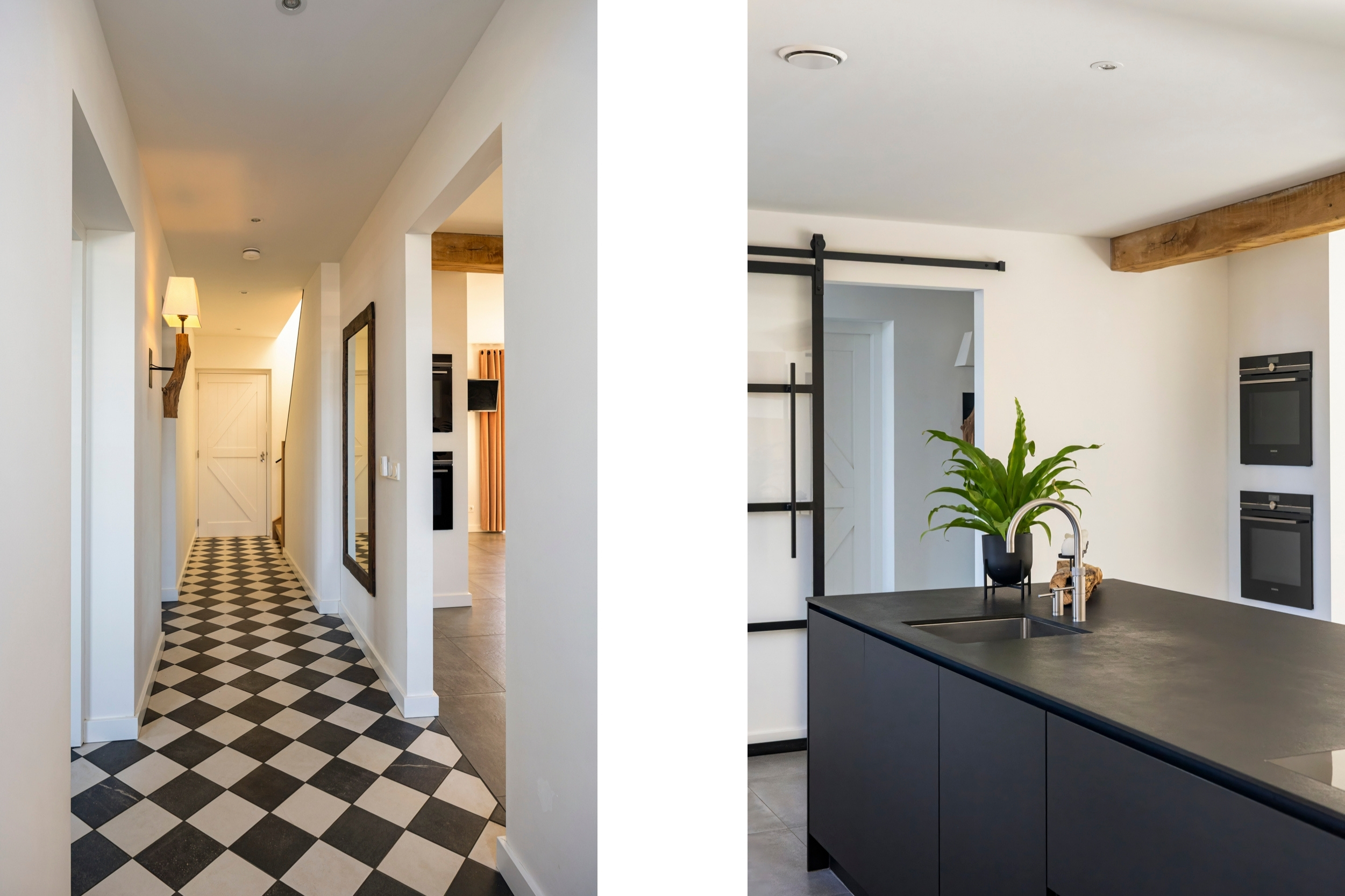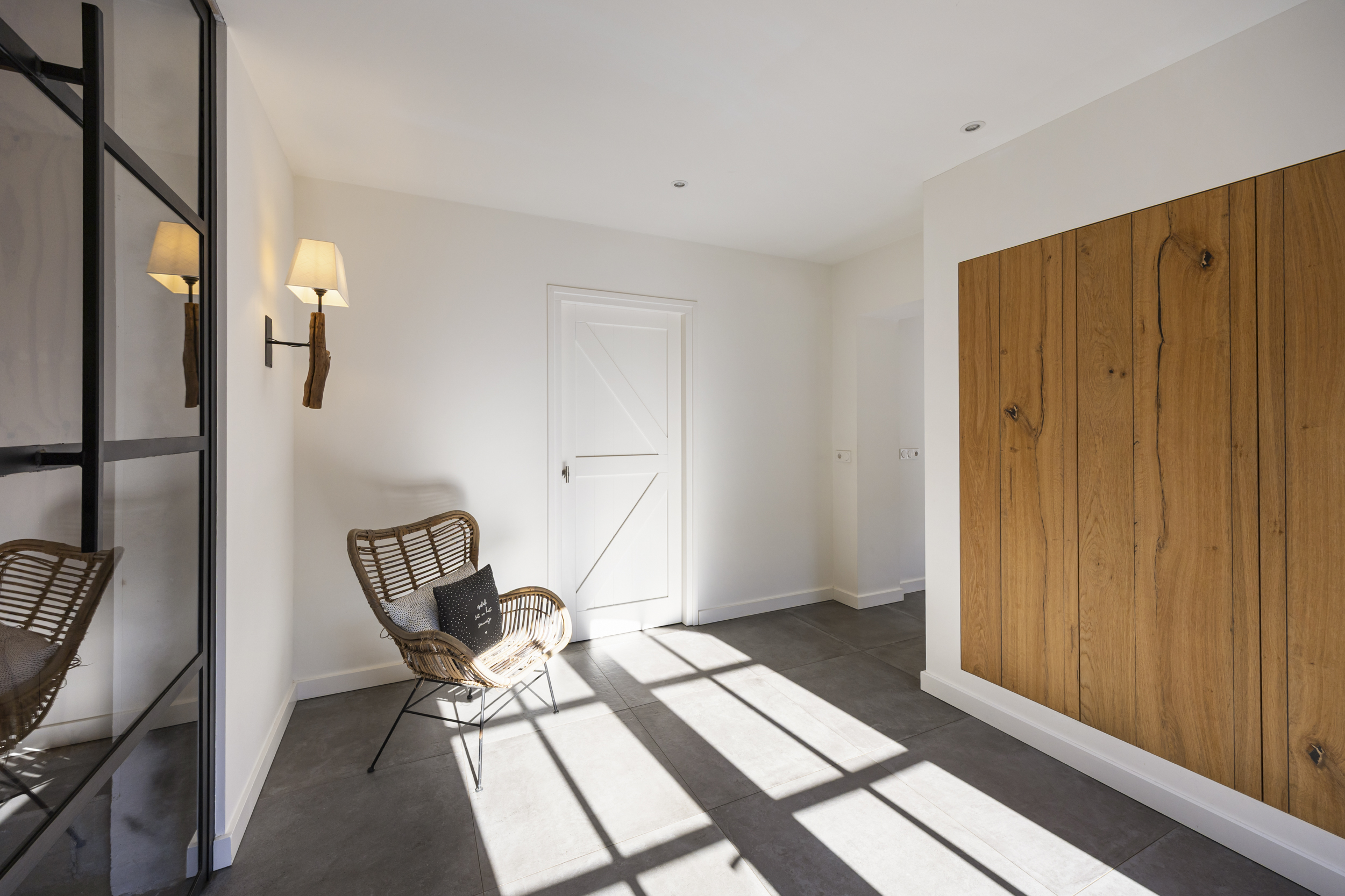 Bij binnenkomst (via de binnenplaats) in de hal valt direct de strakke en verzorgde afwerking op. De donkere tegelvloer vormt een rustige basis en loopt mooi door in de rest van de leefruimtes. In combinatie met de lichte, strak gestucte wanden en de houten accenten ontstaat er een warme, eigentijdse uitstraling. De ruime garderobekast is netjes weggewerkt en draagt bij aan het opgeruimde geheel.