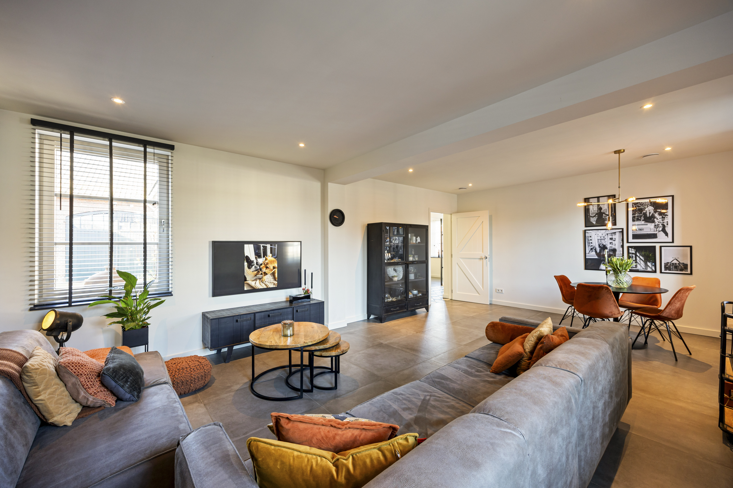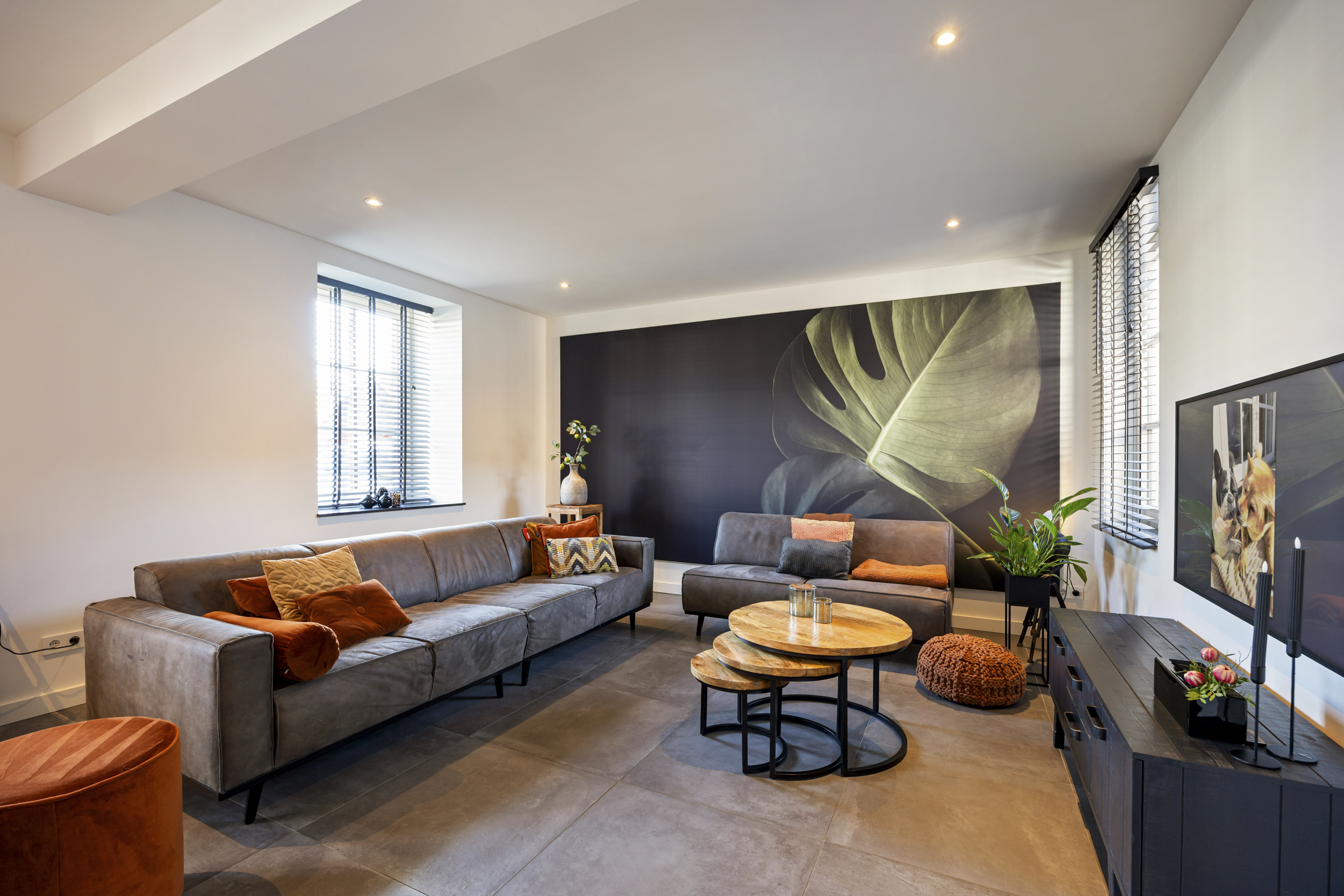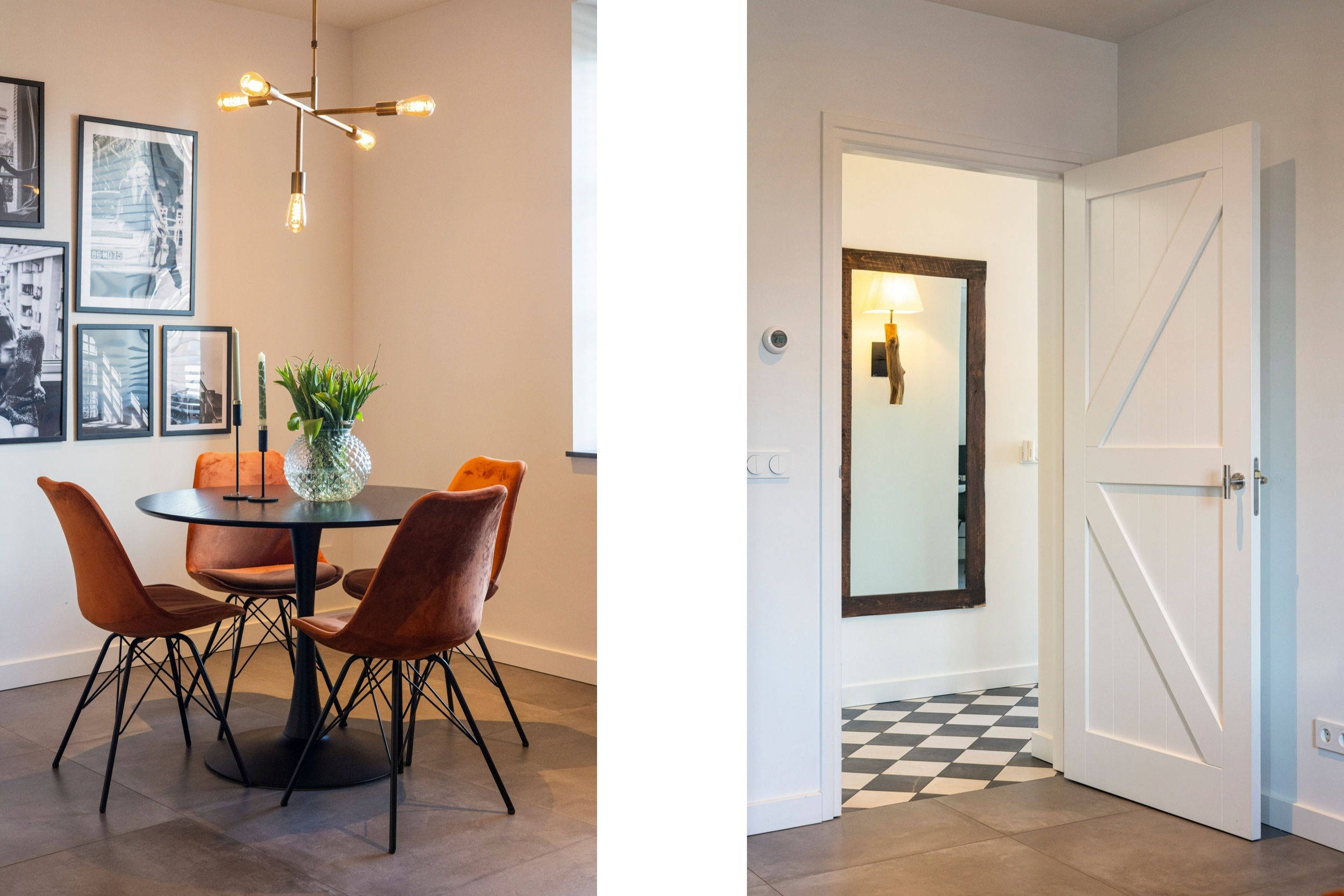 Bij binnenkomst (via de binnenplaats) in de hal valt direct de strakke en verzorgde afwerking op. De donkere tegelvloer vormt een rustige basis en loopt mooi door in de rest van de leefruimtes. In combinatie met de lichte, strak gestucte wanden en de houten accenten ontstaat er een warme, eigentijdse uitstraling. De ruime garderobekast is netjes weggewerkt en draagt bij aan het opgeruimde geheel.