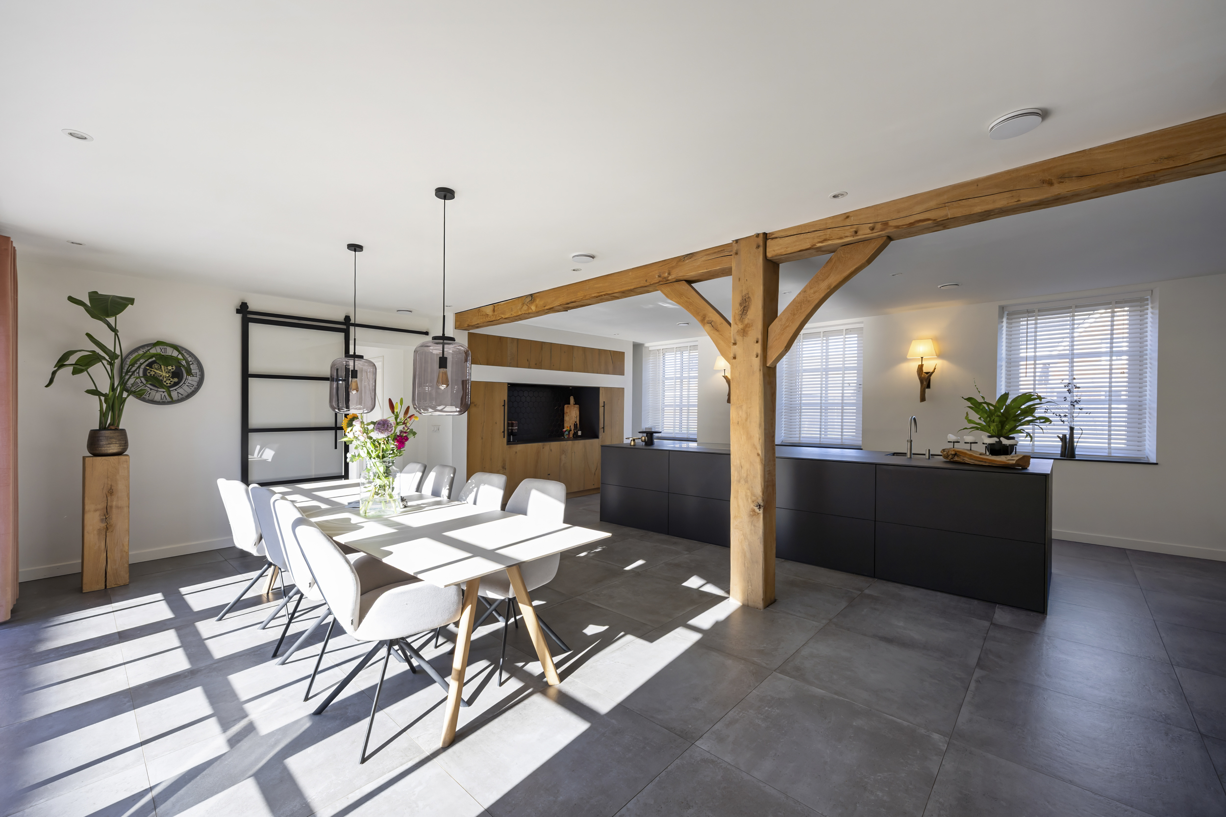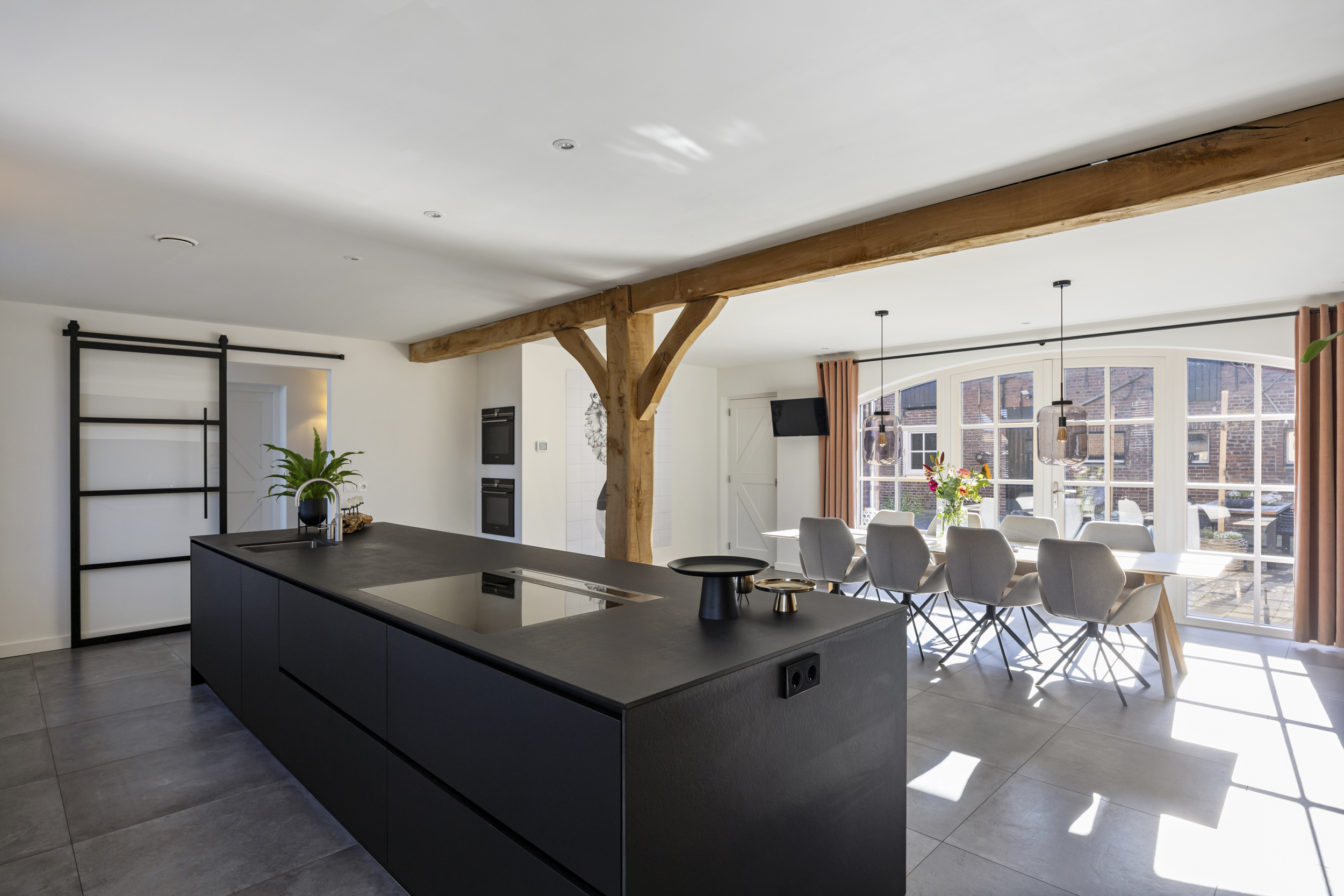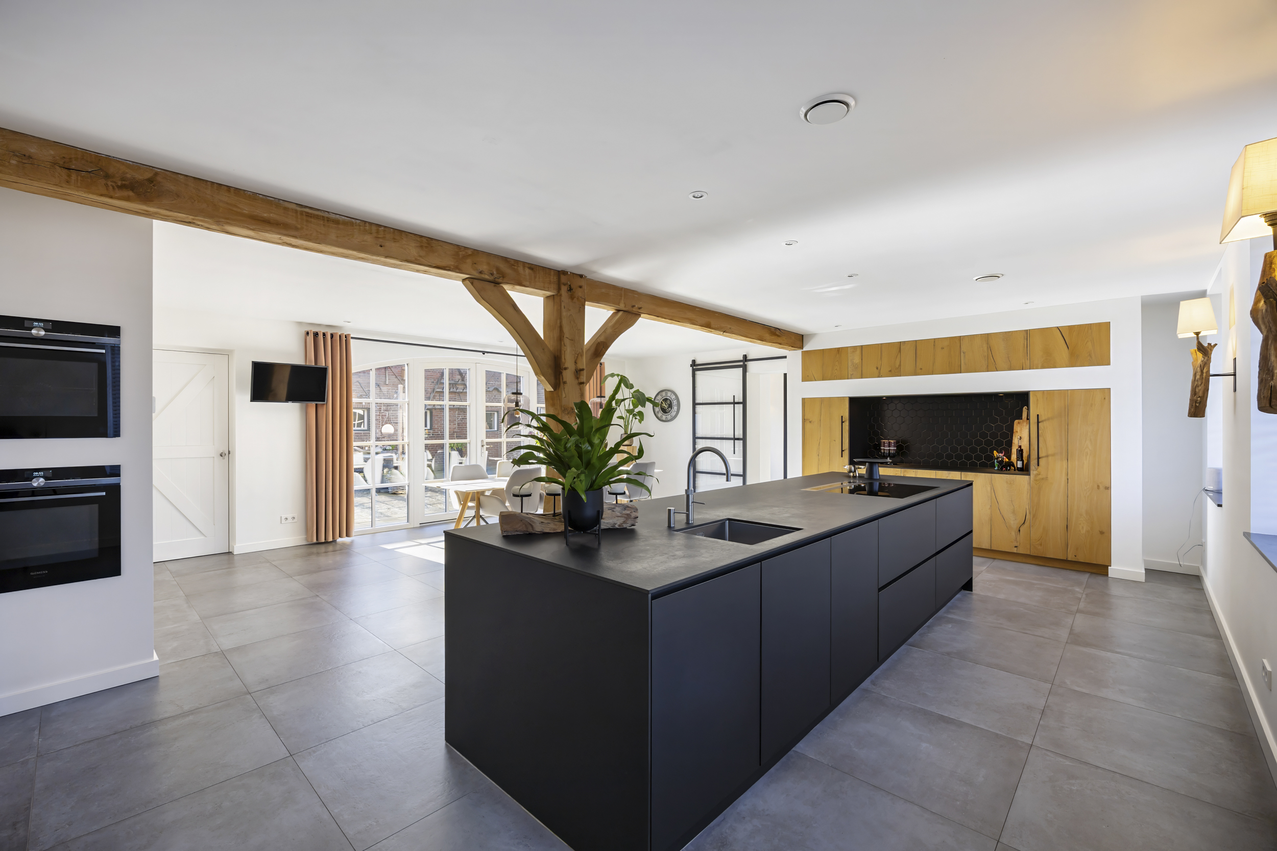 De leef keuken is het centrale punt van de woning en laat goed zien hoe de moderne boerderijstijl hier is doorgevoerd. Met een oppervlakte van circa 55 m² is het een royale ruimte waarin koken en leven samenkomen. Het grote kookeiland en de kastenwand met koffie nis zorgen voor een strakke, moderne uitstraling, terwijl de zichtbare houten balken juist warmte en karakter toevoegen. De combinatie van materialen maakt deze ruimte bijzonder in balans. Dankzij de grote raampartijen en openslaande deuren naar de binnenplaats is er veel daglicht en een prettige verbinding met buiten.