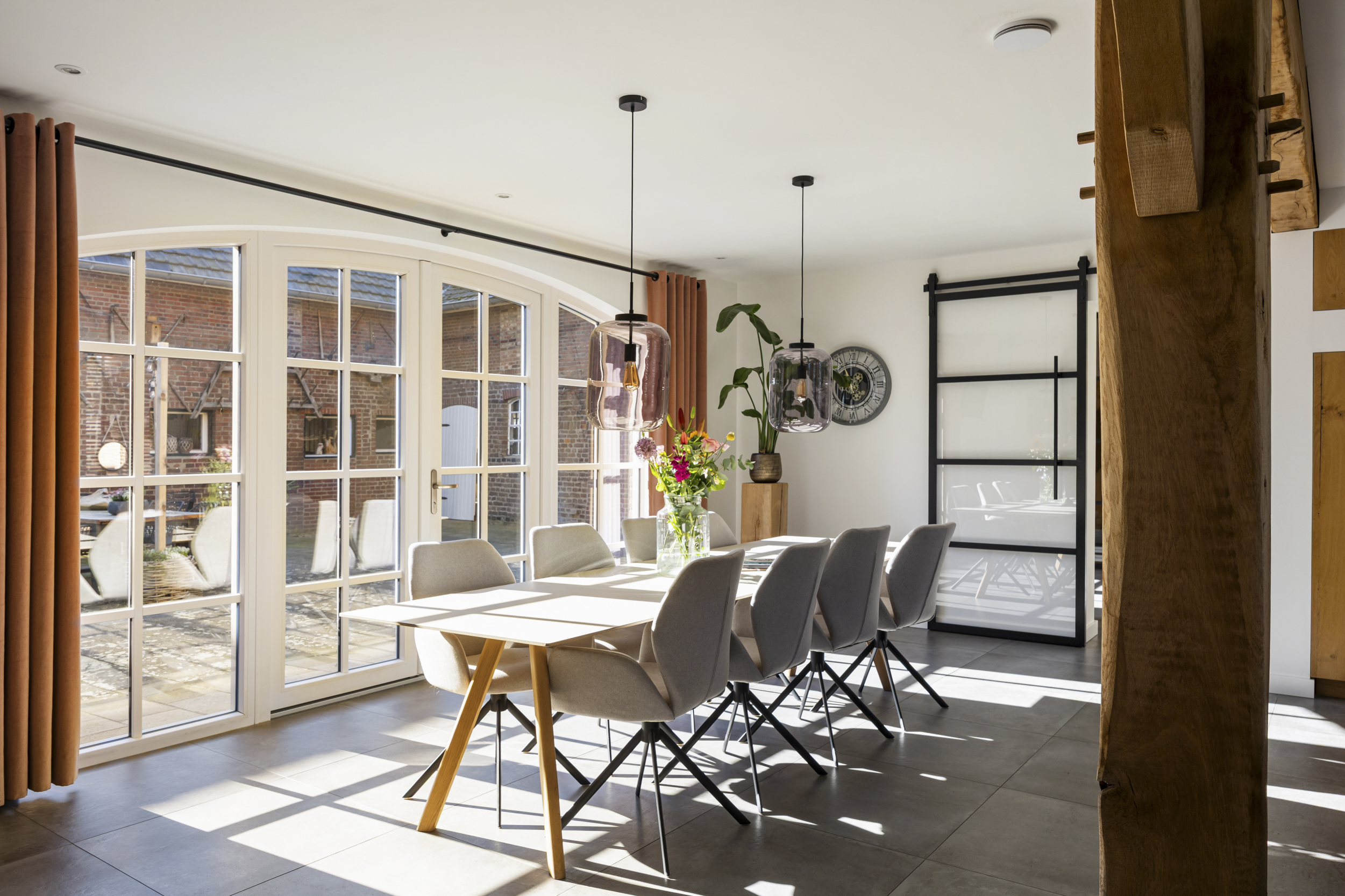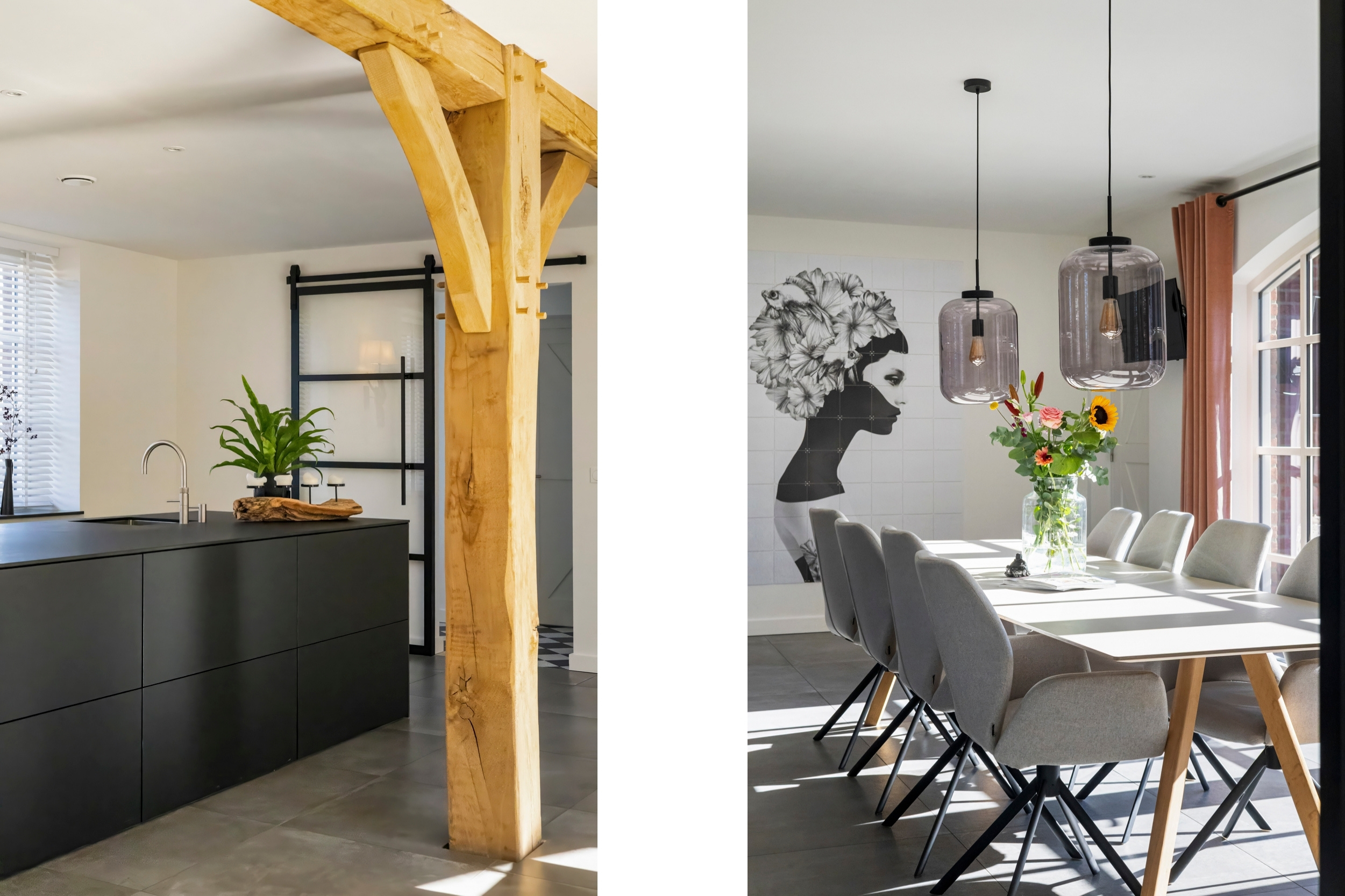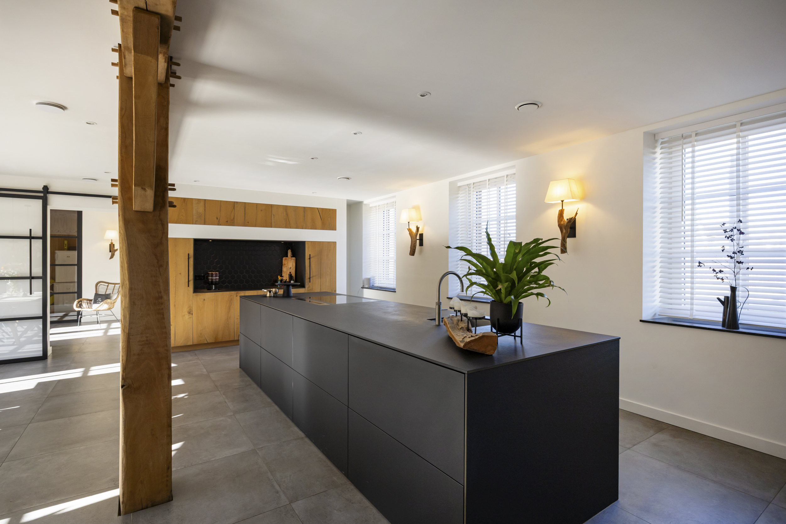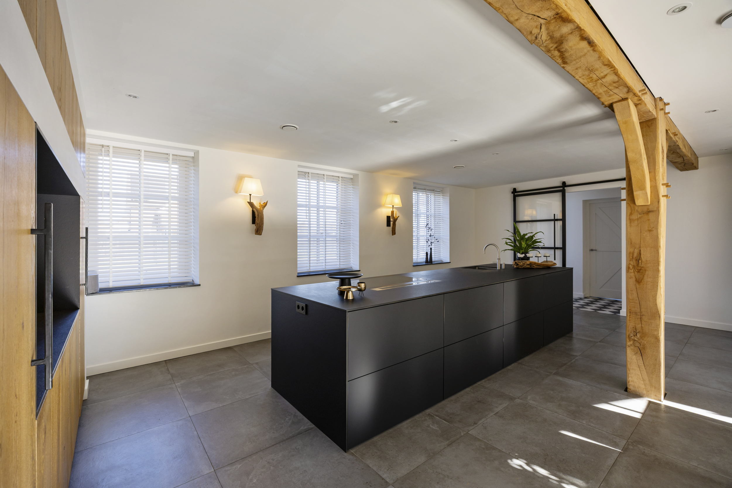 De leef keuken is het centrale punt van de woning en laat goed zien hoe de moderne boerderijstijl hier is doorgevoerd. Met een oppervlakte van circa 55 m² is het een royale ruimte waarin koken en leven samenkomen. Het grote kookeiland en de kastenwand met koffie nis zorgen voor een strakke, moderne uitstraling, terwijl de zichtbare houten balken juist warmte en karakter toevoegen. De combinatie van materialen maakt deze ruimte bijzonder in balans. Dankzij de grote raampartijen en openslaande deuren naar de binnenplaats is er veel daglicht en een prettige verbinding met buiten.