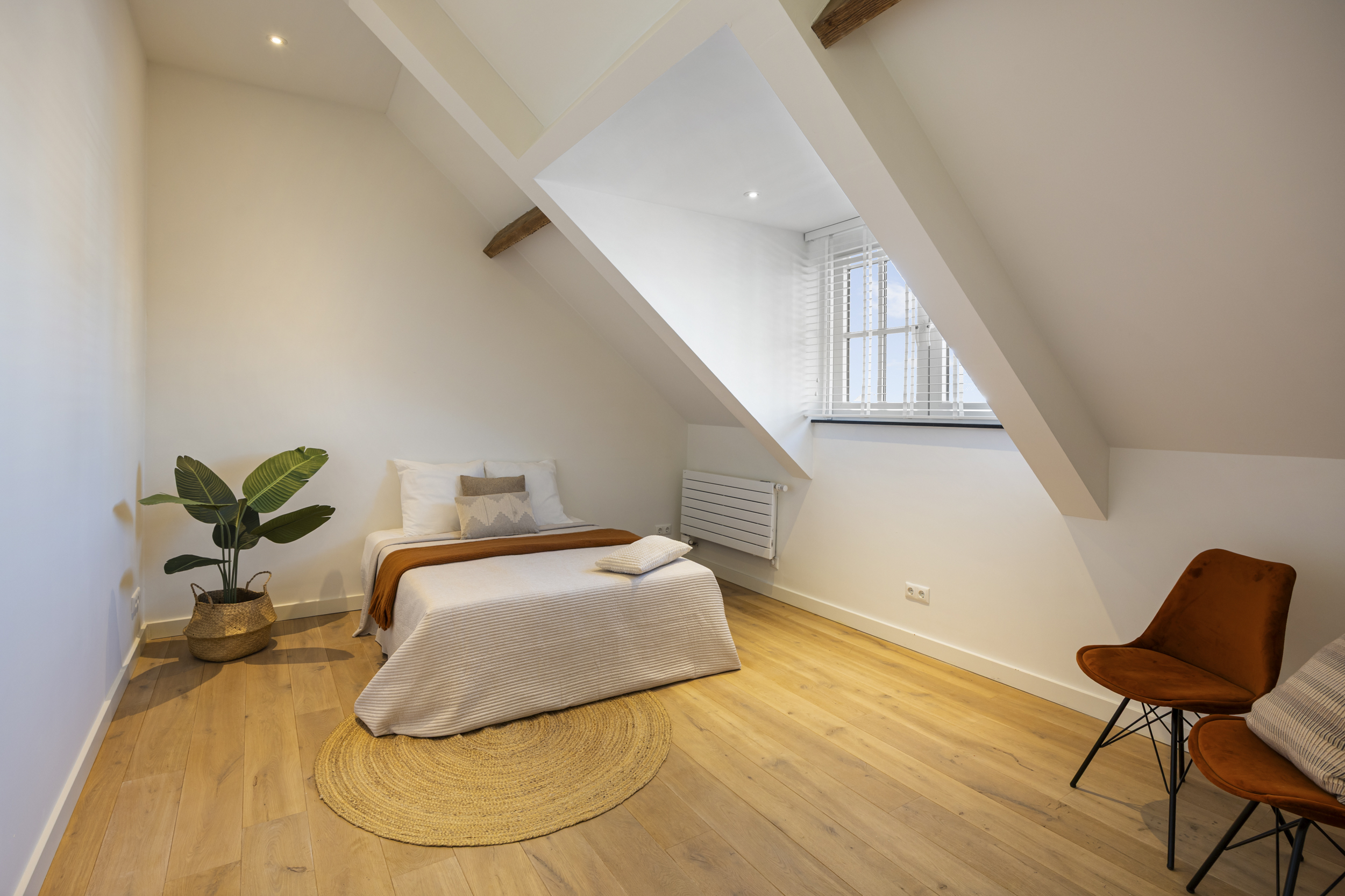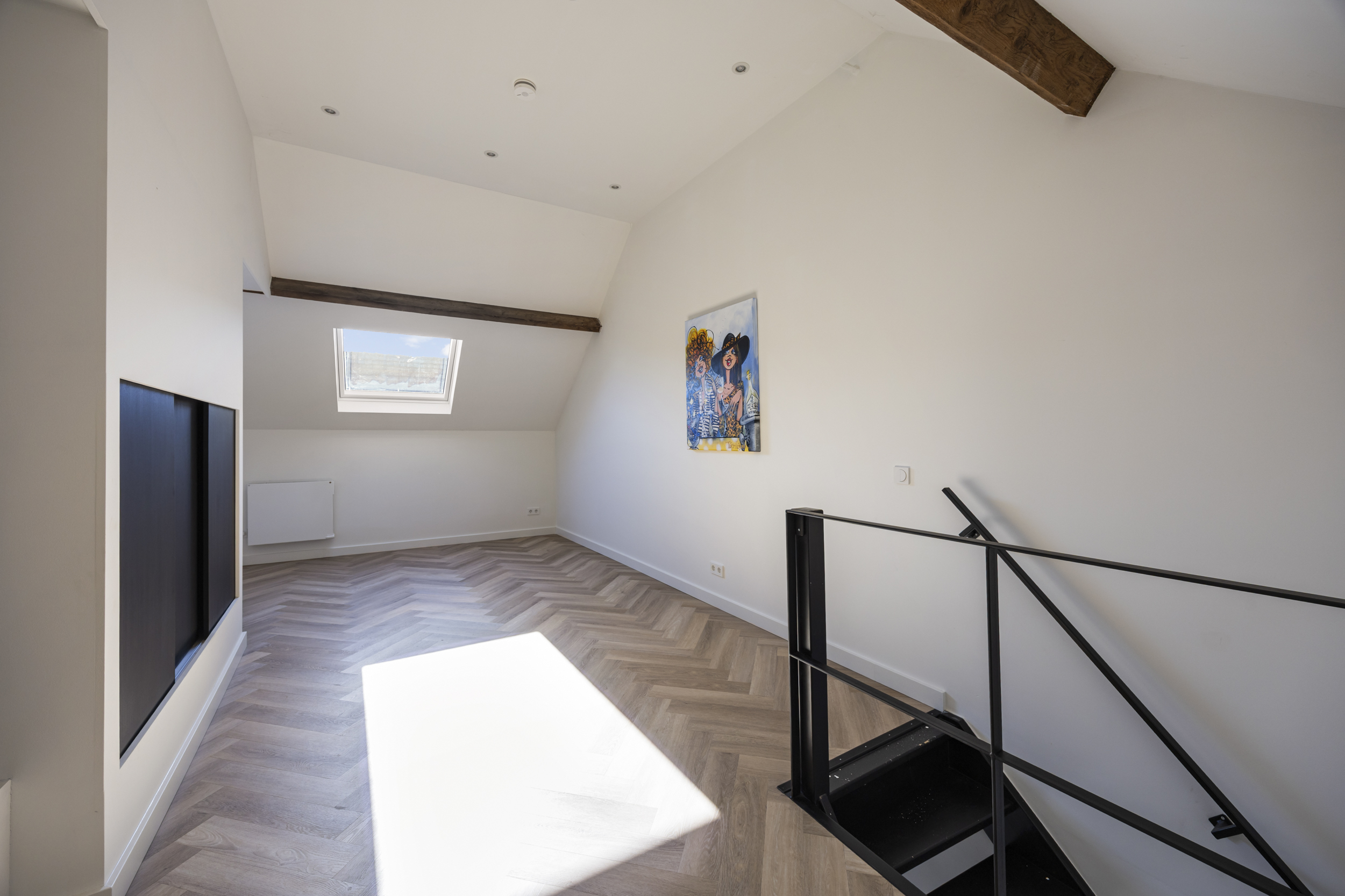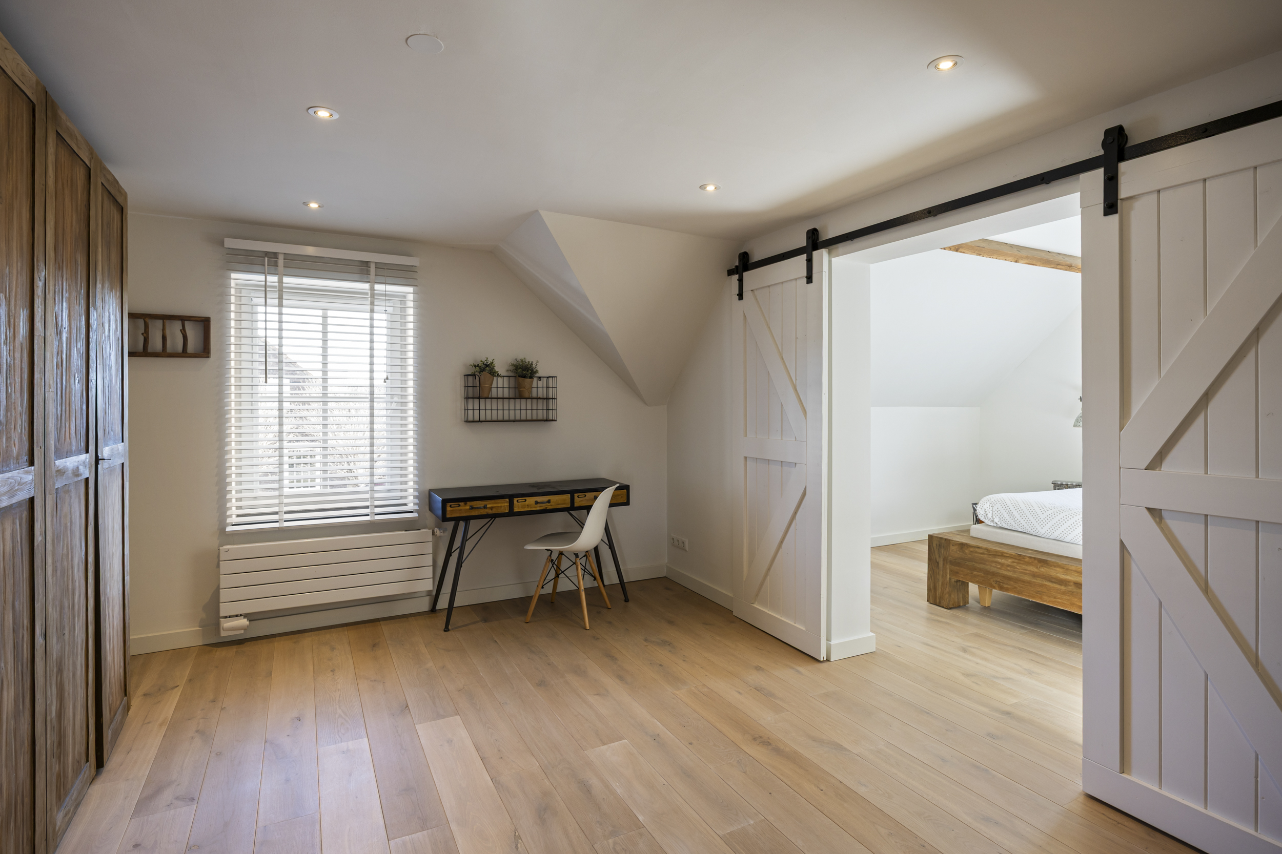 Boven de bijkeuken bevindt zich een extra ruimte die al volledig is afgewerkt. Met een visgraat PVC-vloer, strak gestucte muren, een Velux dakraam en verwarming is dit een volwaardige extra kamer, geschikt als werkplek, hobbyruimte of berging.