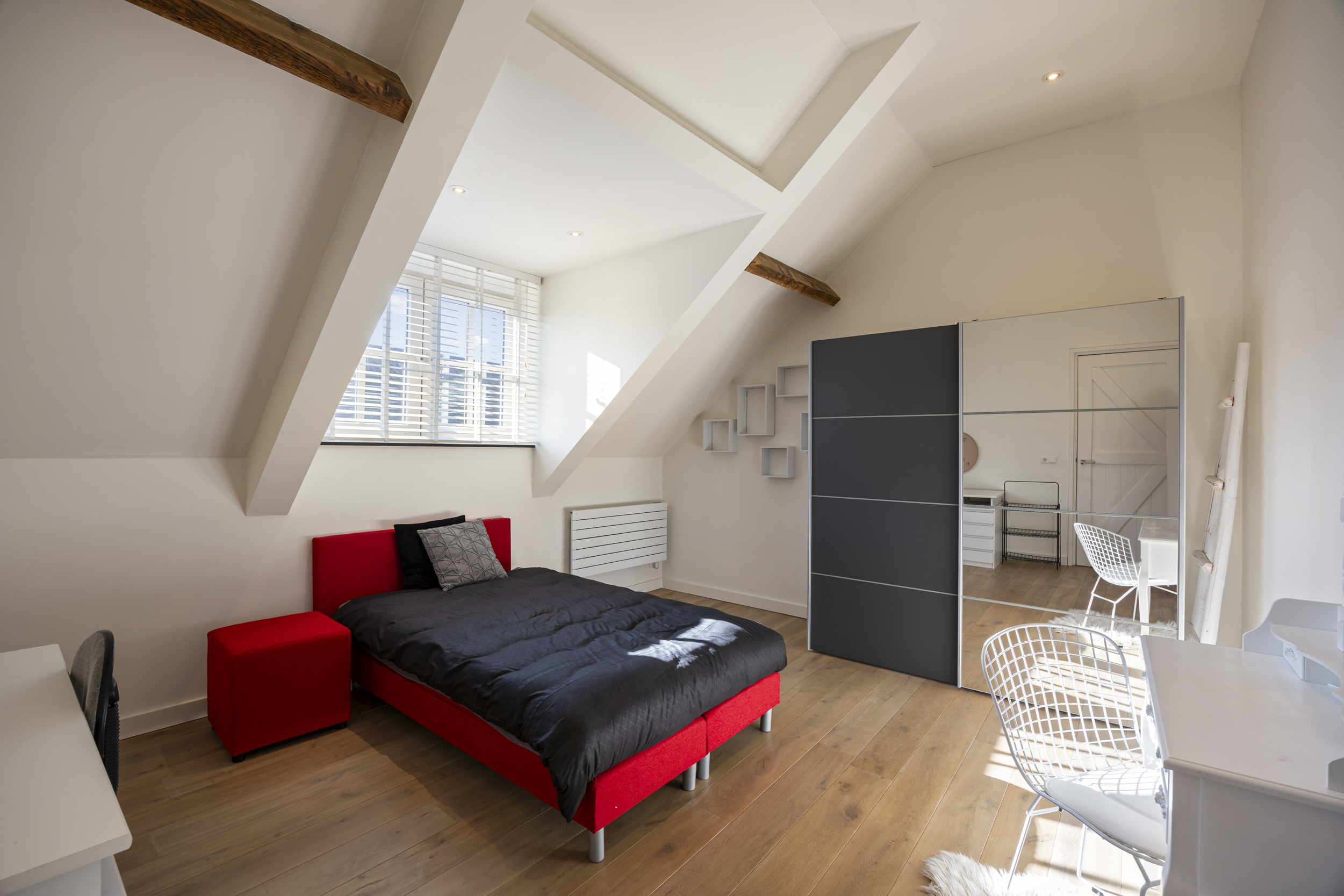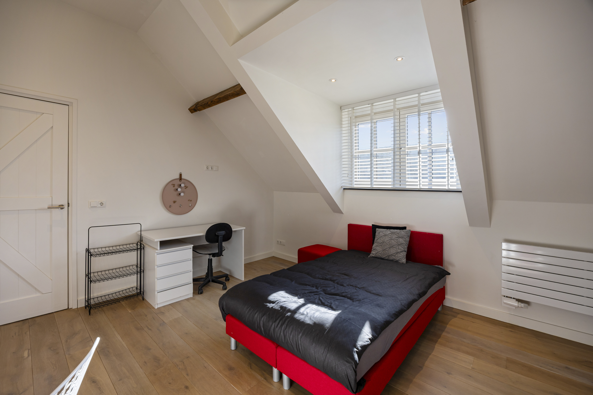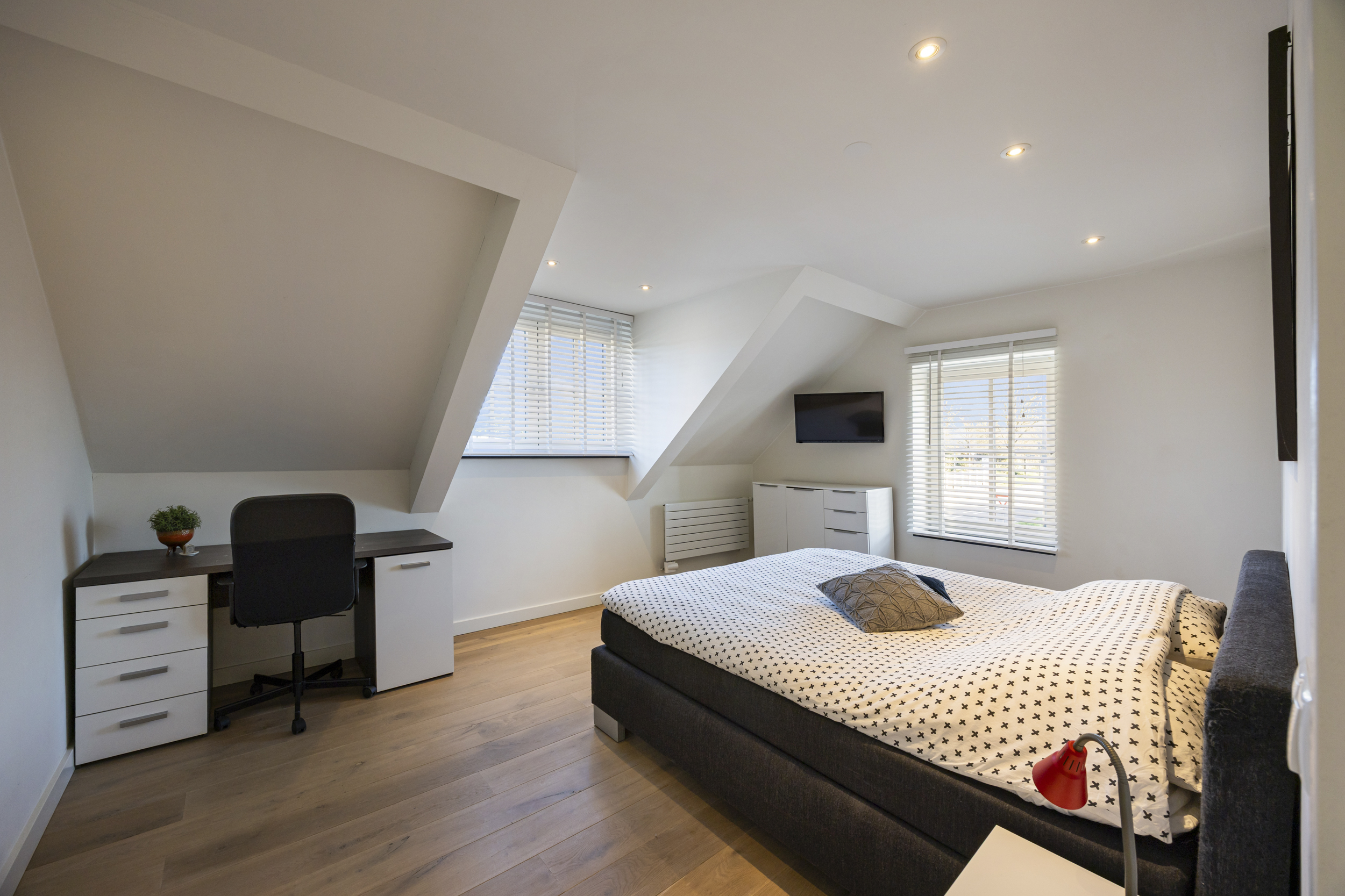 Boven de bijkeuken bevindt zich een extra ruimte die al volledig is afgewerkt. Met een visgraat PVC-vloer, strak gestucte muren, een Velux dakraam en verwarming is dit een volwaardige extra kamer, geschikt als werkplek, hobbyruimte of berging.