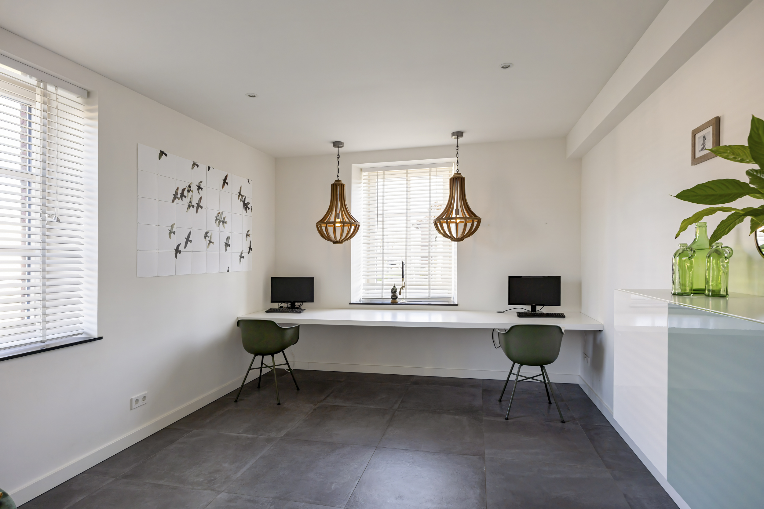 Vanuit de keuken komt u in de gang voorzien van een zwart-witte tegelvloer, waar dezelfde rustige afwerking is doorgezet. Hier bevinden zich het kantoor, de woonkamer, het toilet en de trap naar boven. Het kantoor is ruim en veelzijdig in gebruik, ideaal voor thuiswerken of als speelruimte. De woonkamer van circa 33 m² sluit qua sfeer naadloos aan op de rest van de woning, met dezelfde vloer, strakke wanden en een fijne lichtinval.