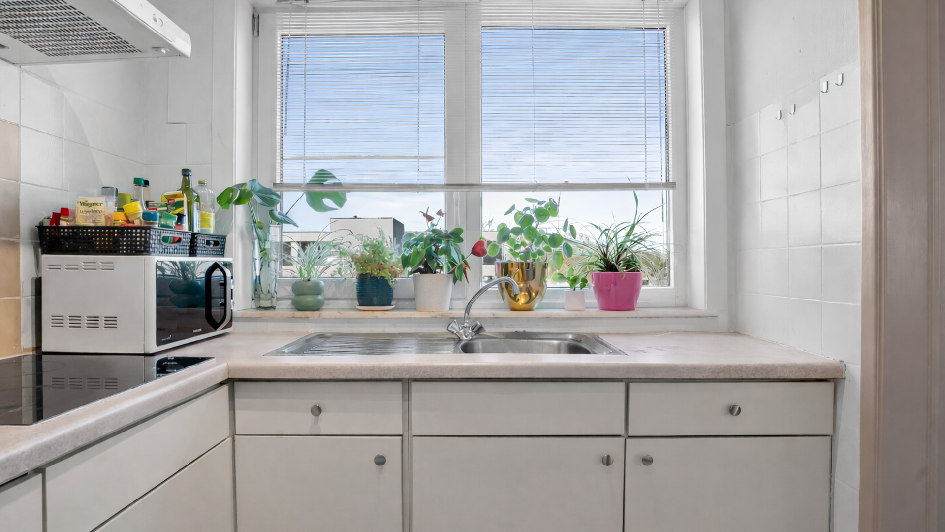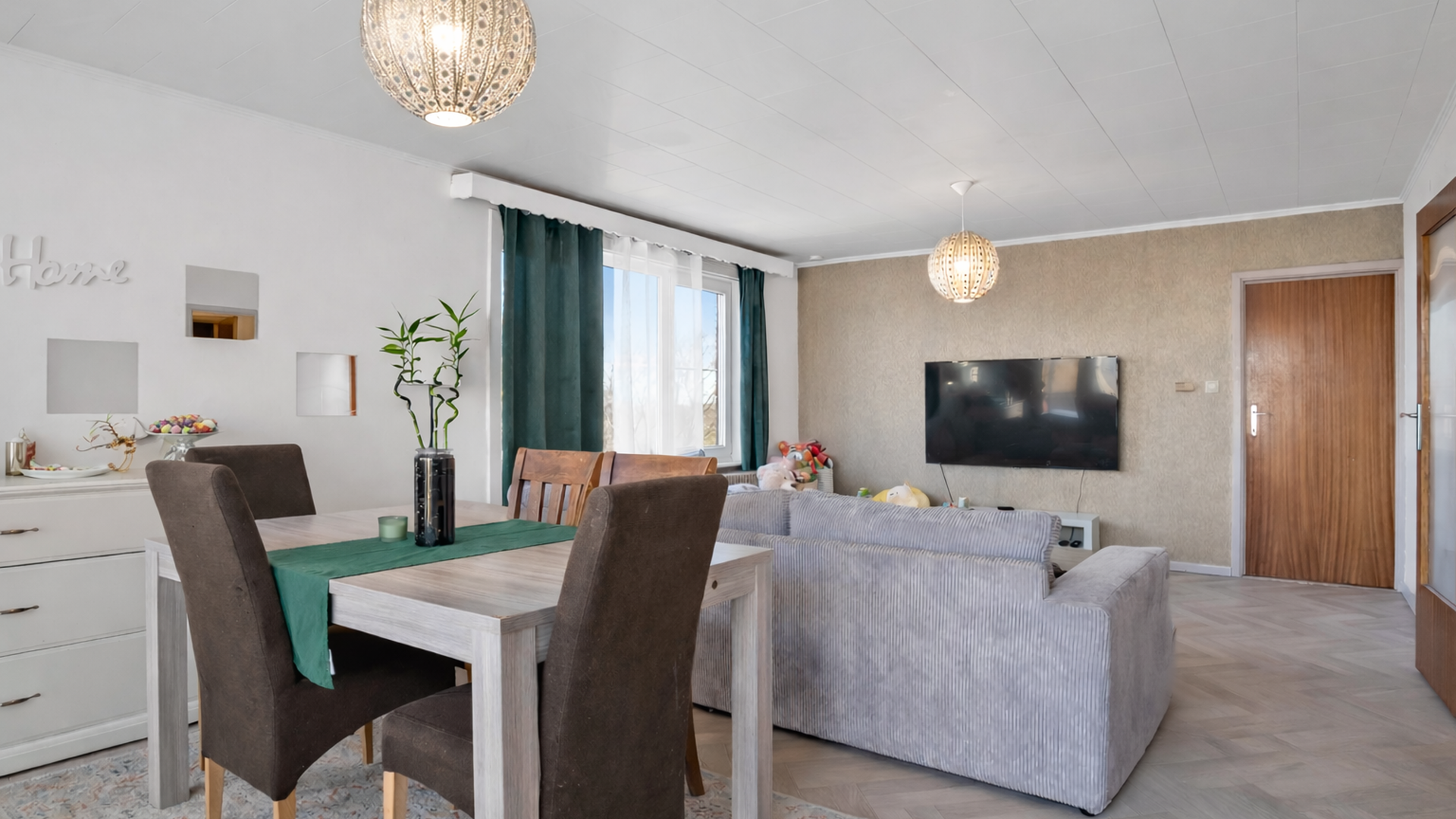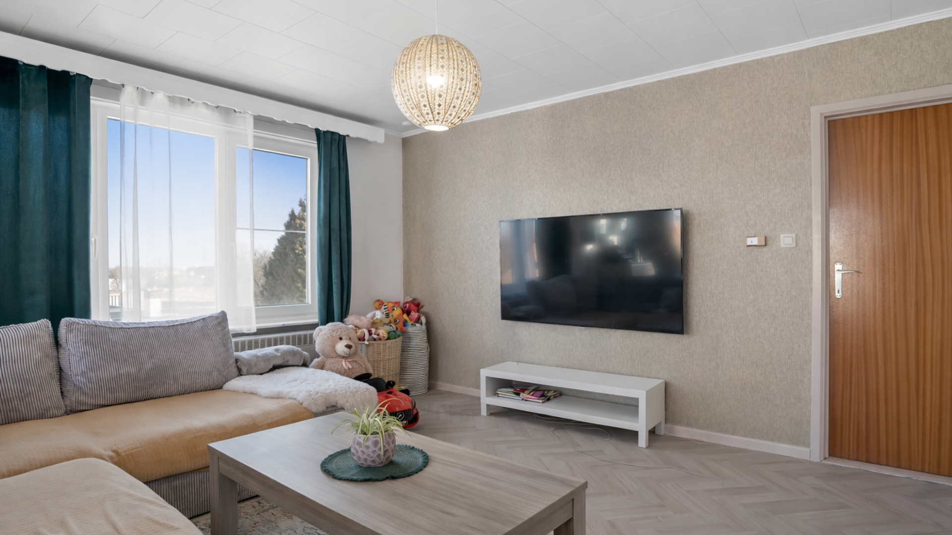 Bij het betreden van het appartement kom je in de inkomhal, die meteen toegang biedt tot een praktische berging/wasruimte. Van hieruit bereik je ook de ruime en lichtrijke leefruimte, waar grote raampartijen – deels tot op de vloer – zorgen voor een aangename lichtinval en een open gevoel. Via de leefruimte heb je rechtstreeks toegang tot het balkon, ideaal om even te genieten van de buitenlucht.