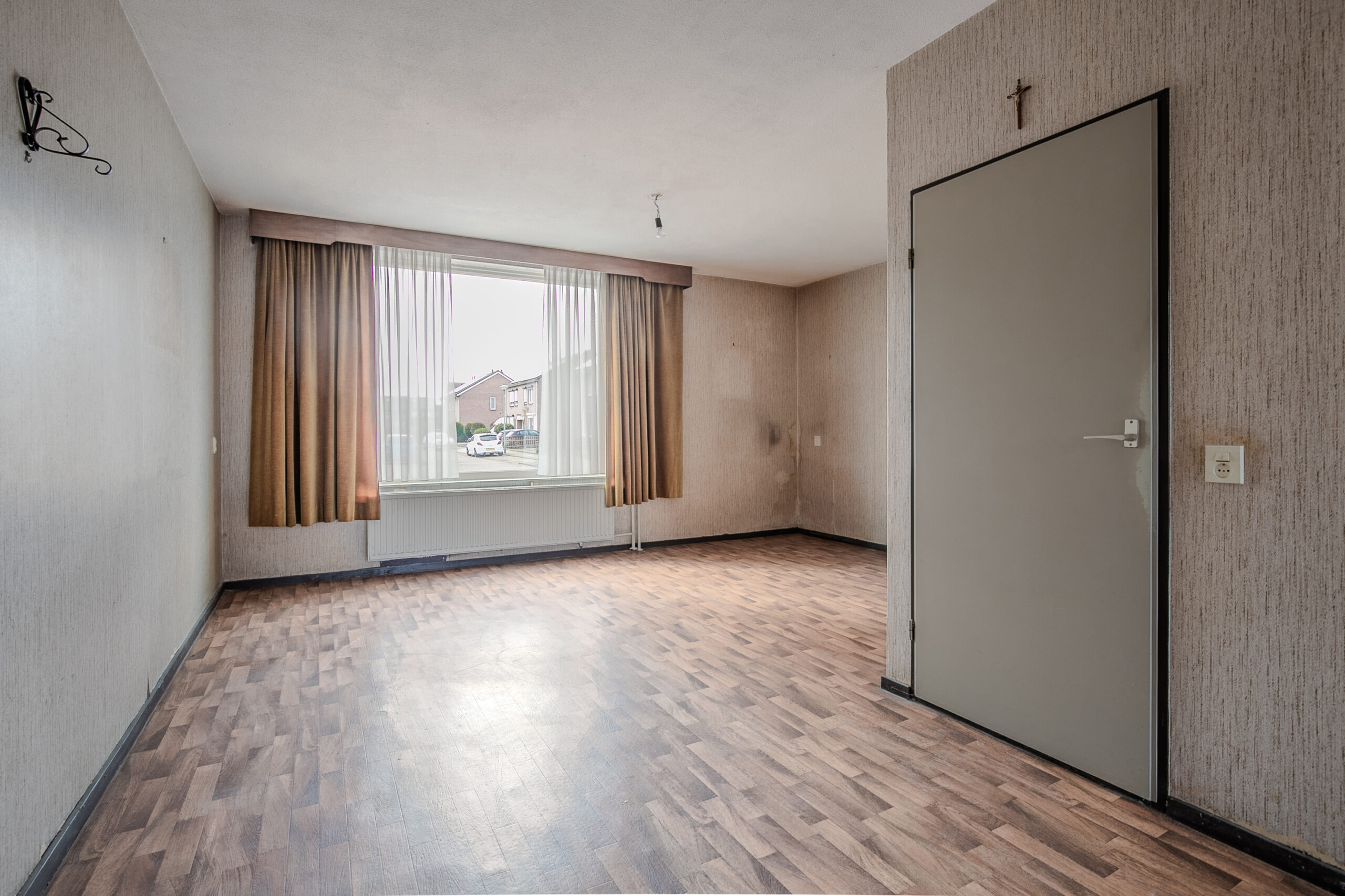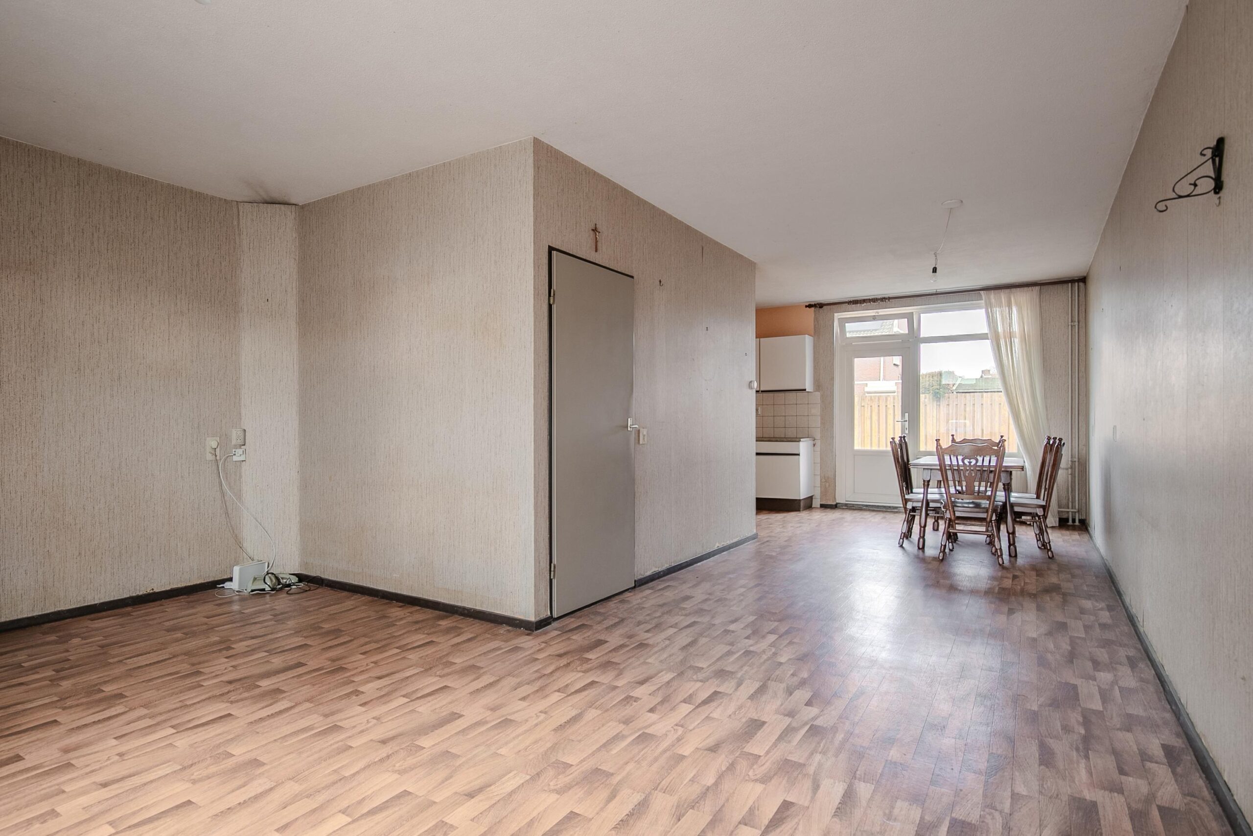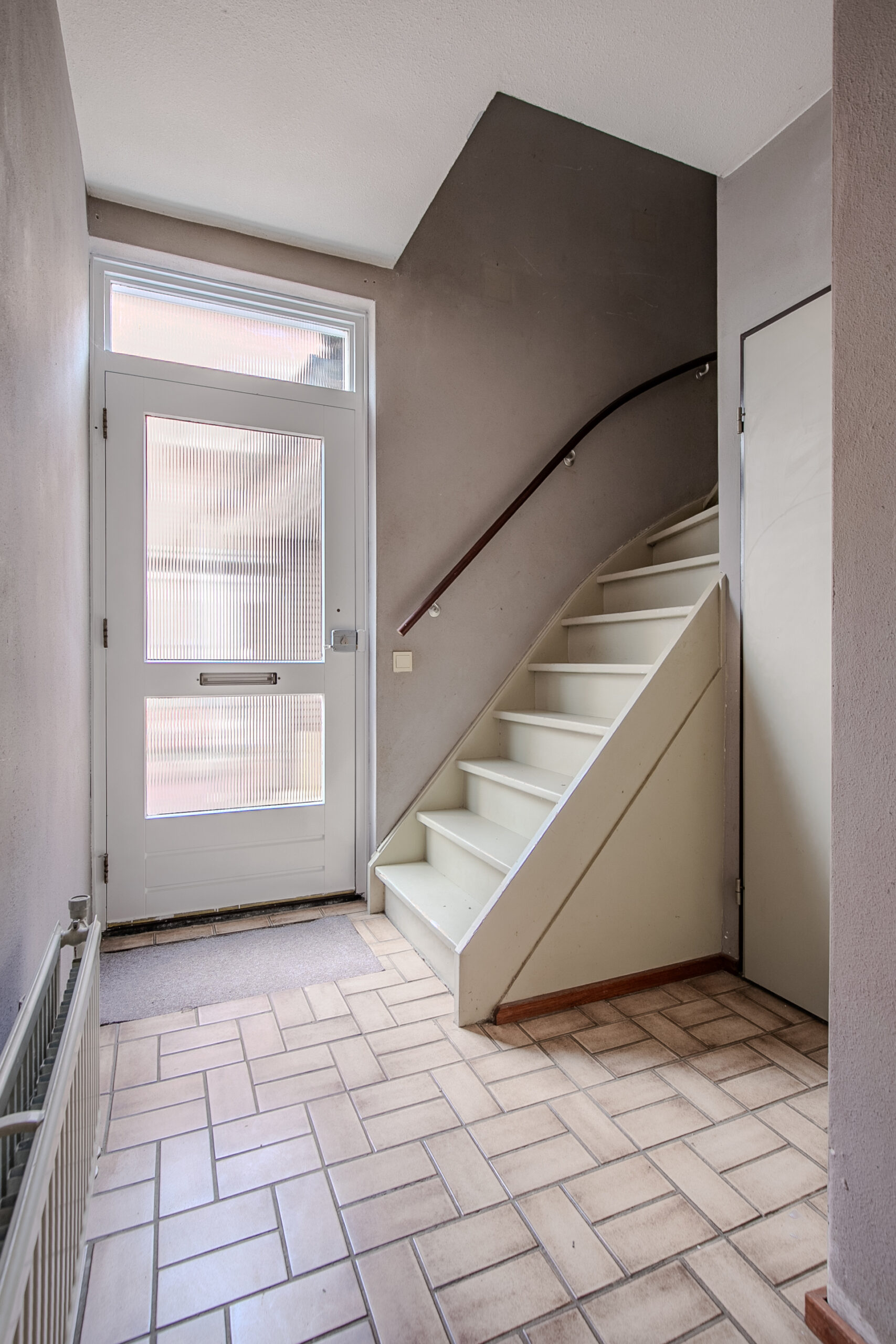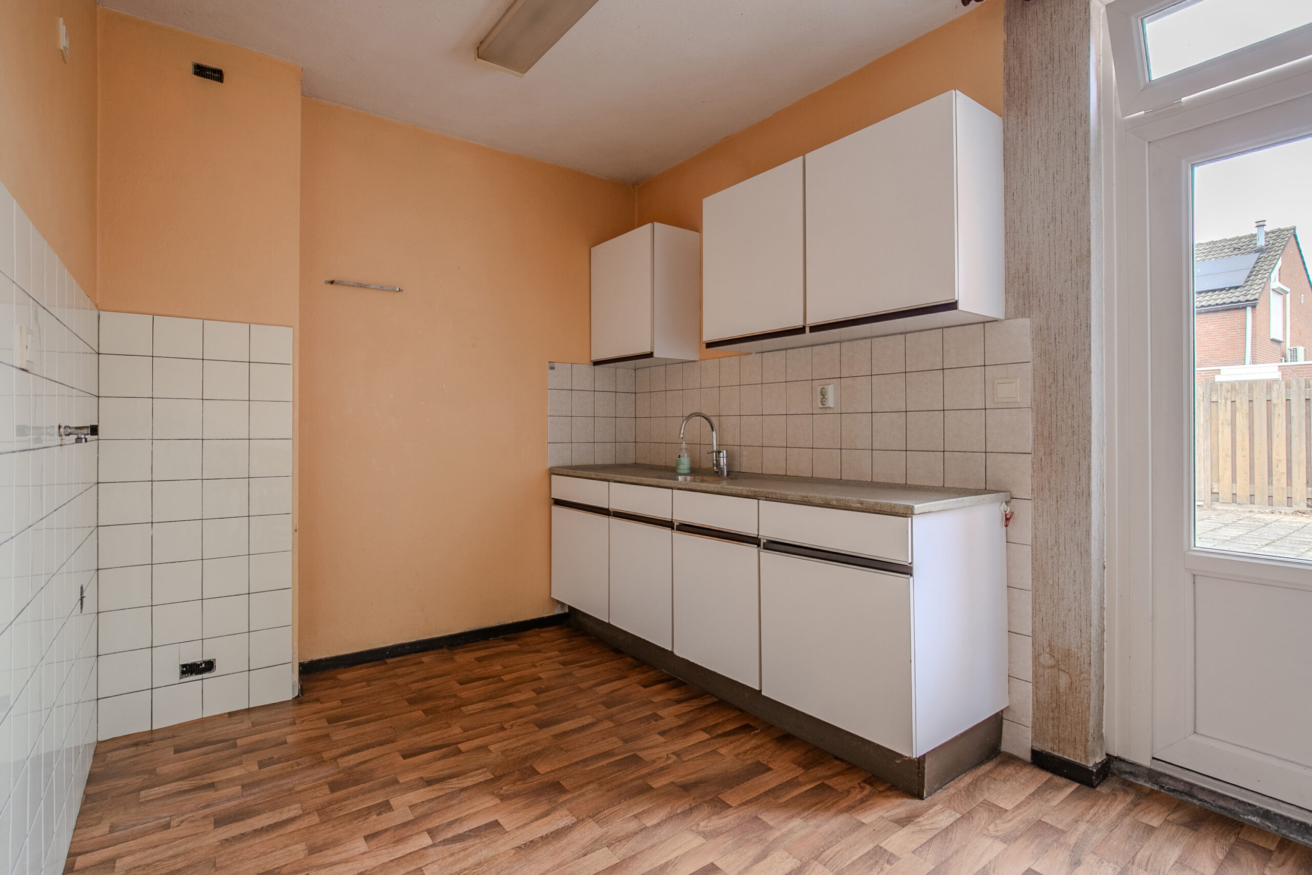 Diepe voortuin, die voor een vriendelijke aanblik van dit huis zorgt en een lange oprit met twee parkeerplaatsen. De ontvangsthal is voorzien van een tegelvloer en de meterkast. Het toilet is deels betegeld en heeft een toilet en een fonteintje. De woonkamer is L-vormig 9.20 x 5.12/2.73, dit is een oppervlakte van 33 m². De halfopen keuken 2.54 x 2.51 ligt aan de achterzijde en is voorzien van een eenvoudig keukenblok. De oppervlakte van de keuken en de woonkamer bedraagt ongeveer 39 m².
