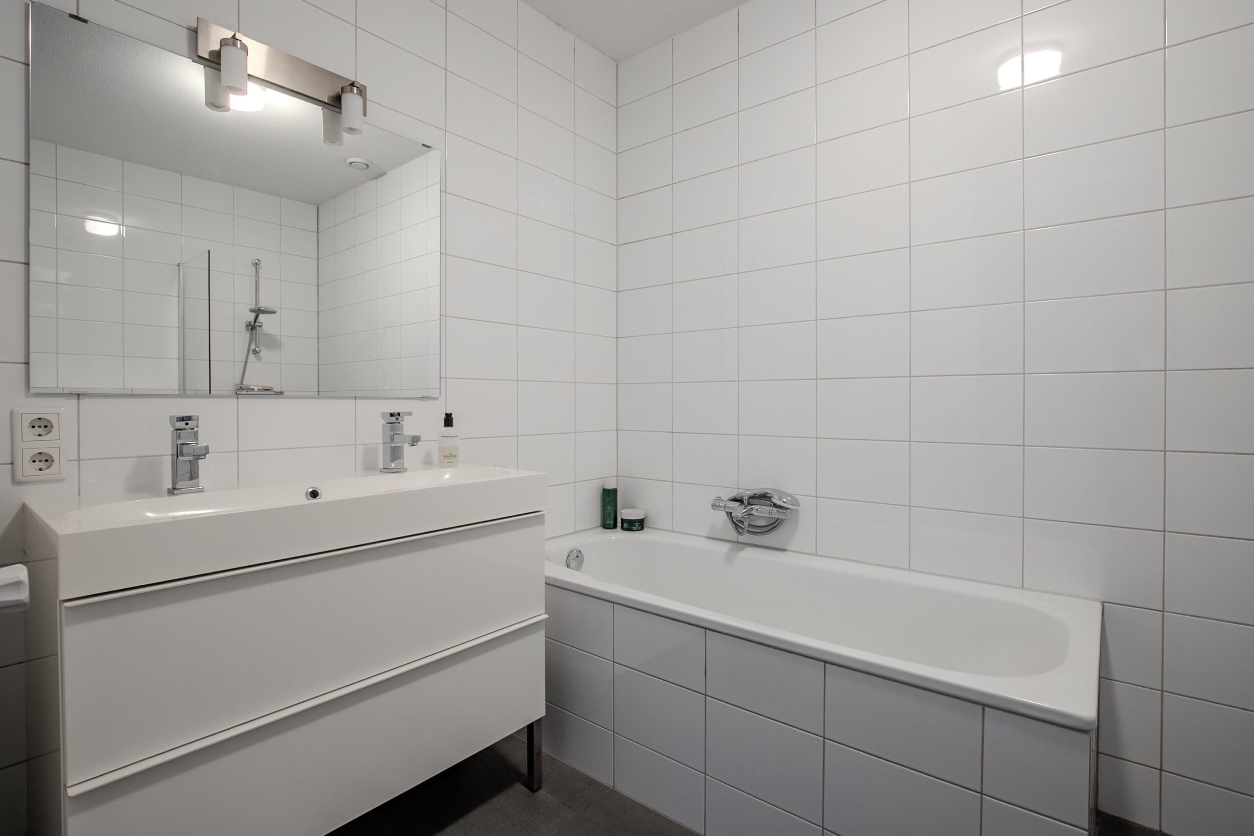 - Badkamervoorzieningen Ligbad, toilet, douche, dubbele wastafel, wastafelmeubel