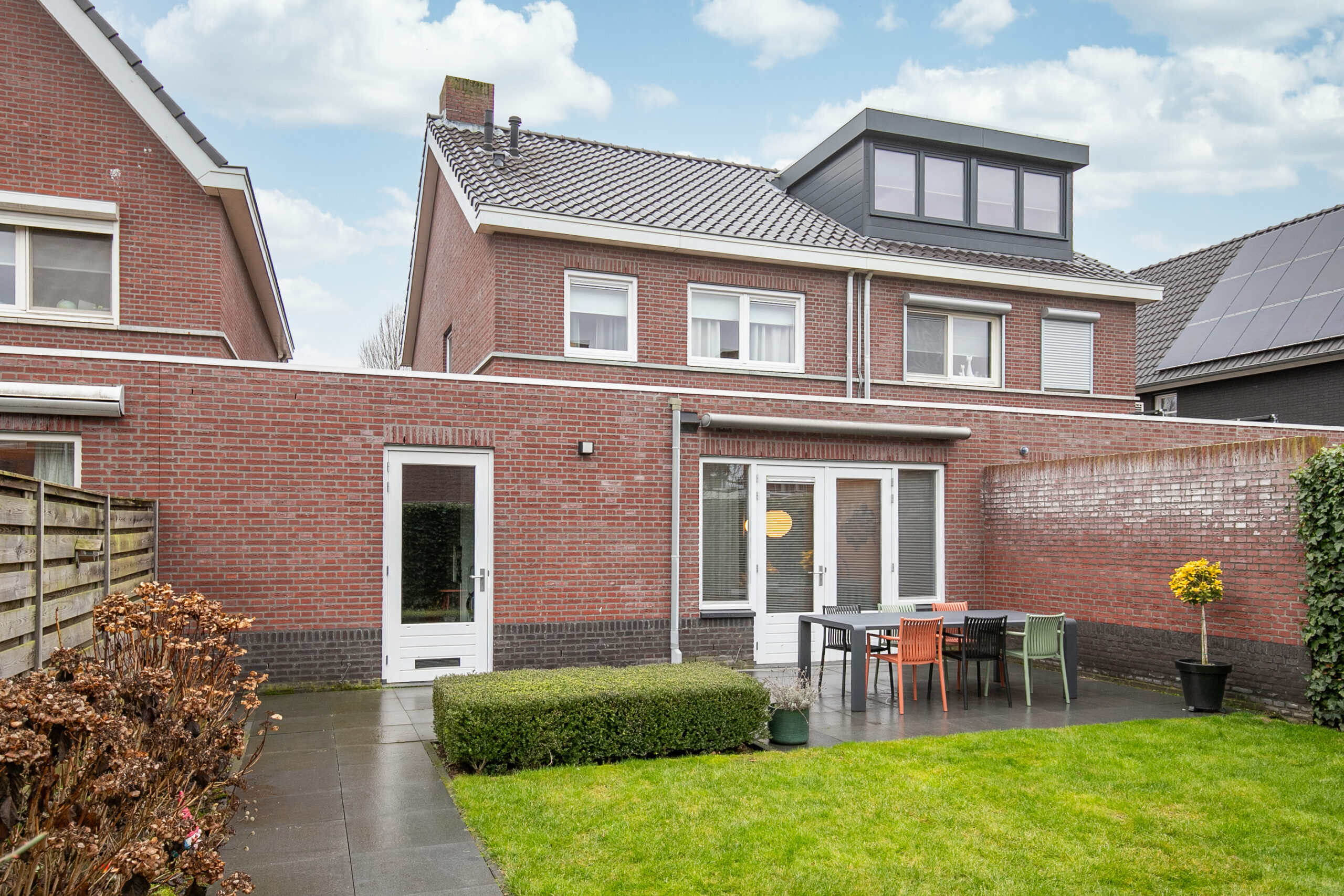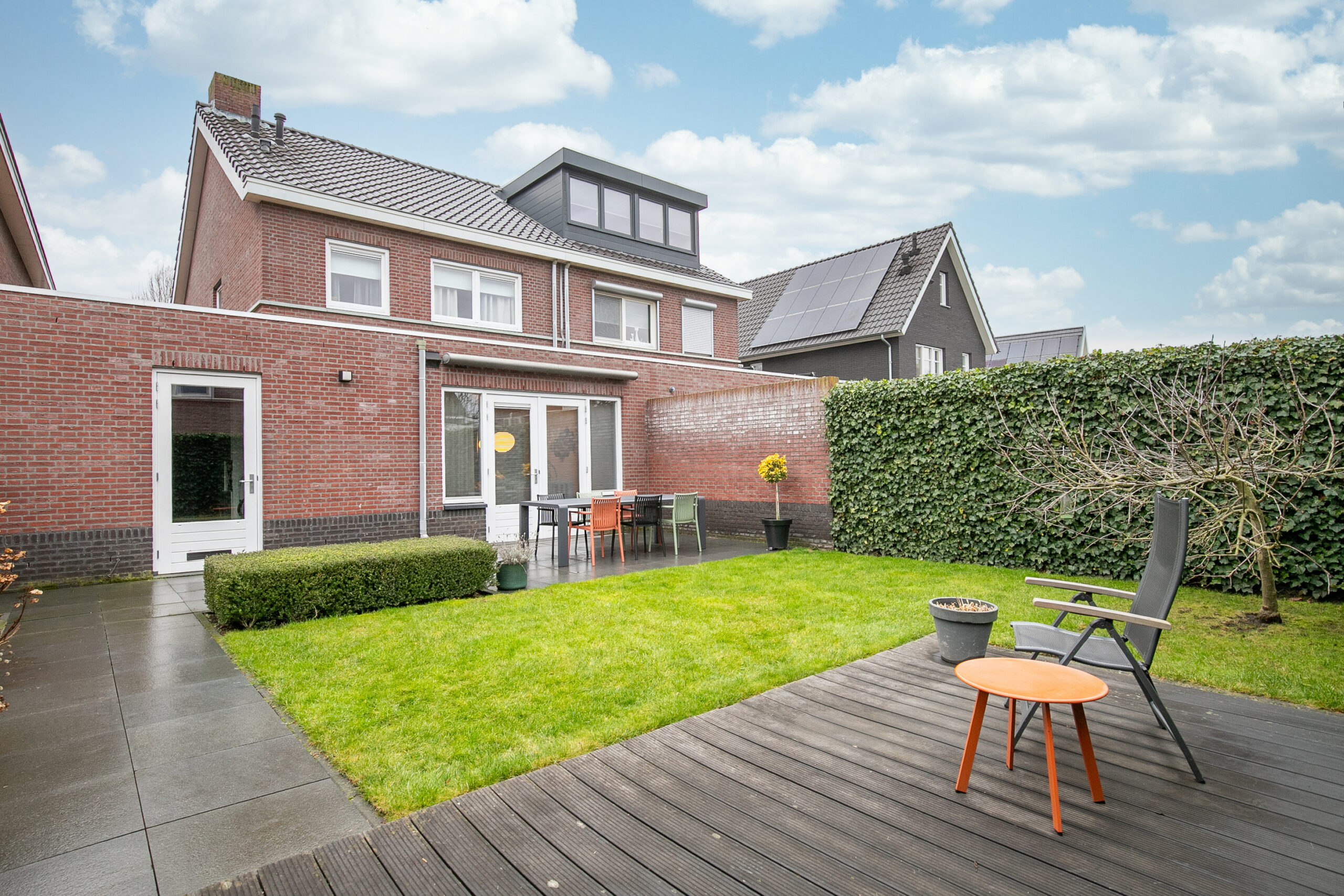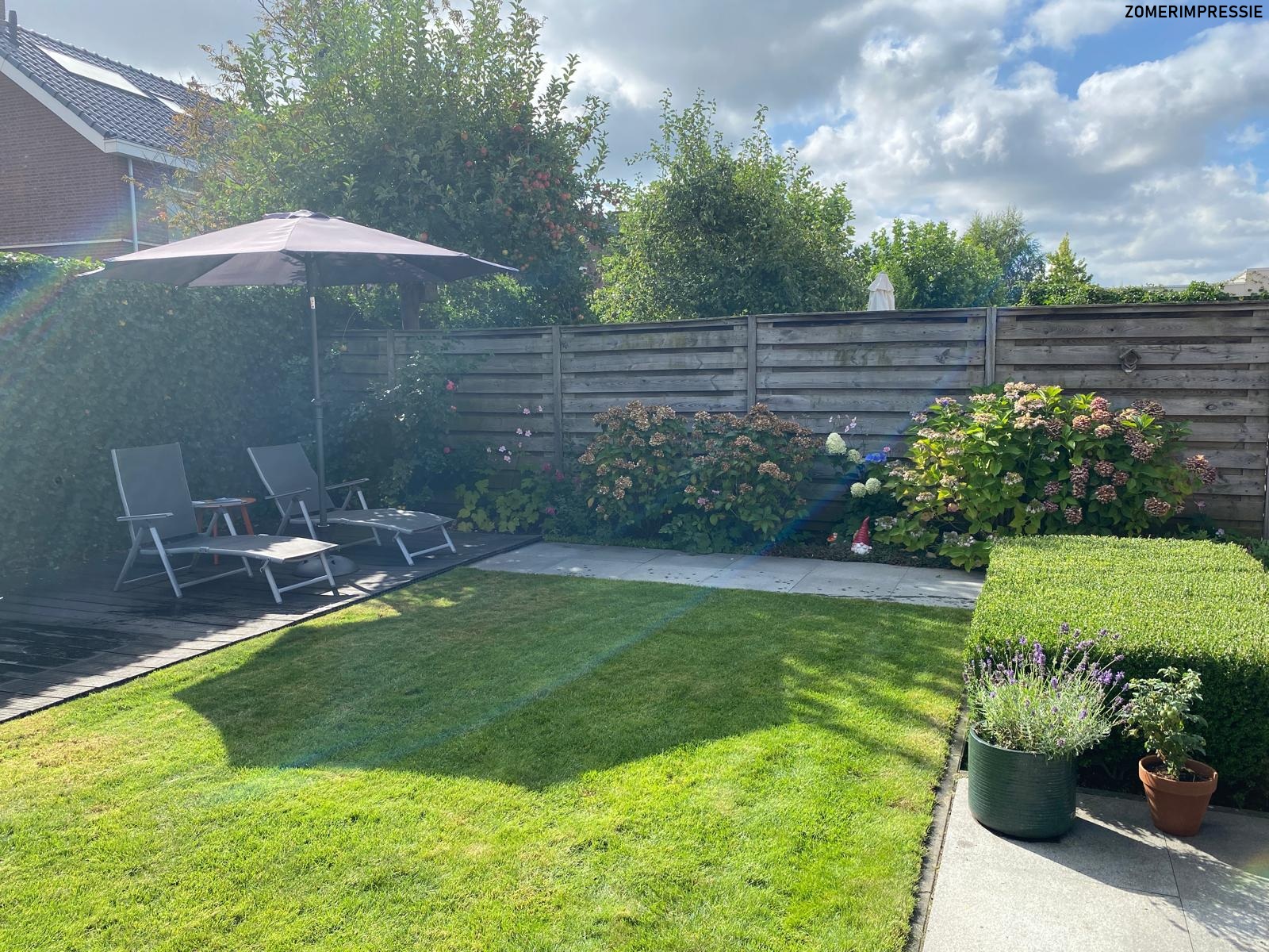 De tuin is oostelijk georiënteerd en voorzien van een groot terras met elektrisch zonnescherm, gazon en een onderhoudsvriendelijke composieten vlonder als tweede terras. De tuin is zeer netjes onderhouden, geheel omsloten en bereikbaar vanuit de garage en vanuit de keuken middels openslaande tuindeuren.