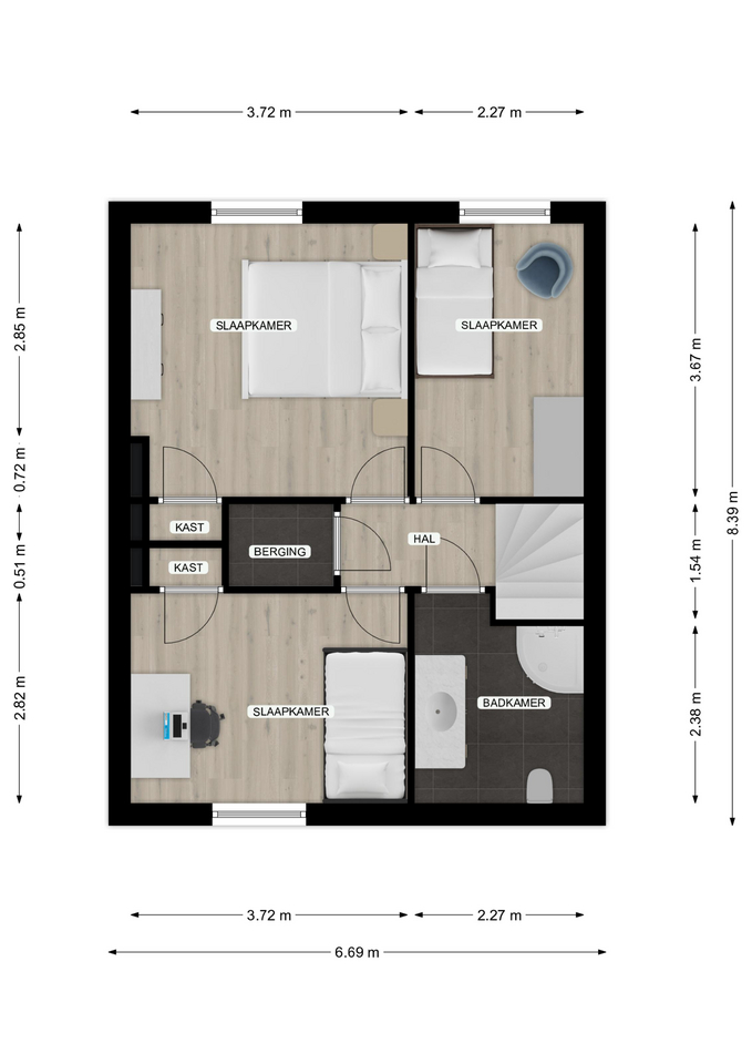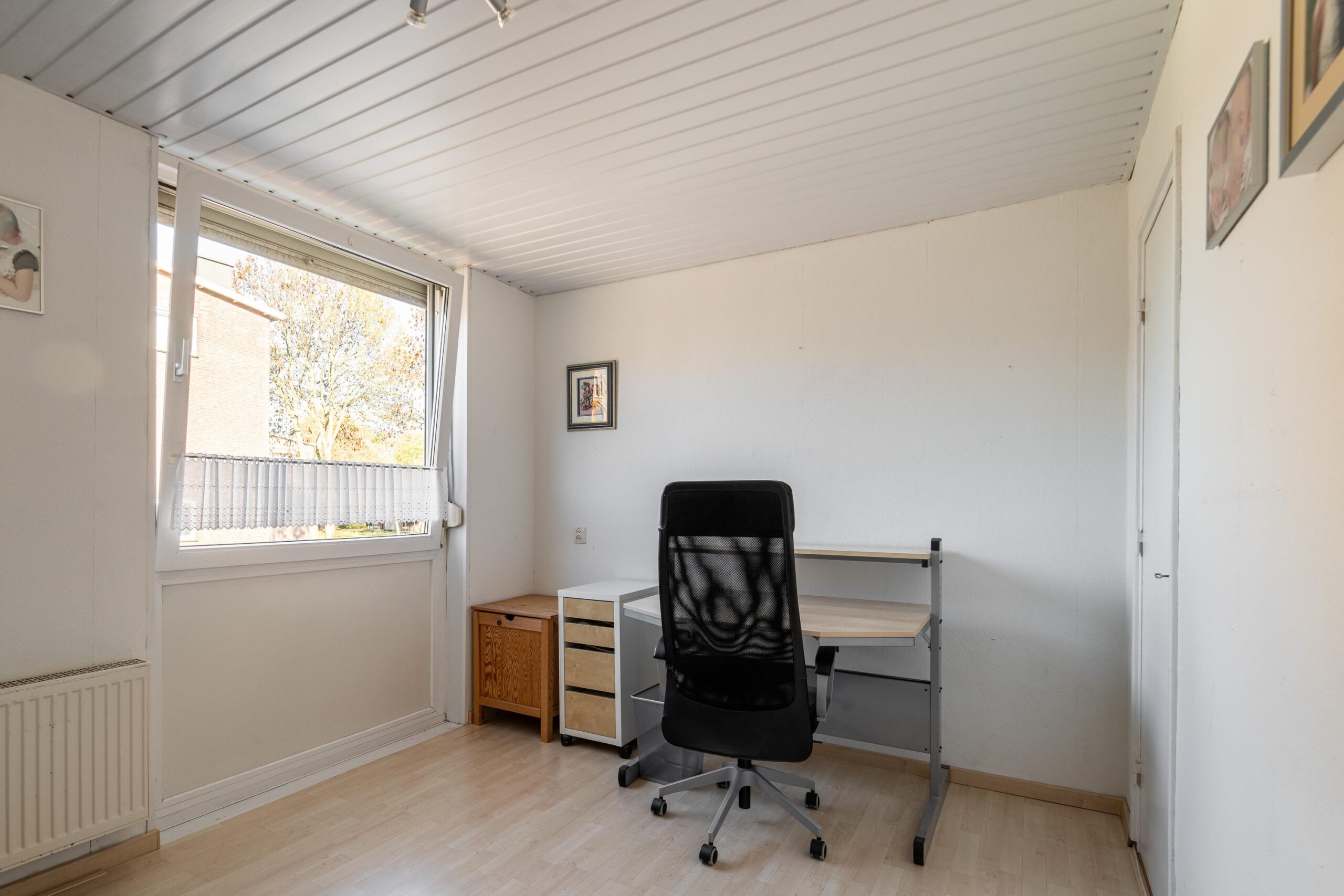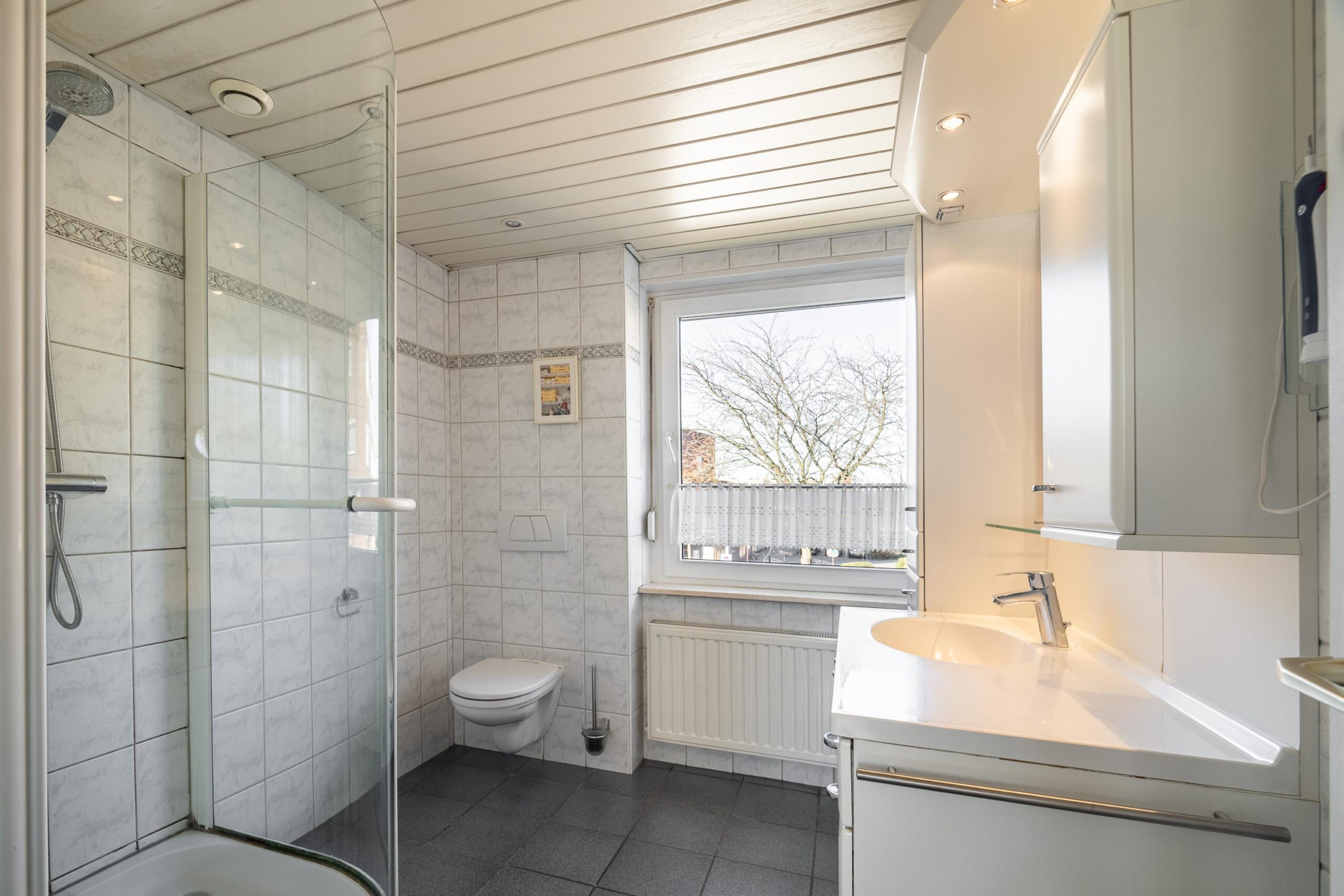 Op de eerste verdieping geeft de overloop toegang tot drie slaapkamers, waarvan twee zijn voorzien van inbouwkasten. De voormalige badkamer wordt momenteel gebruikt als berging. De slaapkamers beschikken over een laminaatvloer. De volledig betegelde badkamer is voorzien van een halfronde douche met glazen deuren, wastafelmeubel, tweede vrijhangend toilet en inbouwverlichting.