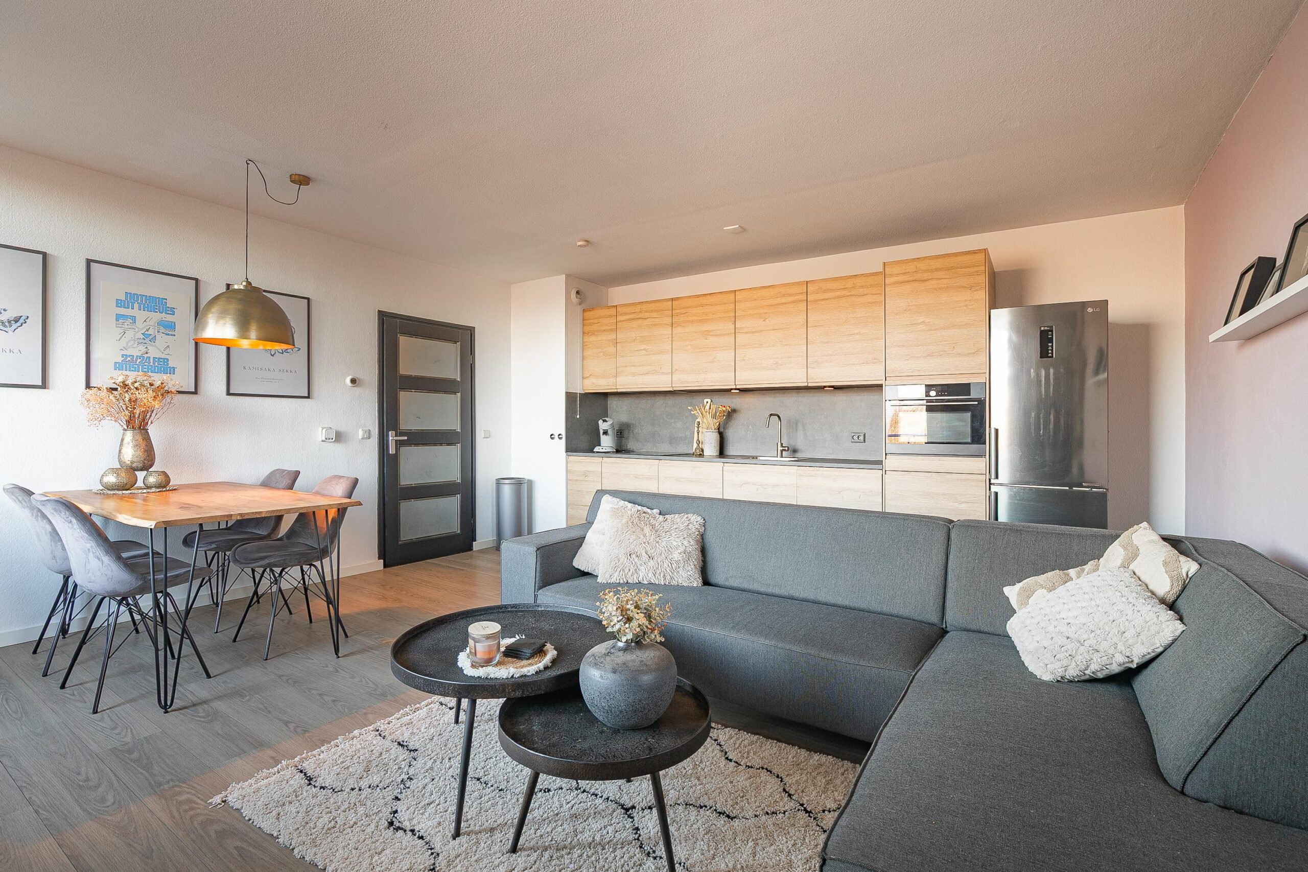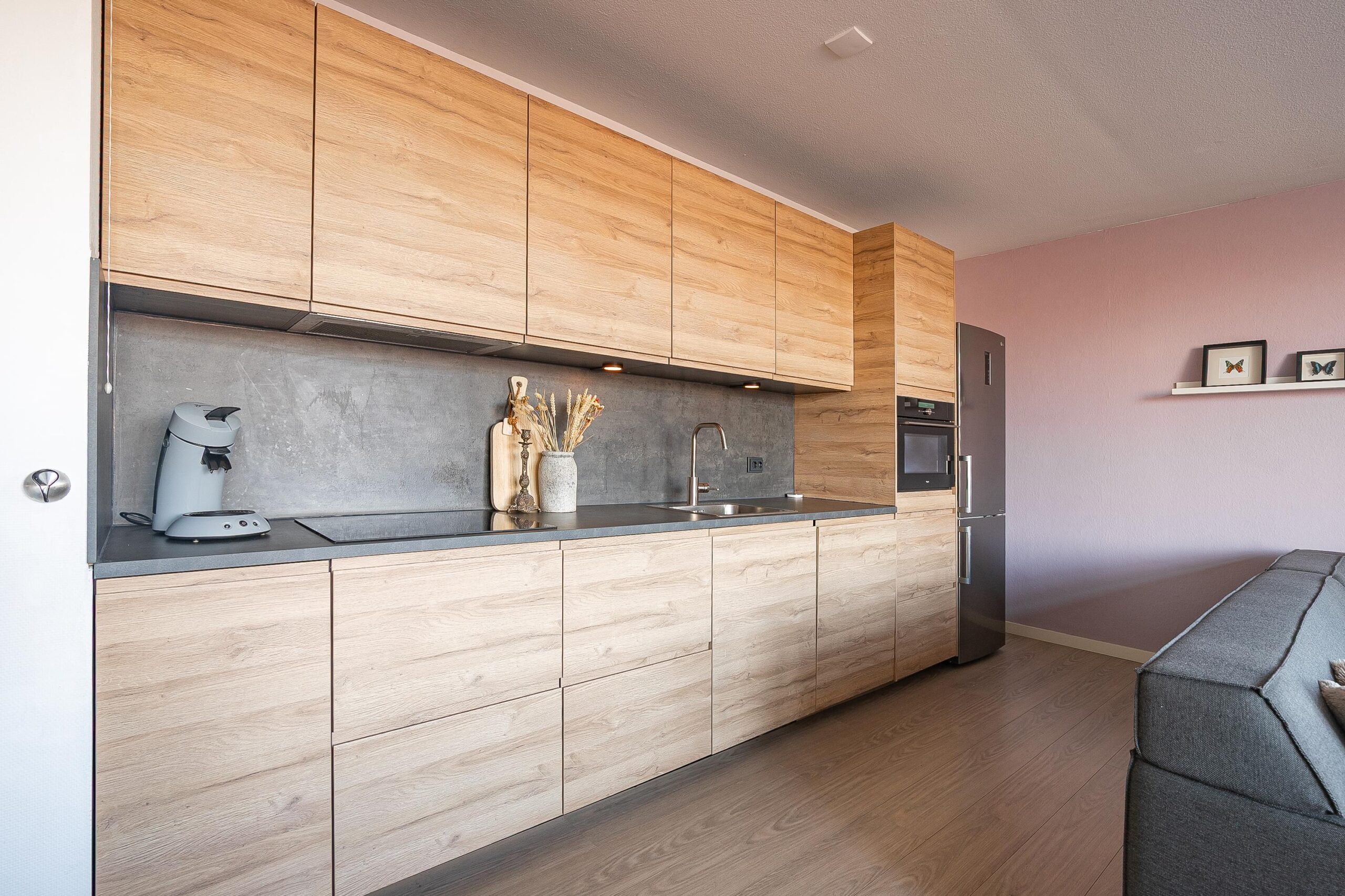 Daarnaast biedt de hal toegang tot het separate toilet en de cv-ruimte. De ruime en lichte woonkamer (ca. 30 m²) geeft toegang tot het balkon (ca. 6,5 m²), waar je geniet van veel privacy en een vrij uitzicht op het groen. De open keuken beschikt over een moderne keukenopstelling en is uitgerust met een inductiekookplaat, afzuigkap, spoelbak, oven en vaatwasser.