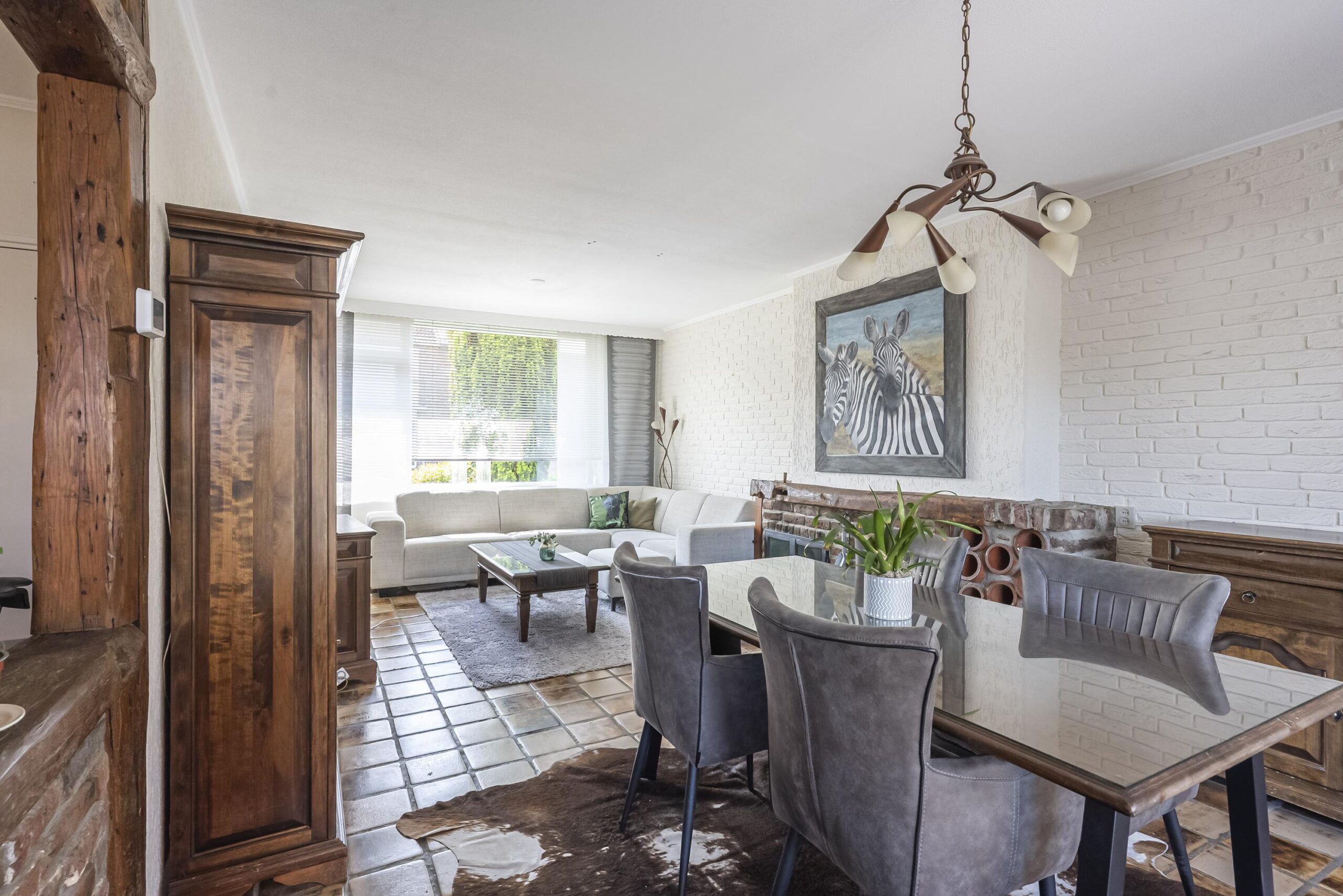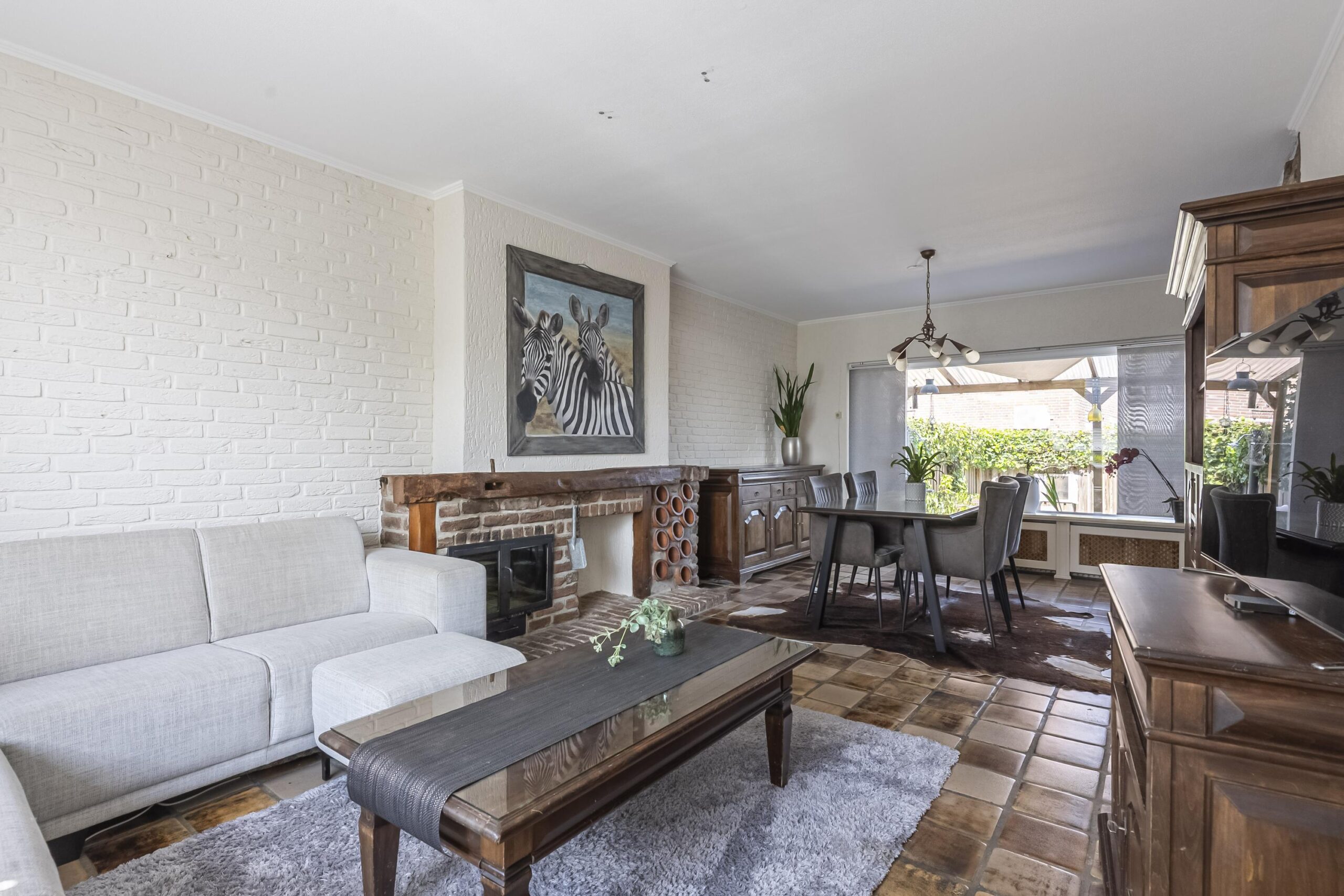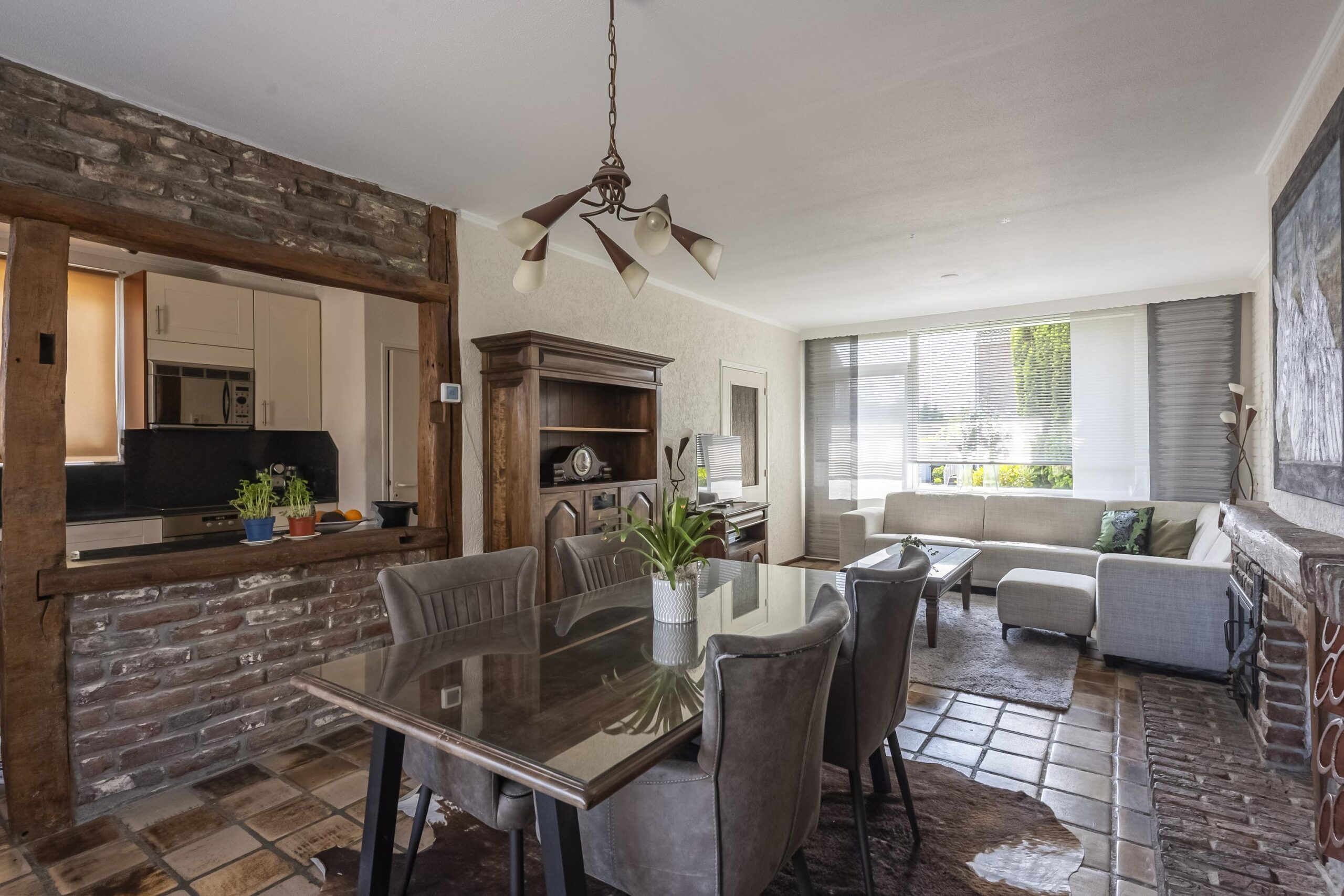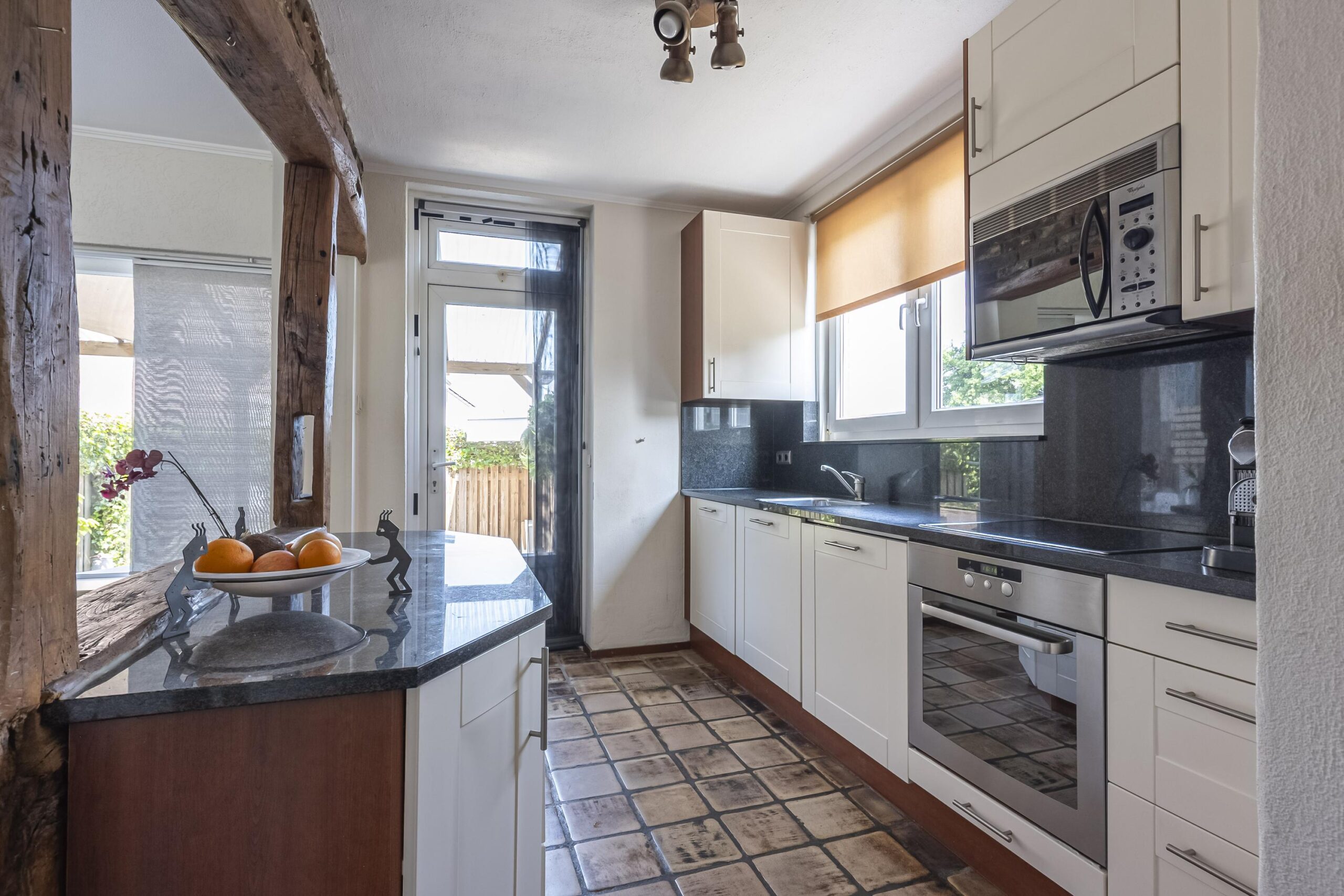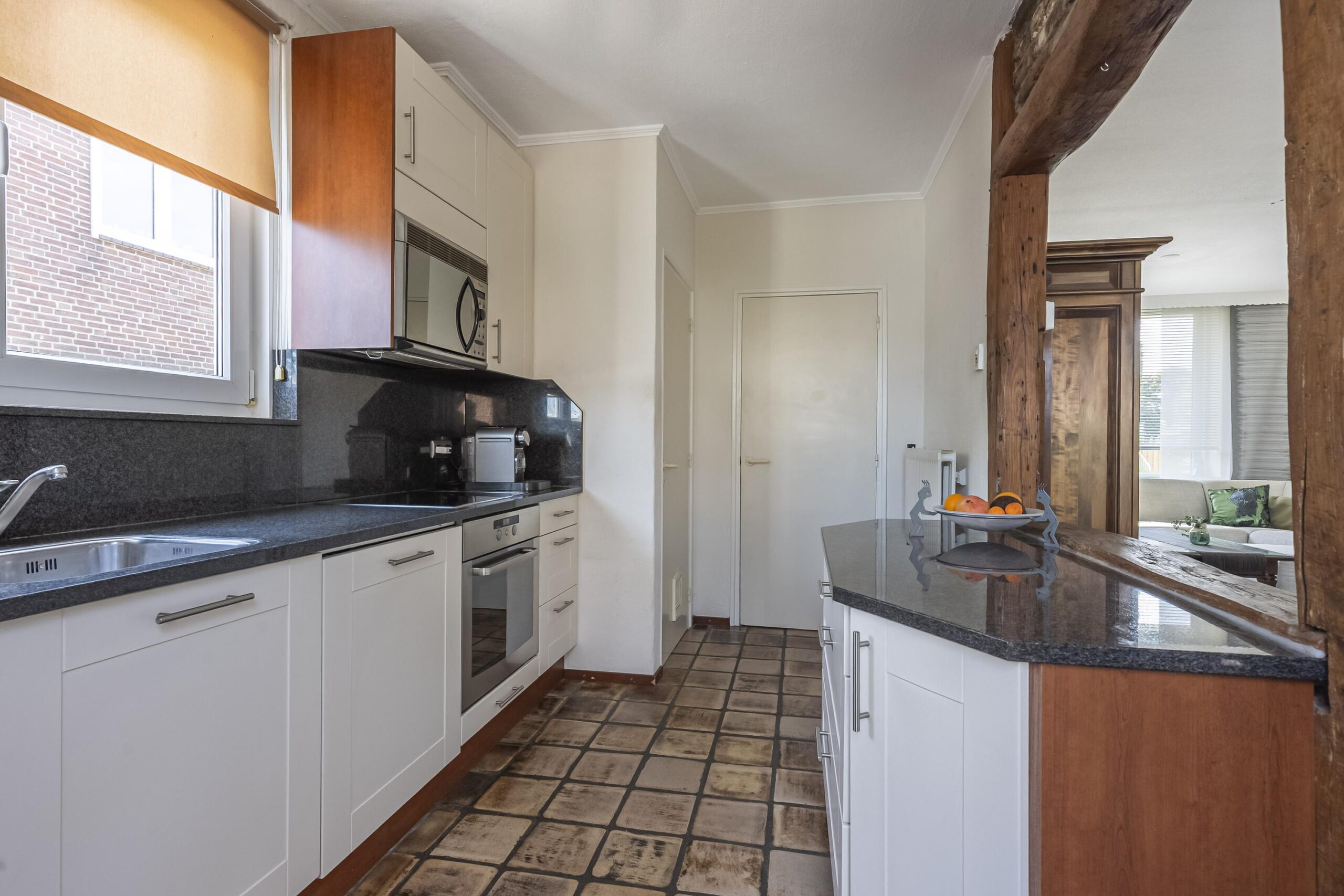De sfeervolle woonkamer kenmerkt zich door uitstekende lichtinval, een plavuizenvloer en een karakteristieke open haard met inzet houtkachel. De open keuken is voorzien van een moderne kunststof installatie met granieten werkblad en achterwand, en beschikt over de volgende inbouwapparatuur: keramische kookplaat, vlakscherm afzuigkap, koelkast, vaatwasser, heteluchtoven en combimagnetron.