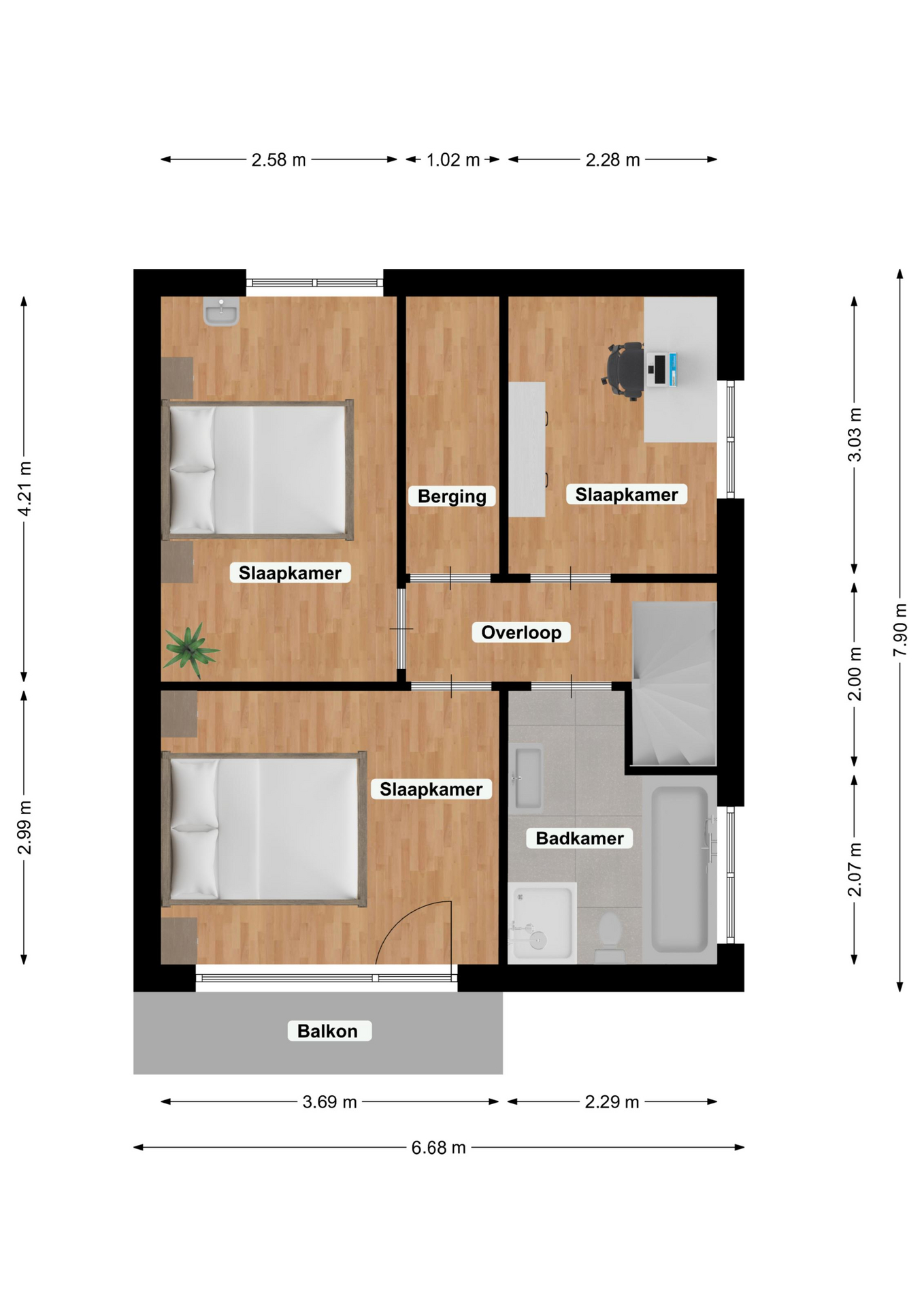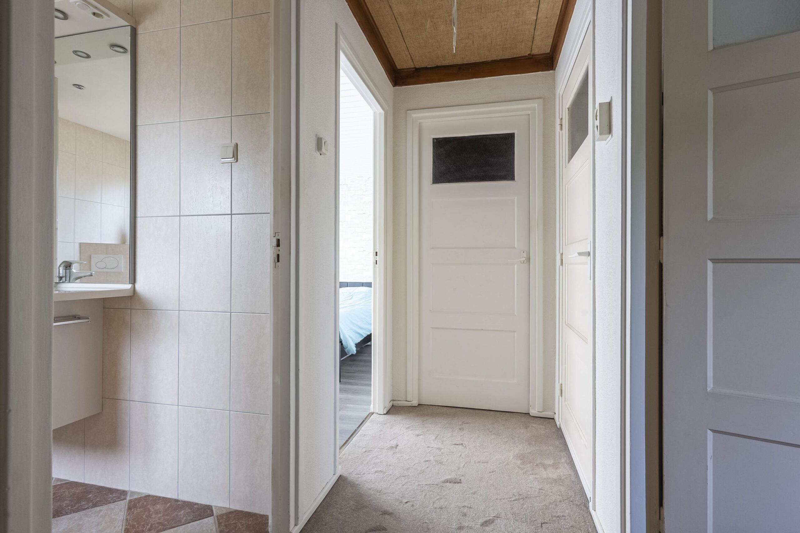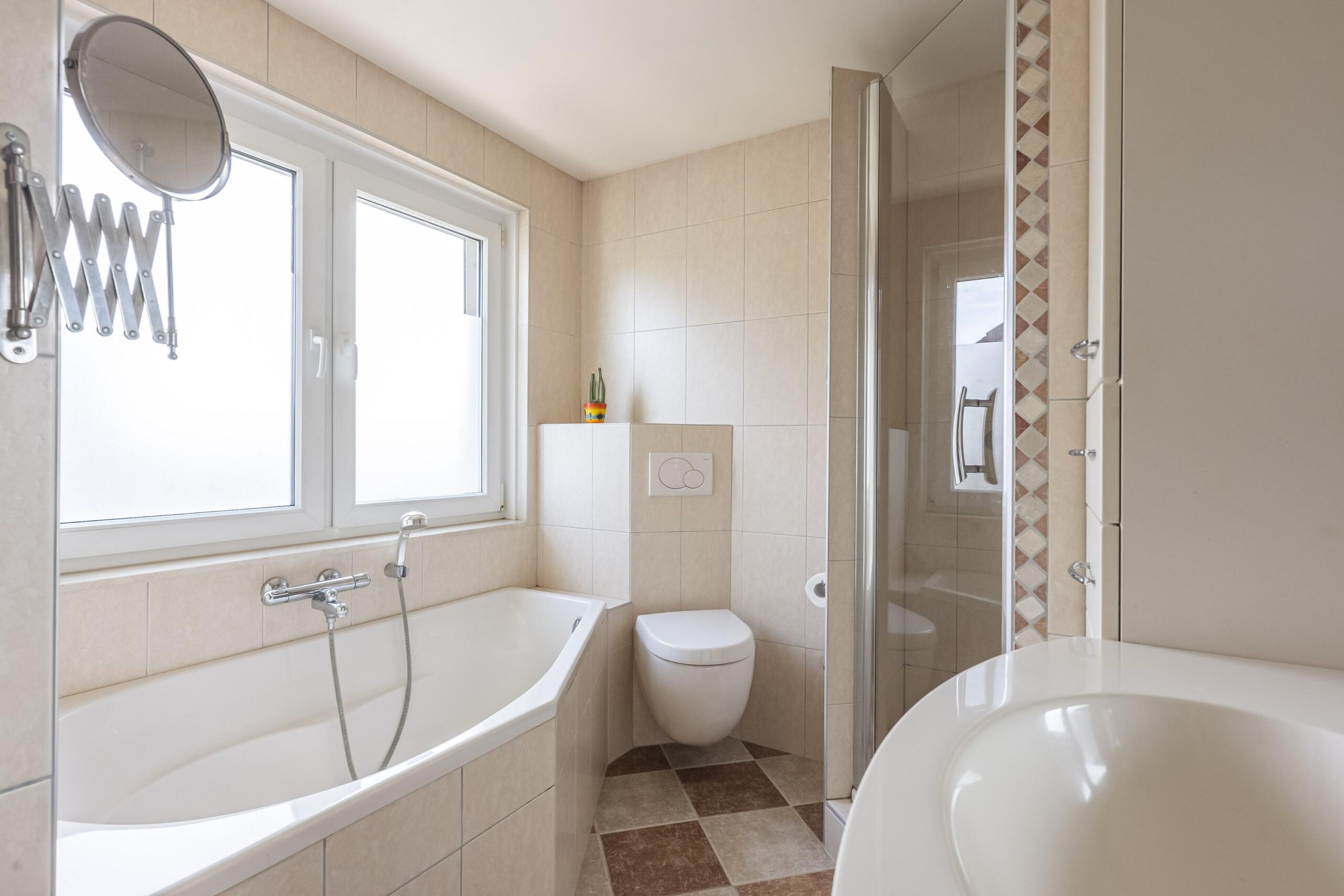 Overloop met toegang tot drie slaapkamers, deze zijn circa 11 m², 11 m² en 7 m² groot. Eén slaapkamer beschikt over een parketvloer en wastafel, de kamer aan de voorzijde is voorzien van een moderne laminaatvloer en heeft toegang tot een balkon met RVS balustrade. De geheel betegelde badkamer is uitgerust met een kunststof ligbad, inloopdouche met hardglazen douchedeur, tweede vrijhangend toilet, wastafel met ombouwmeubel, verwarmde spiegel en een verlaagd plafond met geïntegreerde verlichting. Op de overloop bevindt zich tevens een royale inbouwkast.