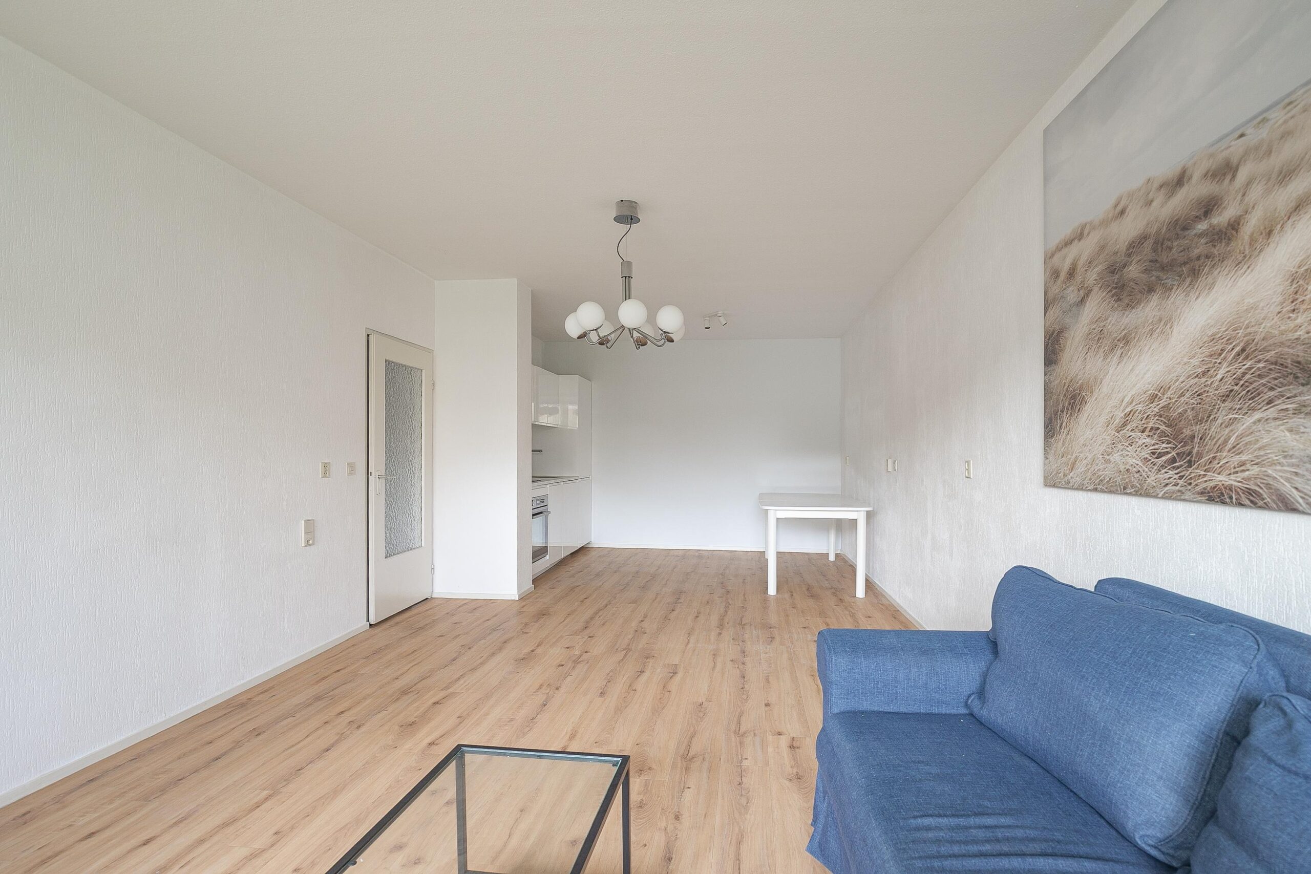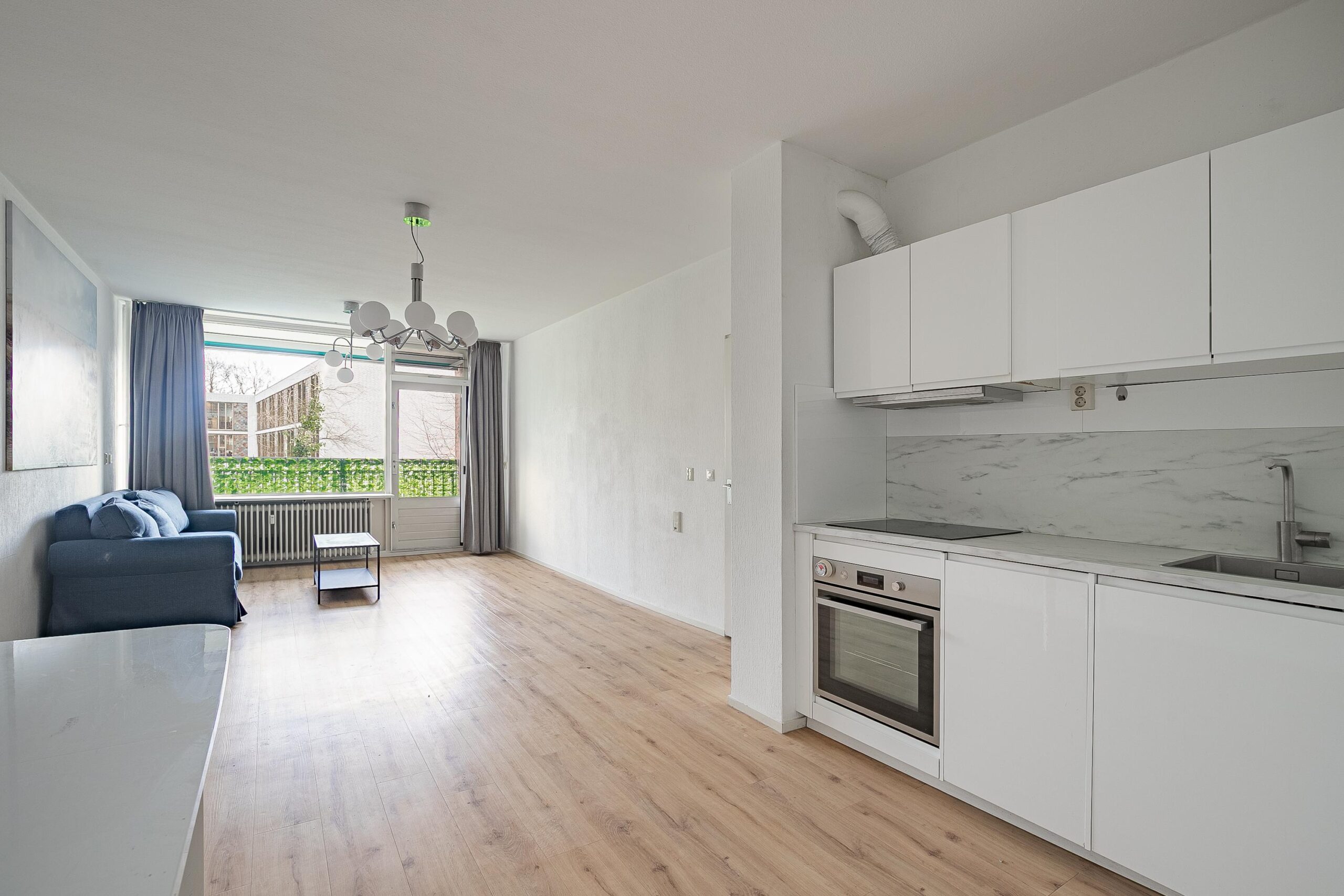 Entree/hal met toegang tot woonkamer, berging, badkamer, toilet en twee slaapkamers. Ruime berging (ca. 5.5m²) waar tevens de boiler hangt. Grote woonkamer (ca. 31m²) met half open keuken en toegang tot het balkon (ca. 5m²) dat op het zuiden gelegen is. De woonkamer is voorzien van een pvc-vloer en veel lichtinval. De keuken is voorzien van een spoelbak, inductiekookplaat, oven, vaatwasser, koelkast en diepvries. Het separate toilet is voorzien van een moderne marmerlook tegelvloer, wandcloset en fonteintje. De badkamer (ca. 4m²) is ook volledig voorzien van dezelfde marmerlook tegel, evenals een inloopdouche, een vaste wastafel met meubel en spiegelkast. Ook zijn er in de badkamer aansluitingen aanwezig voor was-apparatuur. Twee slaapkamers aan de achterzijde (ca. 12m² en 8.5m²) voorzien van dezelfde pvc-vloer en genoeg lichtinval. Het appartement is voorzien van houten kozijnen, dubbele beglazing en een hoogte van 2,60m.