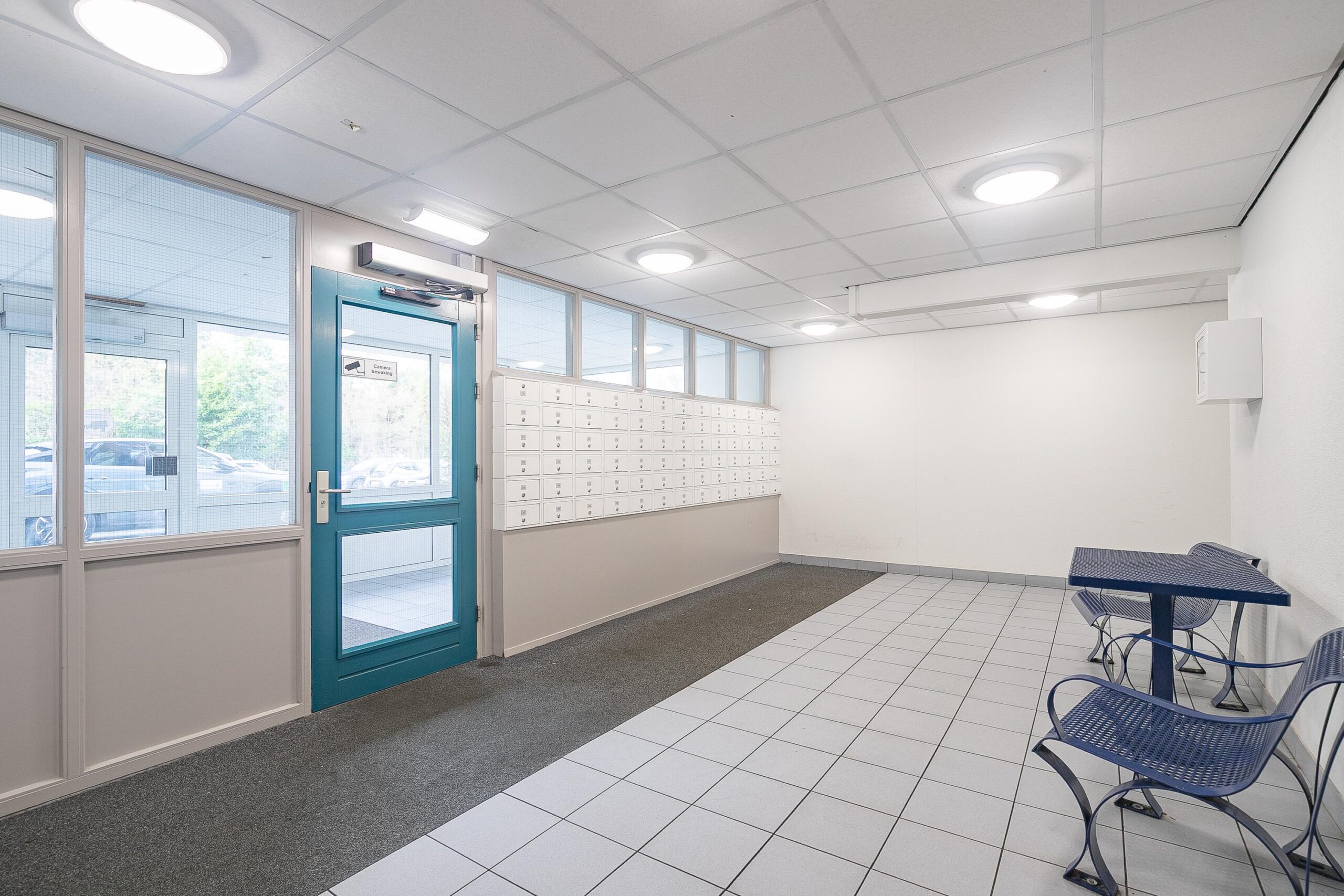 Entree/hal met brievenbussen, bellentableau, lift en trappenhuis.