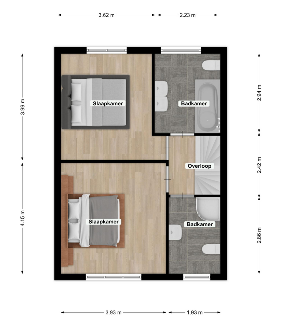 Op deze verdieping bevinden zich twee slaapkamers met laminaatvloer. De slaapkamer aan de achterzijde beschikt bovendien over airconditioning. Er zijn twee badkamers: de eerste met douche, toilet, wastafelmeubel, radiator en wasmachineaansluiting; de tweede met ligbad, toilet, dubbele wastafel en radiator.