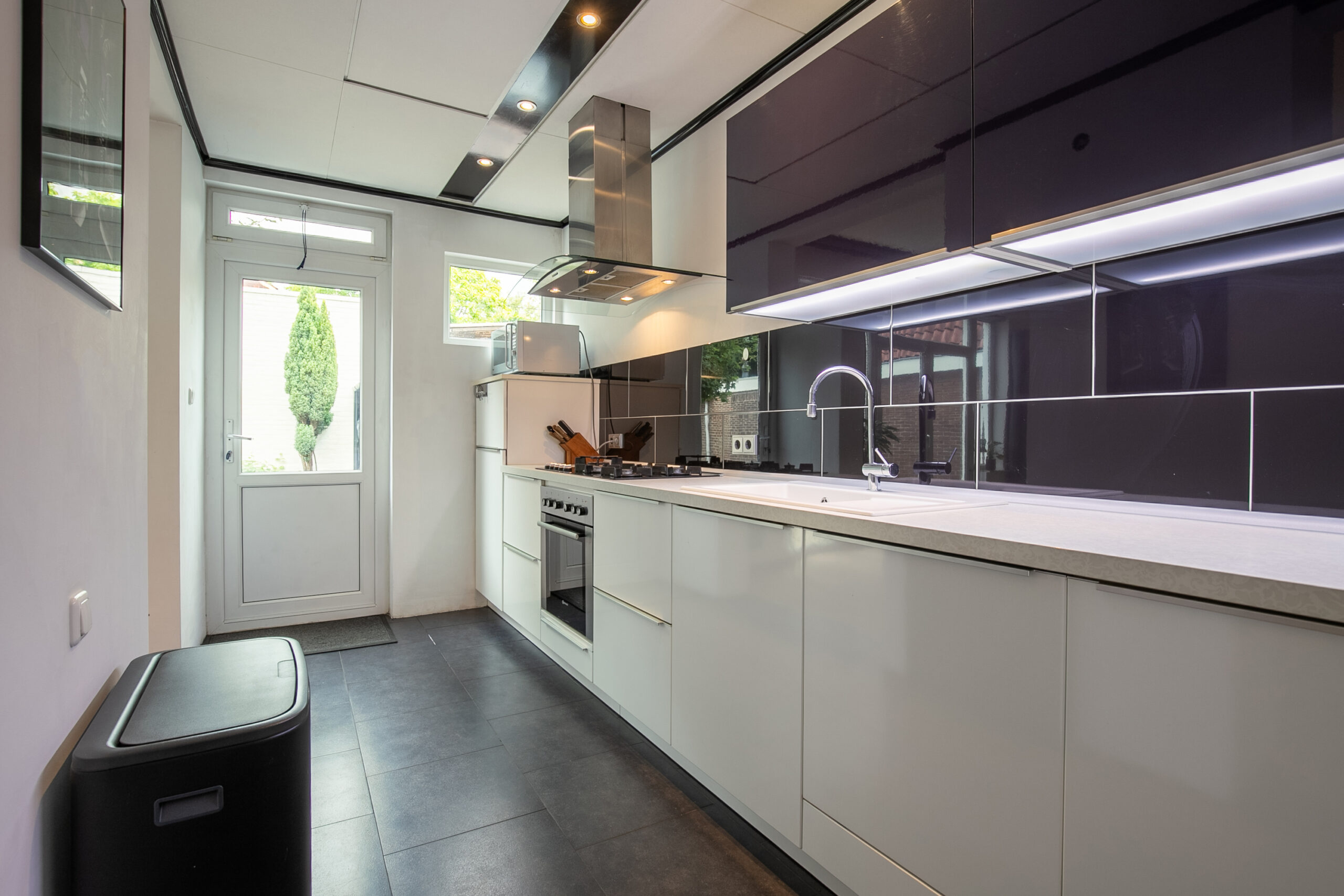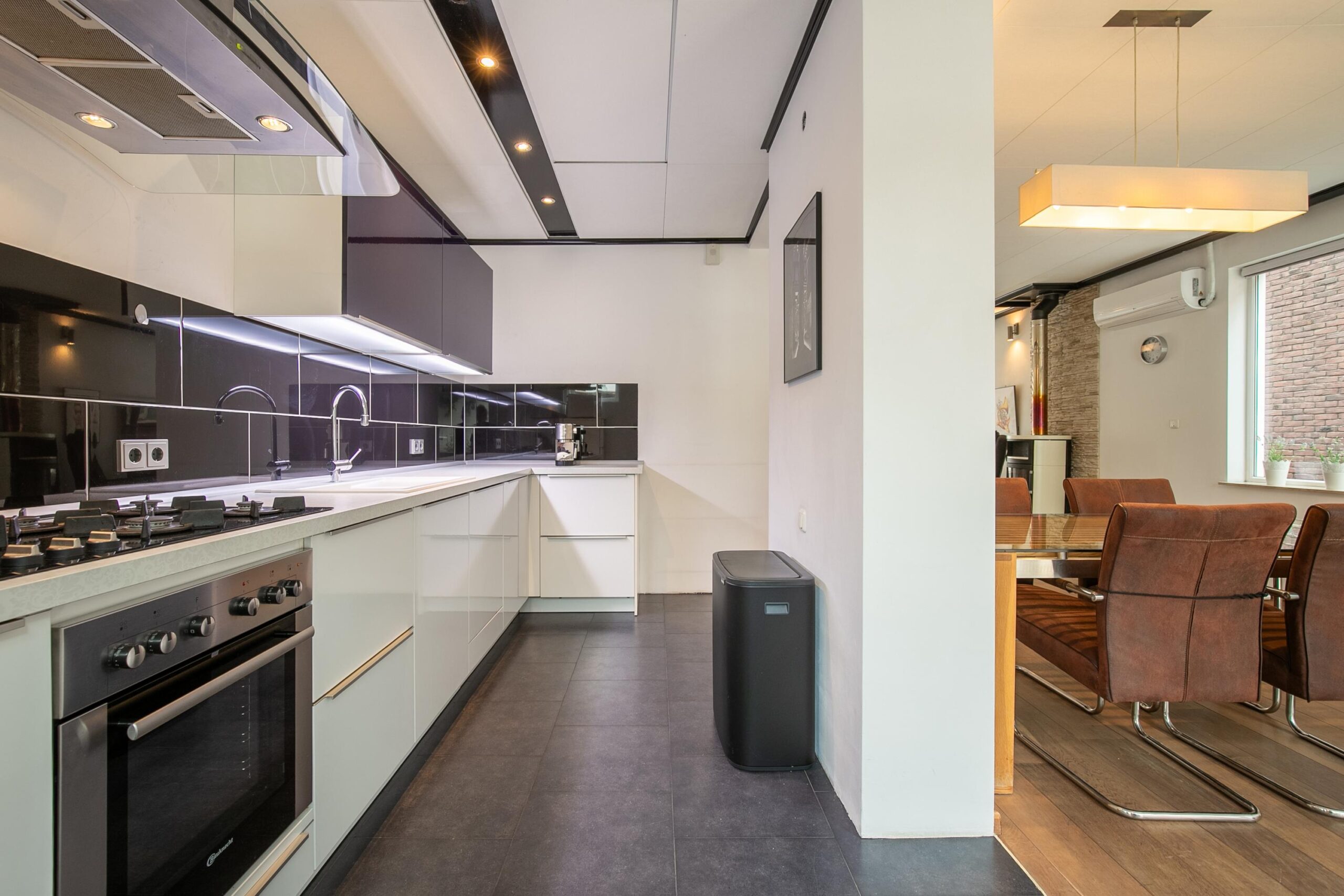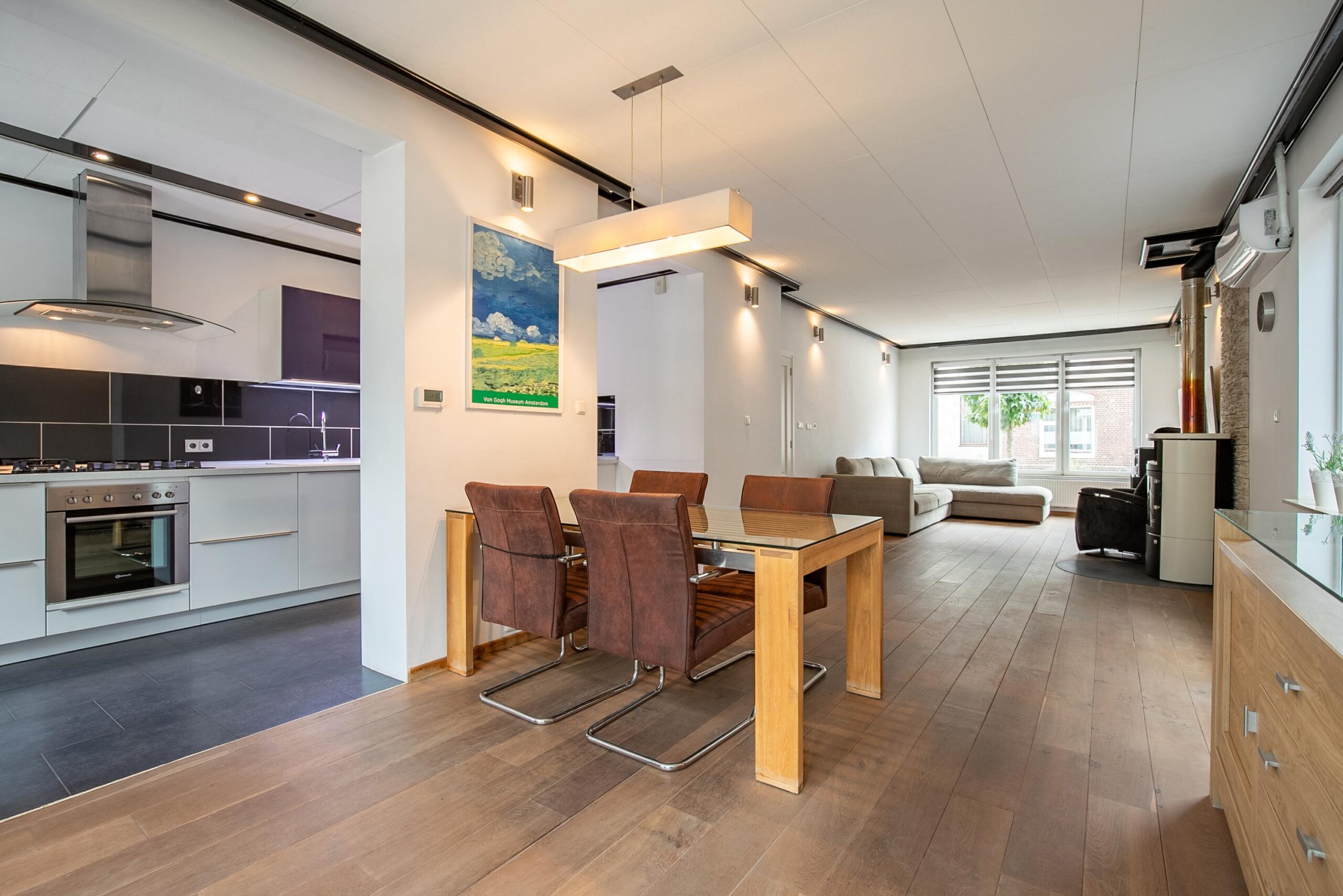 Via de hal met meterkast, garderobenis en trapopgang bereikt u de ruime woonkamer met halfopen keuken. De woonkamer is voorzien van een moderne, hoog efficiënte hout- en kolenkachel, een airconditioning, een akoestisch plafond en een mooie eiken vloer. De keuken is uitgerust met een 5-pits gasfornuis, oven, vaatwasser, koel-/vriescombinatie, spoelbak, afzuigkap en inbouwspots. Vanuit zowel de woonkamer als de keuken is er directe toegang tot de achtertuin.