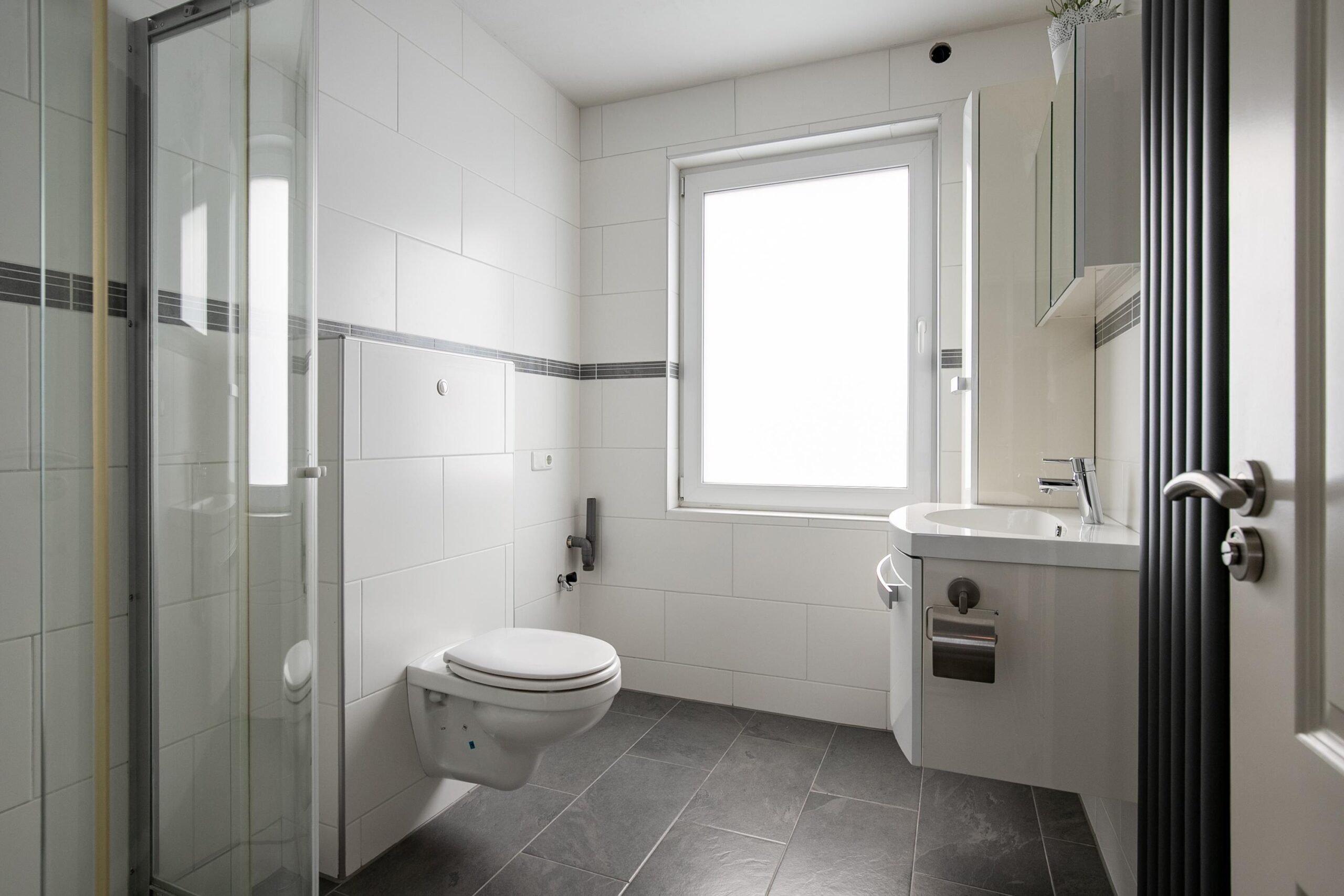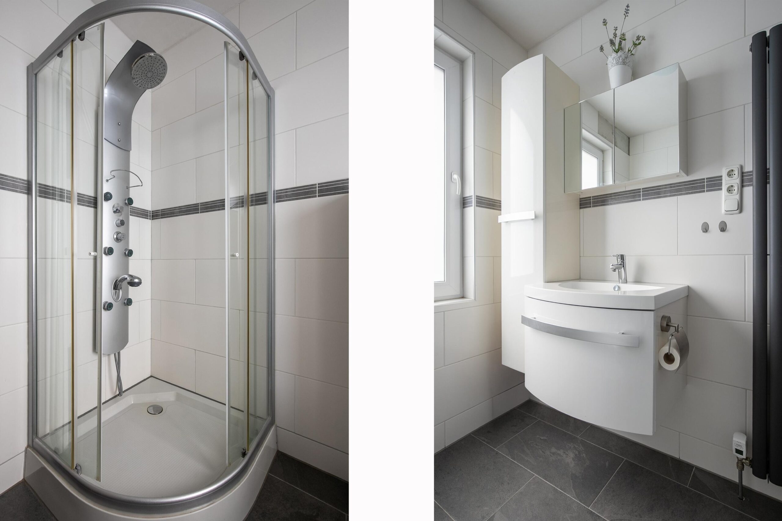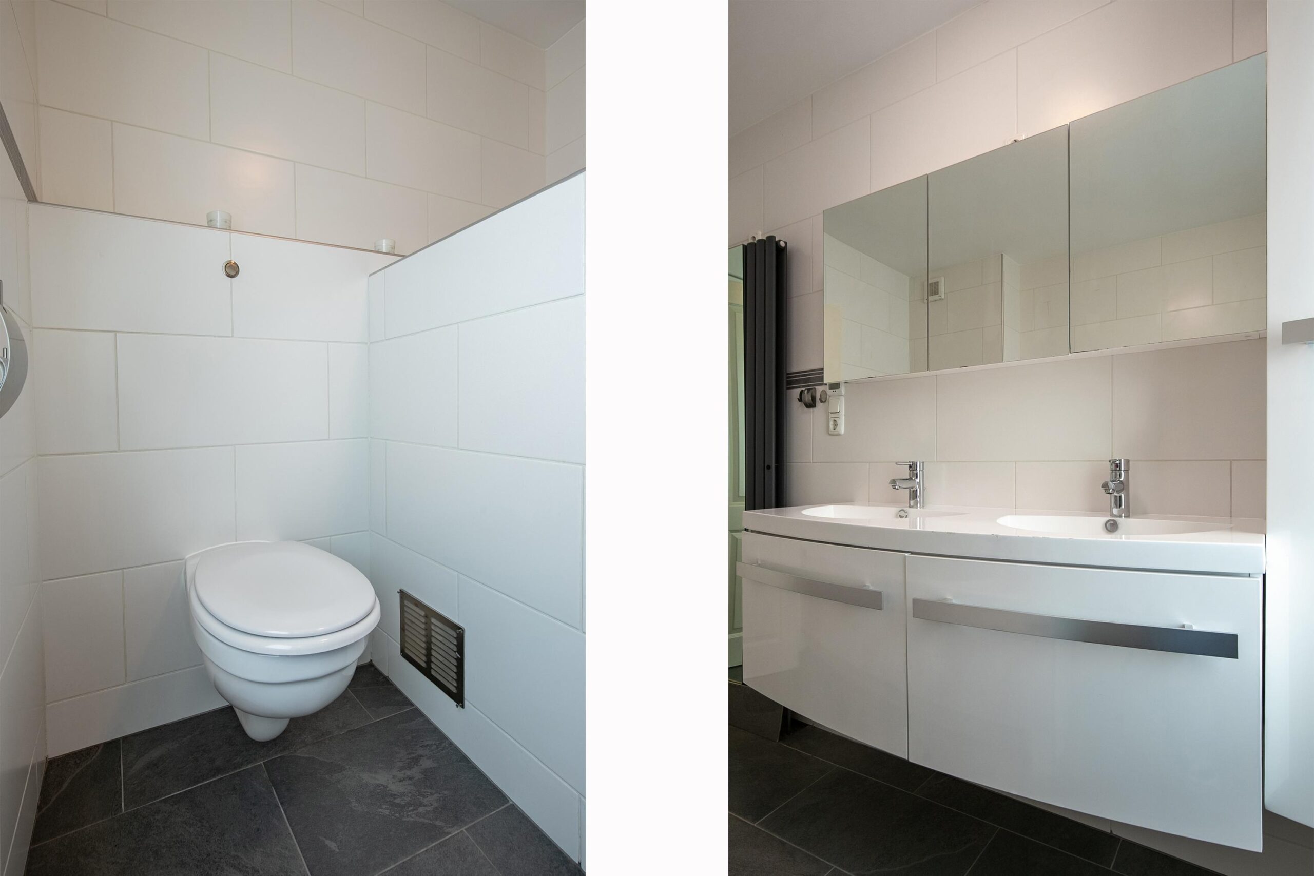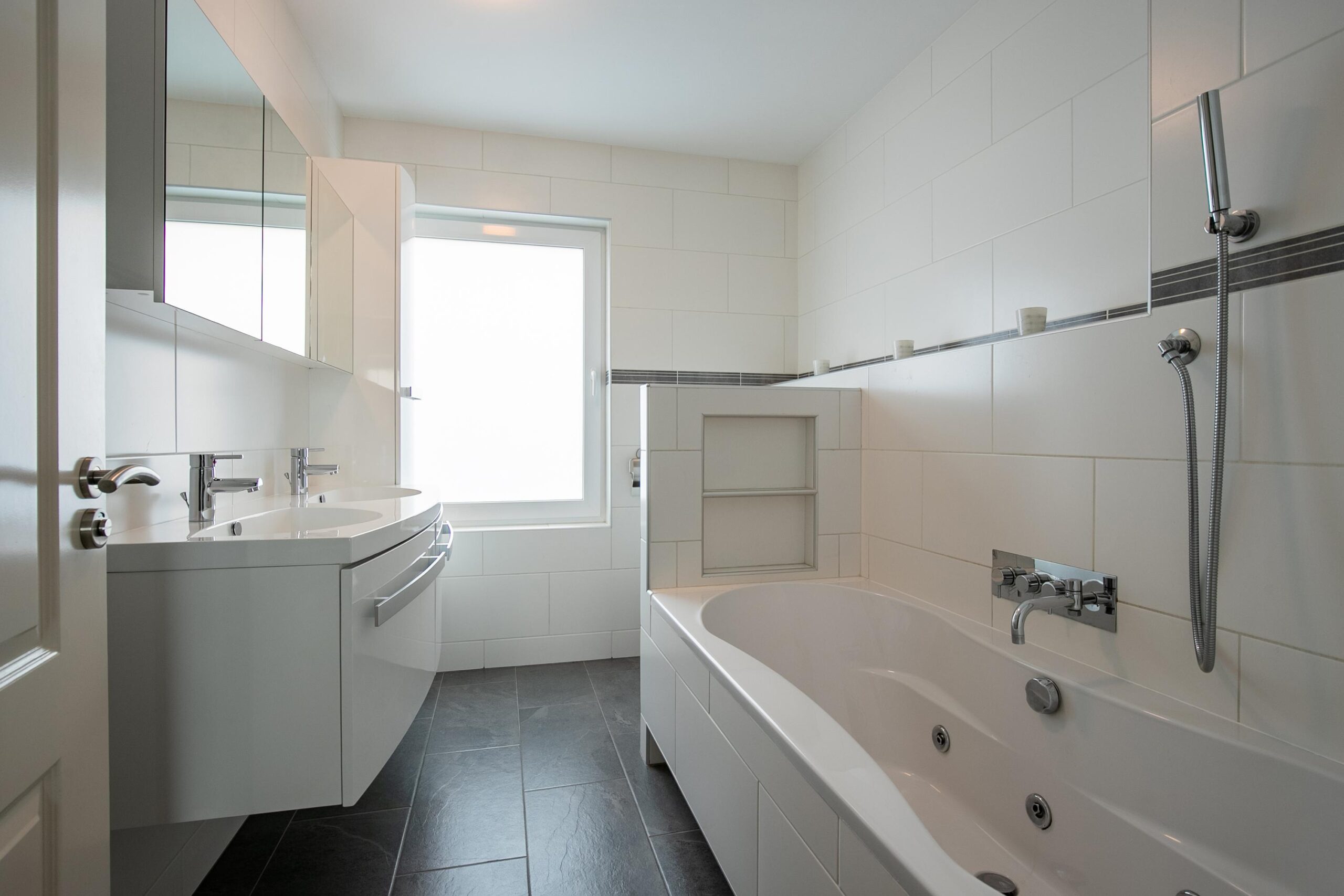 - Badkamervoorzieningen Ligbad, toilet, dubbele wastafel, toilet, douche, wastafel