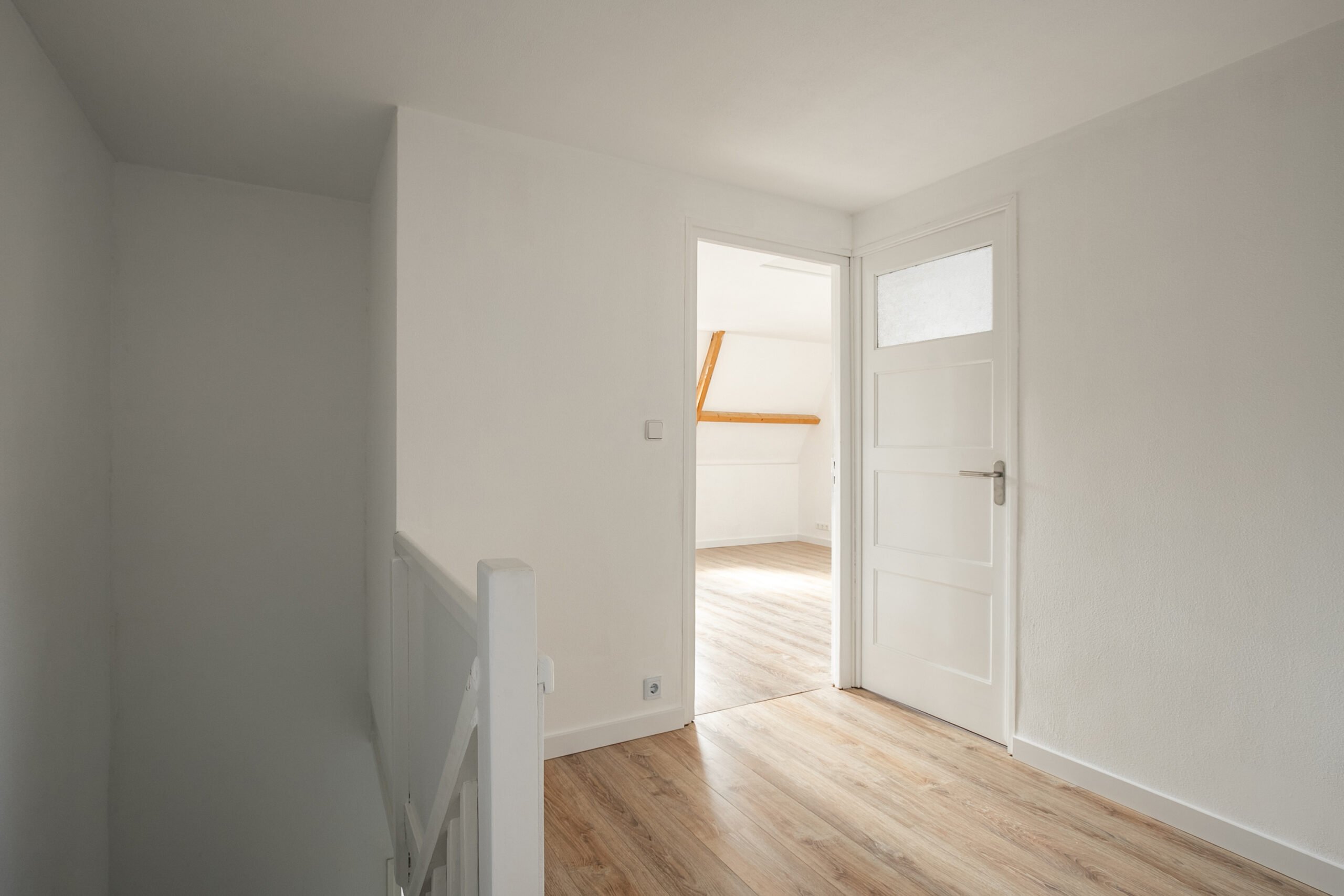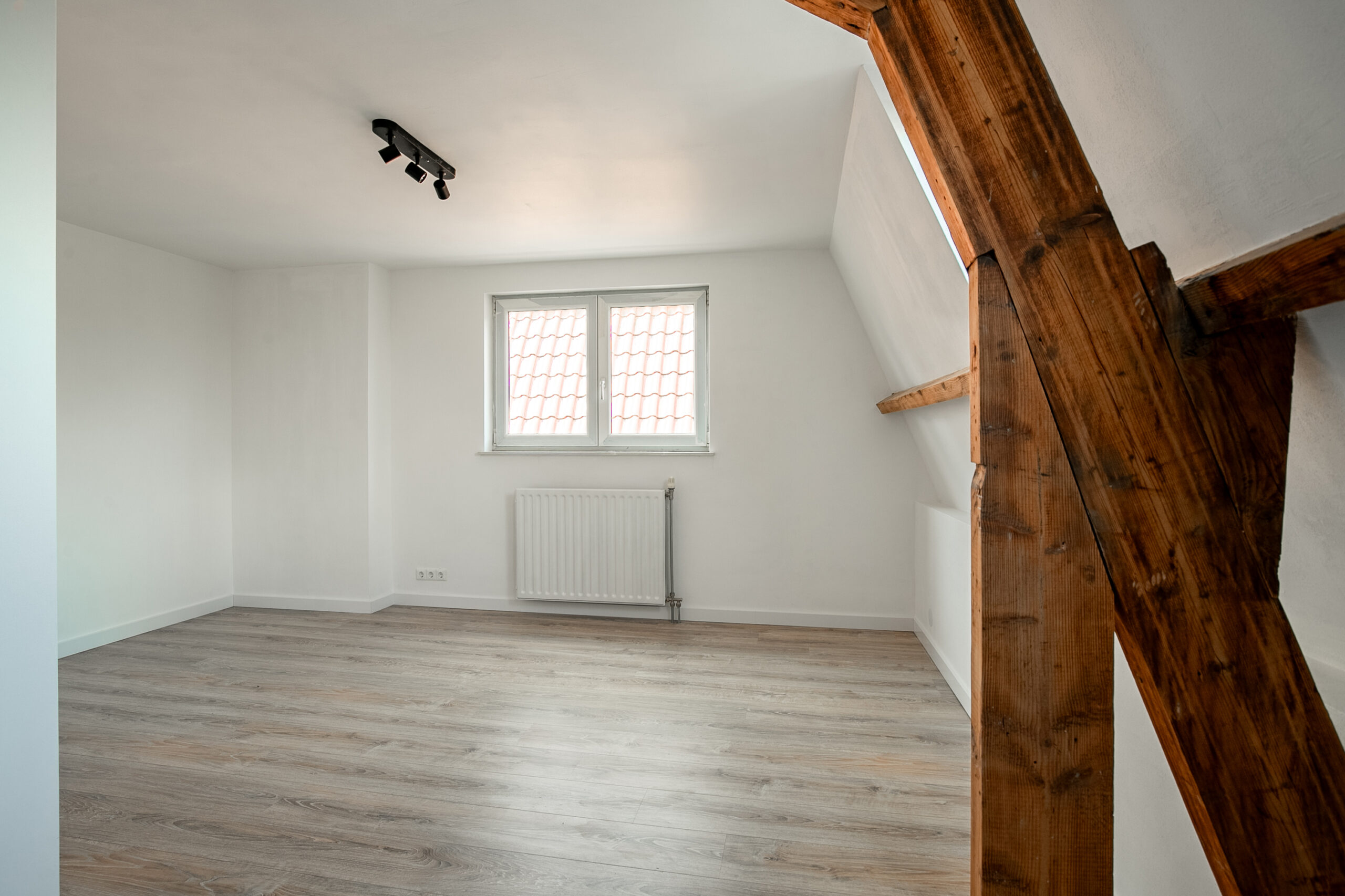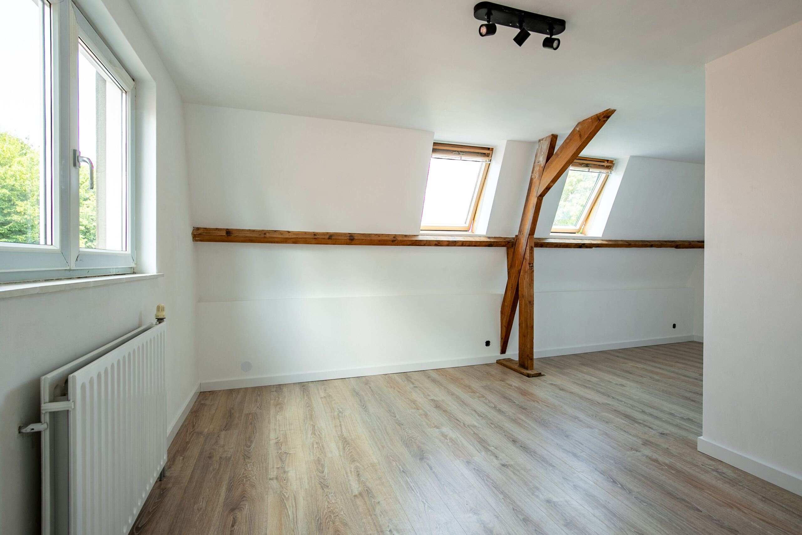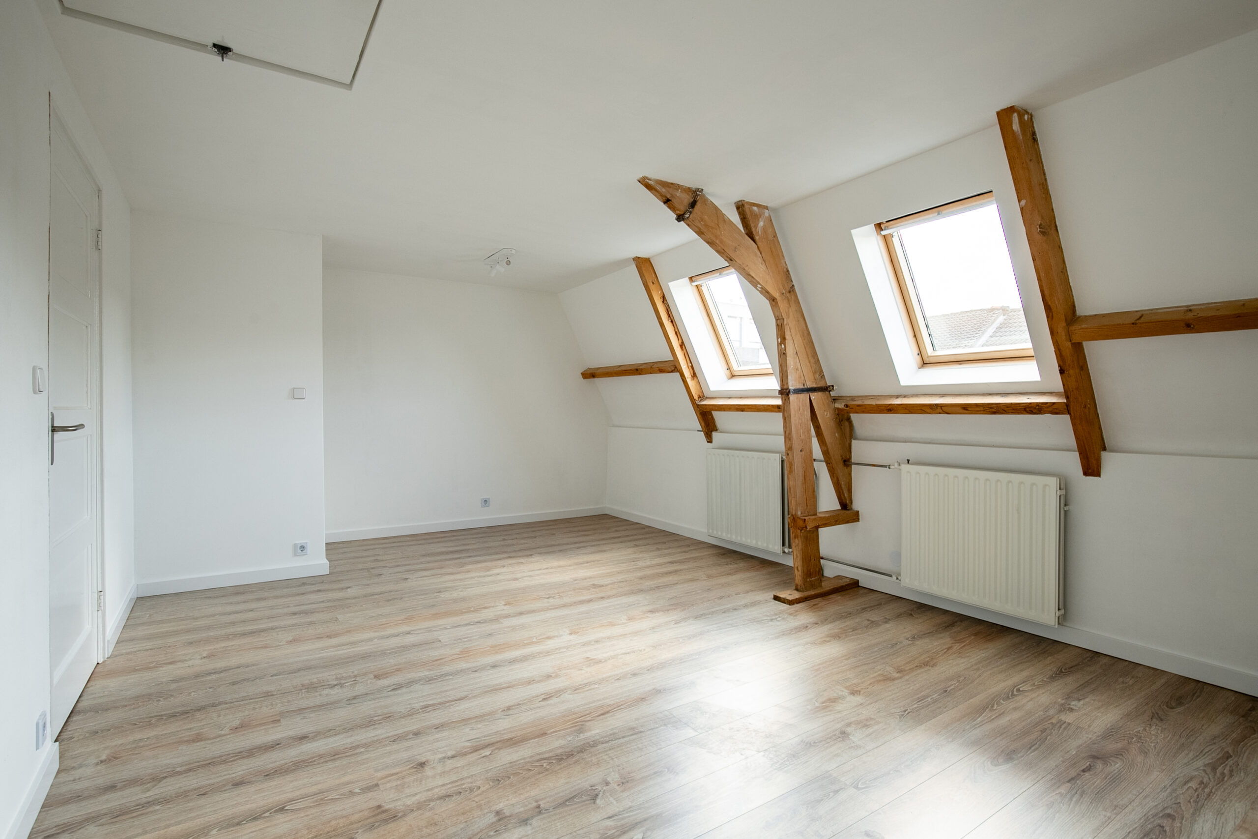 De zolderverdieping is volledig gerenoveerd en ademt nog de sfeer van de authentieke elementen. Hier zijn twee ruime slaapkamers gerealiseerd. De slaapkamer aan de voorzijde beschikt over twee Velux-dakramen en een vlizotrap naar de bergzolder (stahoogte ca. 1,80 m). De slaapkamer aan de achterzijde is L-vormig en voorzien van twee dakramen en een kunststof kozijn.
