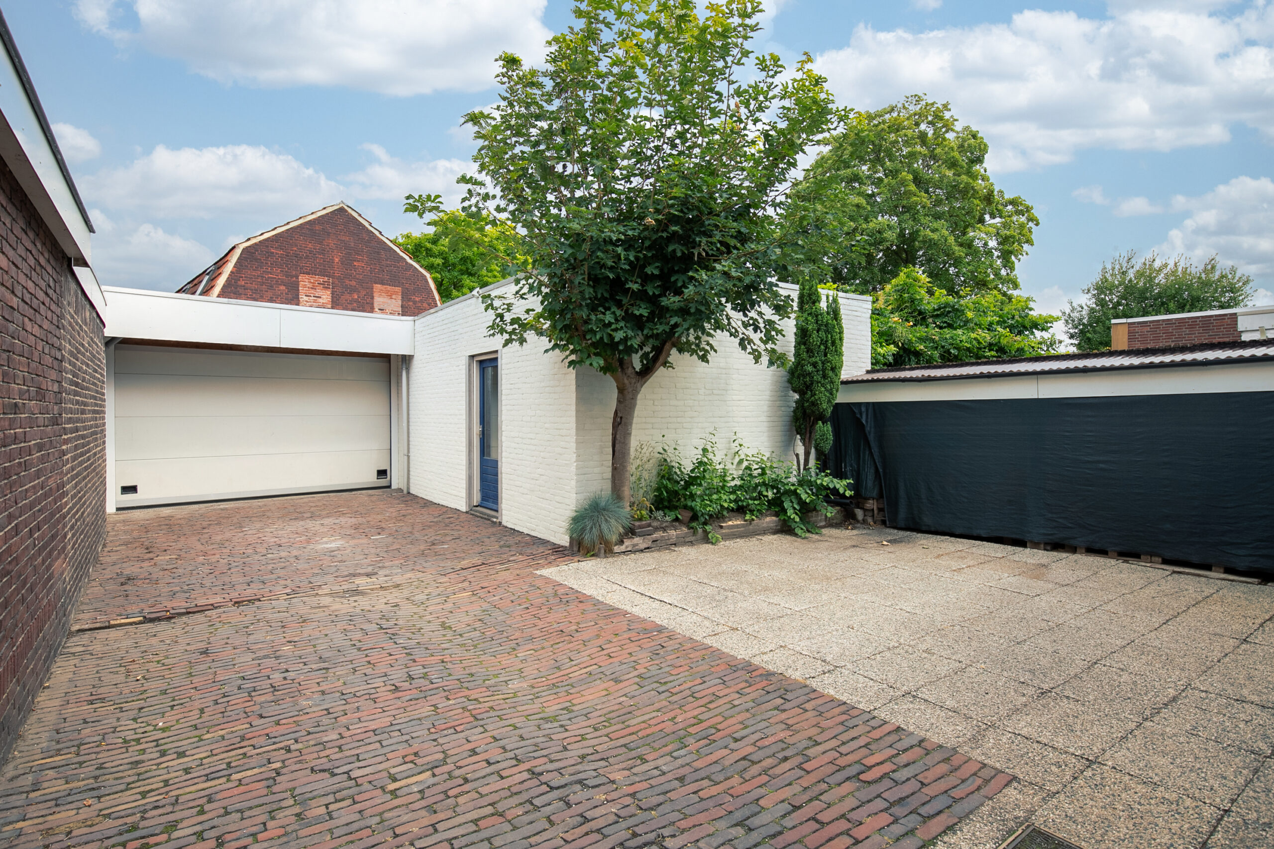 De tuin is volledig bestraat en beschikt over een royale garage (ca. 10 jaar oud) met sectionaalpoort, smeerput, twee compartimenten en zelfs een eigen toiletruimte. Daarnaast is er een oprit aan de zijkant van de woning.