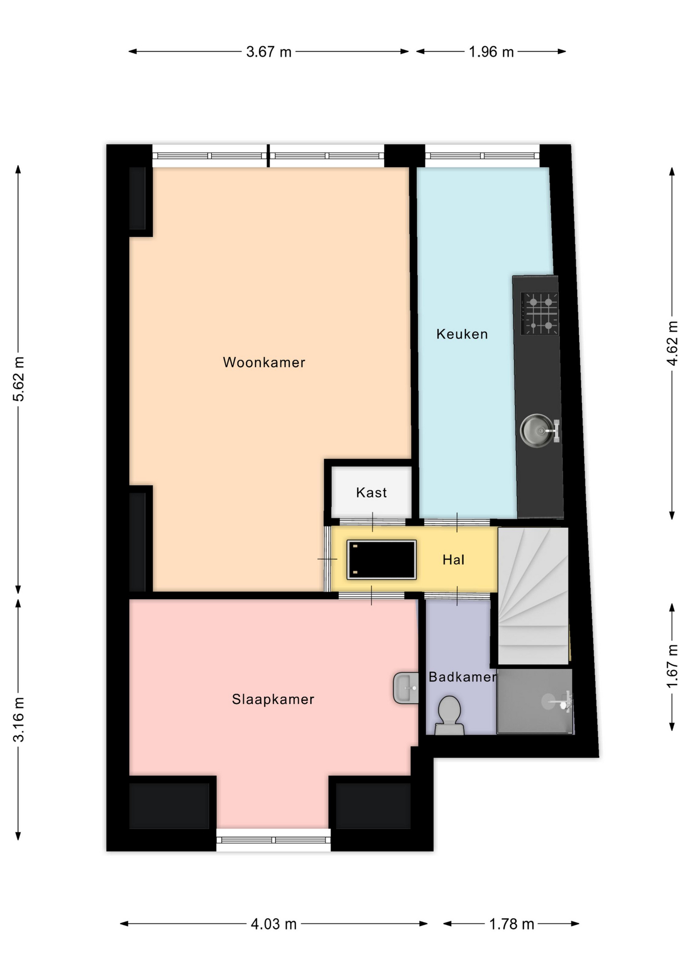 Via de trap bereikt men het appartement. Binnenkomst in een overloop met toegang tot de keuken, woonkamer, ingebouwde kast, slaapkamer, badkamer en de vlizotrap naar de bergzolder. De woonkamer (ca. 20 m²), voorzien van een laminaatvloer, biedt een prettige lichtinval en ruimte voor zowel een eethoek als een zitgedeelte. De gesloten keuken (ca. 9 m²) in lijnopstelling is uitgerust met een 4-pits gaskookplaat, spoelbak, afzuigkap, vrijstaande koelkast en een wasmachine. Daarnaast is de keuken voorzien van een donkere plavuizenvloer en is er ruimte voor een extra zithoek. De slaapkamer (ca. 9 m²) is ruim genoeg voor een tweepersoonsbed en een kledingkast. Ook deze ruimte is voorzien van een laminaatvloer en beschikt over een wastafel. De volledig betegelde badkamer (ca. 3 m²) is uitgerust met een toilet en een douche. Vanuit de hal is middels vlizotrap de vierde verdieping te bereiken welke uitermate geschikt is als bergruimte.