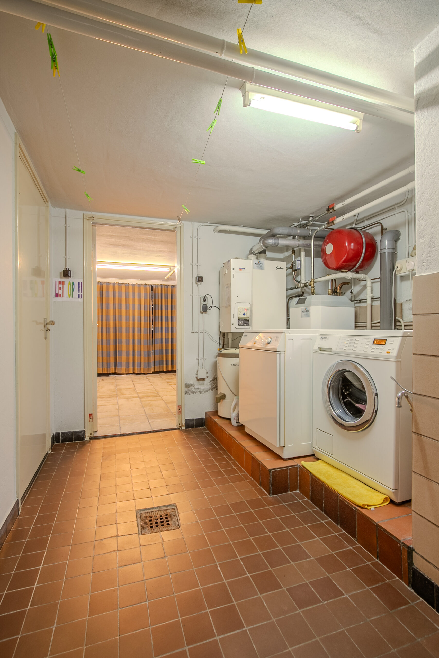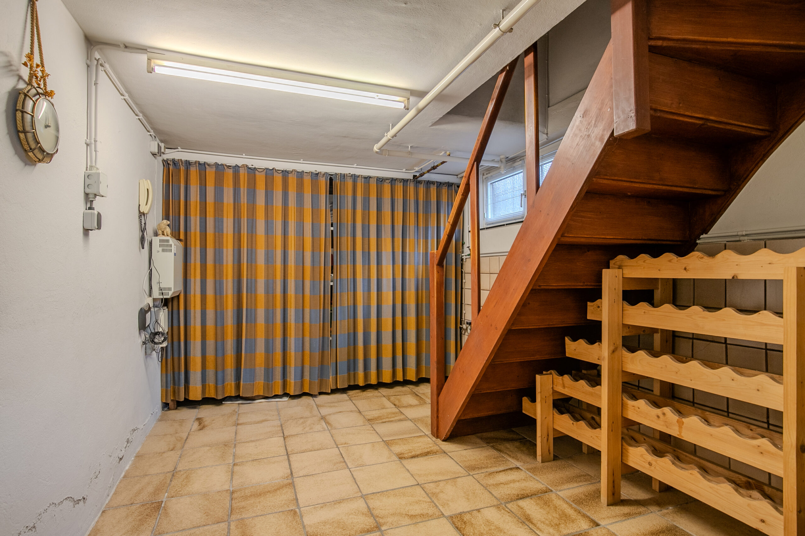 Vanuit de hal is het souterrain bereikbaar. De woning is geheel onderkelderd en voorzien van fijne kelderruimtes (circa 12 m2 en 8 m2), beiden voorzien van een tegelvloer en een inpandig bereikbare garage. Een van de ruimtes is voorzien van aansluitpunten voor het witgoed en opstelling cv-ketel (2001, eigendom, Nefit Excellent). Vanuit hier is ook een aparte toegang tot de achtertuin. Daarnaast is er een separaat toiletruimte, deels betegeld, voorzien van toilet en fonteintje. De inpandige garage is ruim opgezet, circa 29 m2 en voorzien van een elektrische sectionaal poort, elektra en wateraansluiting. Door de aparte ingang vanuit de tuin, een eigen toilet in het souterrain, is er ook een mogelijk om een beroep of praktijk aan huis uit te oefenen.