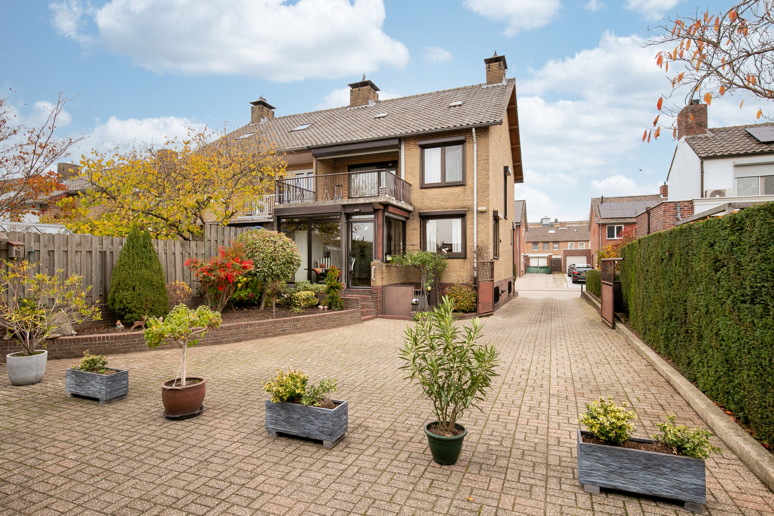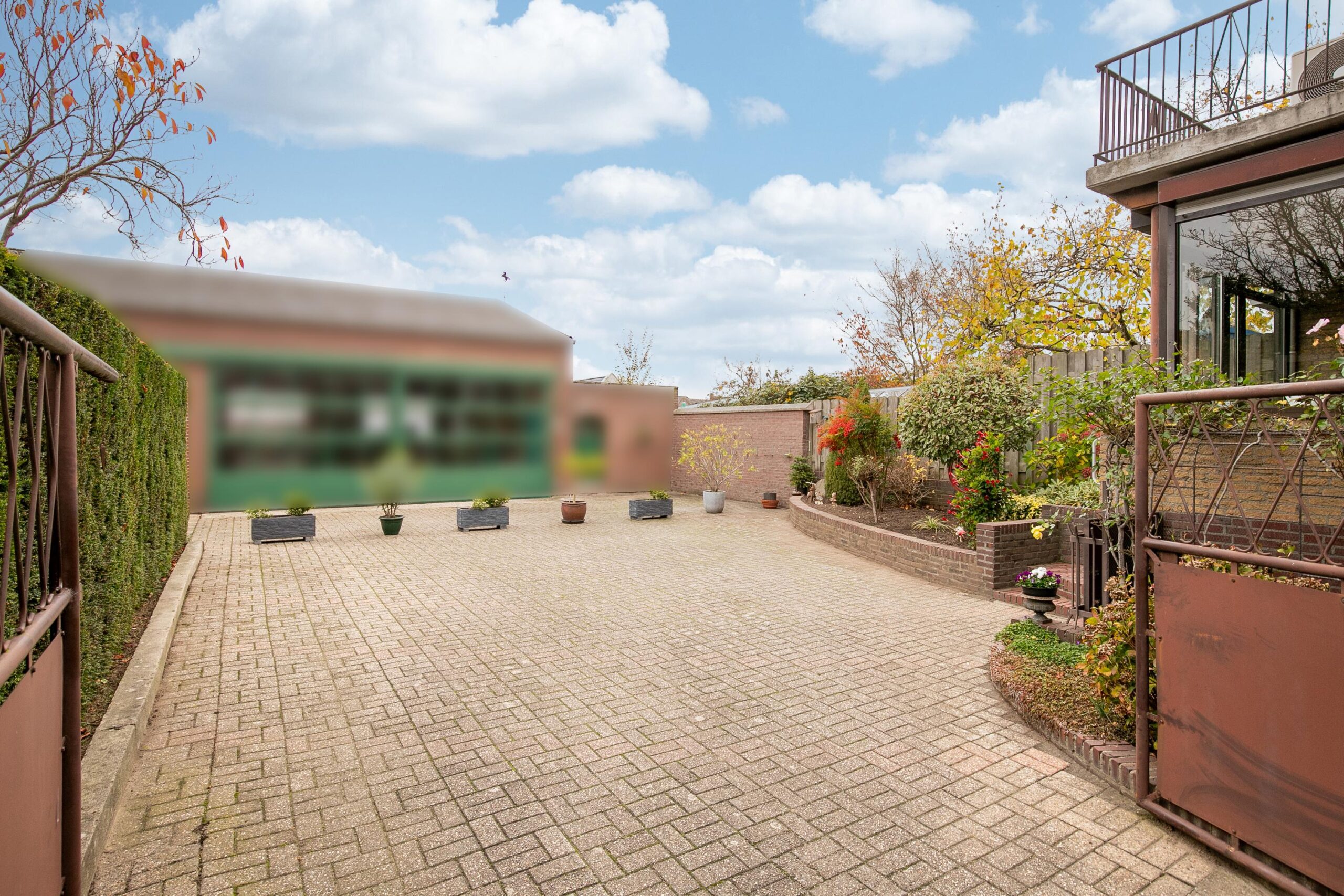 De achtertuin is onderhoudsvriendelijk aangelegd en grotendeels beklinkerd en westelijk georiënteerd. De bloembakken op de foto geven indicatief weer waar de erfgrens is. Er zal medio december 2025 door achterbuurman een schutting geplaatst worden (een composieten, antracieten schutting). De tuin is achterom bereikbaar middels de brede oprit met poort. Er is een lange oprit alwaar plek is voor meerdere auto’s.