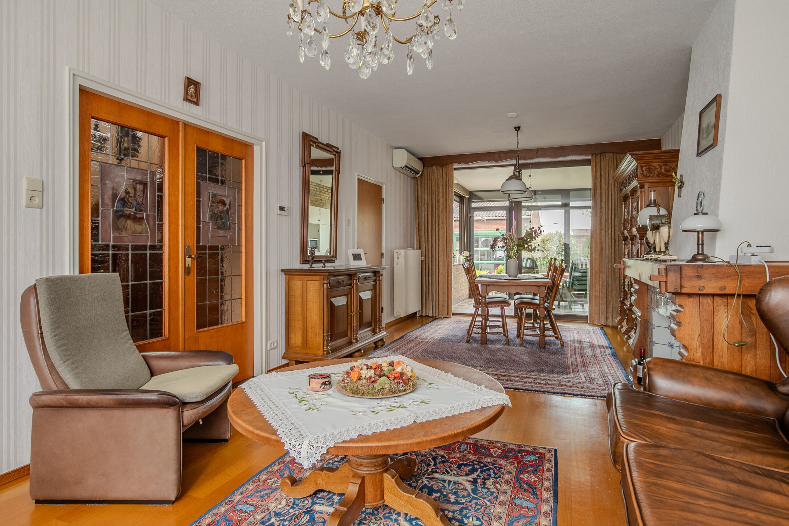 Entree/hal voorzien van tegelvloer met meterkast, trapopgang en toegang tot de woonkamer, keuken, kelder en toilet. Betegelde toiletruimte voorzien van zwevend closet en fonteintje. Fijne woonkamer (circa 30 m2) voorzien van een parketvloer met vloerverwarming, airco-installatie, schouw en toegang tot de serre en de keuken. Door de grote raampartijen is er prettig lichtinval. Aan de achterzijde is er middels schuifpui toegang tot de serre/tuinkamer. Deze is circa 14 m2 en geeft mooi zicht op de achtertuin. Gesloten keuken (ca. 10 m2) die is voorzien van een hoekopstelling met vaatwasser, oven, twee koelkasten, spoelbak, 4-pits kookplaat, afzuiging en diverse opbergkastjes en lades. Ook de keuken geeft toegang tot de serre/tuinkamer.