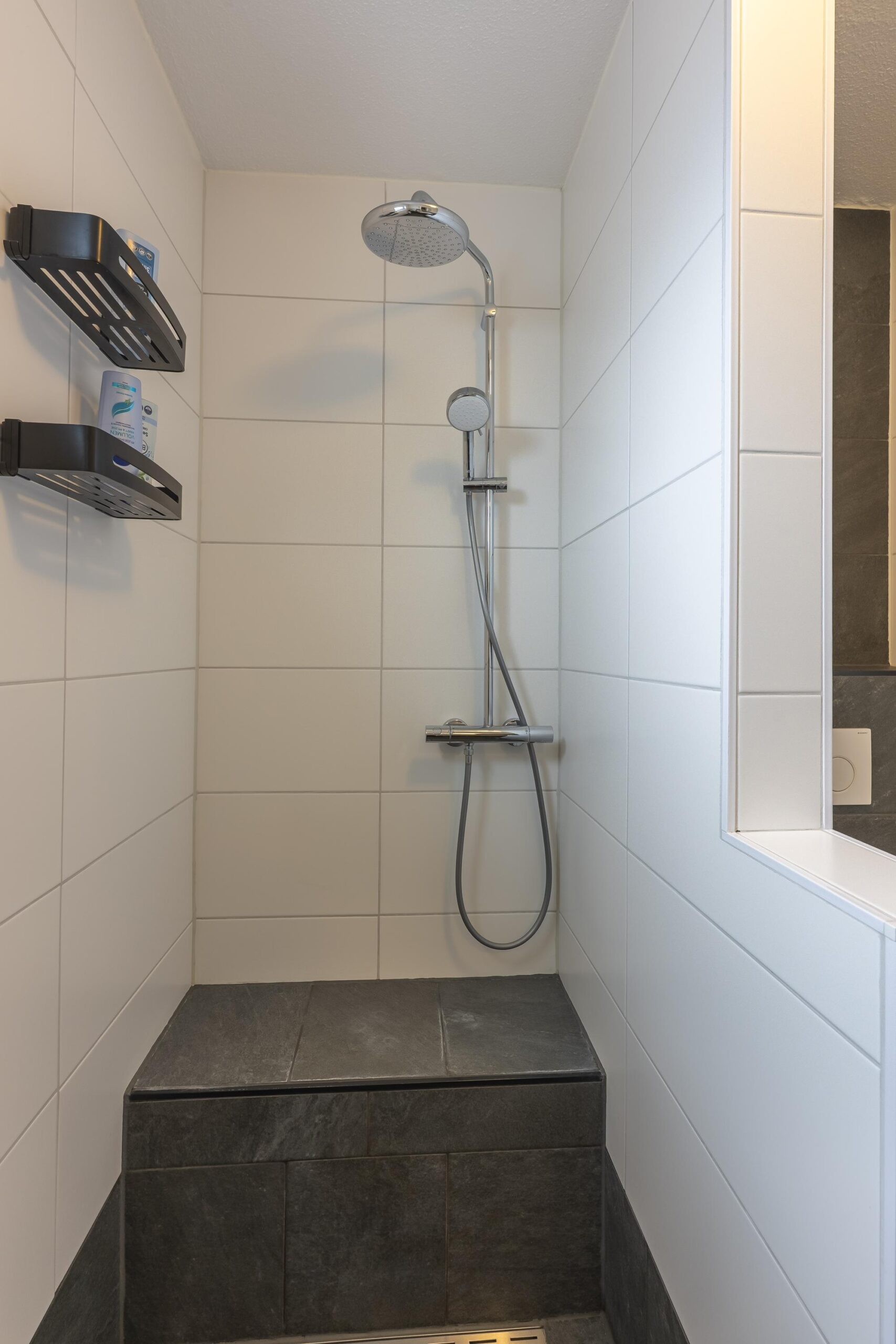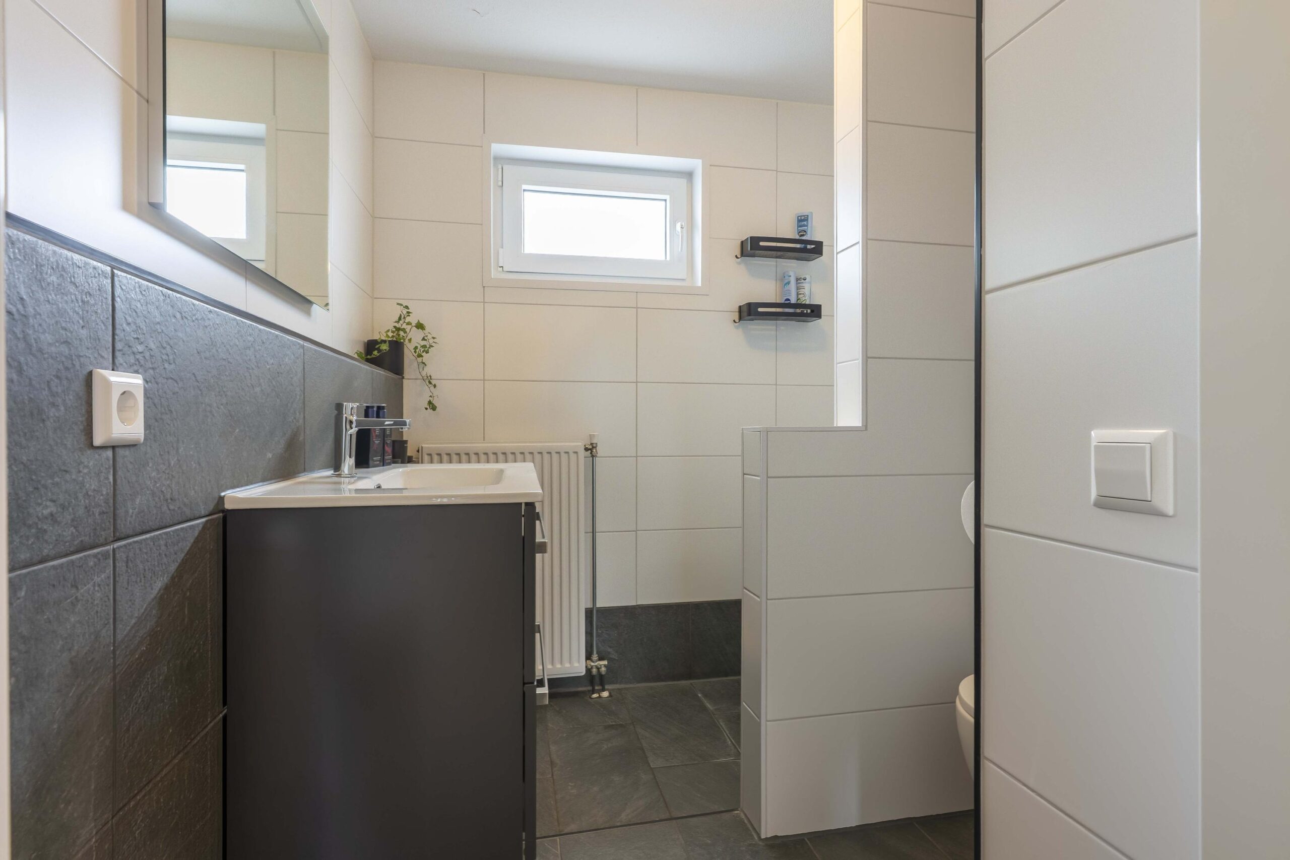 De luxe, volledig betegelde badkamer beschikt over een tweede vrijhangend toilet, een royale inloopregendouche en een stijlvol wastafelmeubel.
