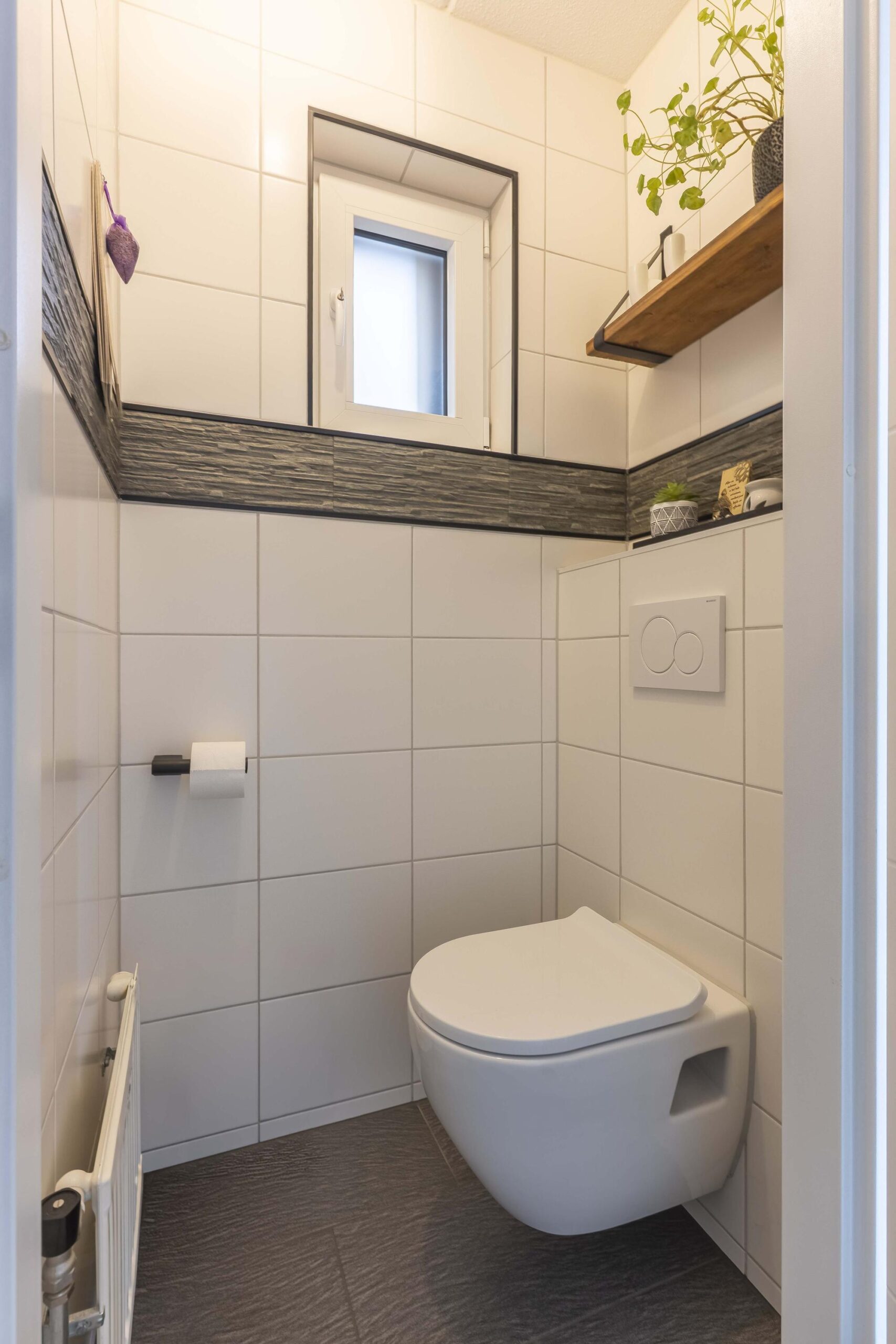 Via de voortuin bereikt u de entree/hal met vernieuwde meterkast en modern geheel betegeld vrijhangend toilet. Vanuit de hal toegang tot de sfeervolle living via een stijlvolle zwarte glazendeur.