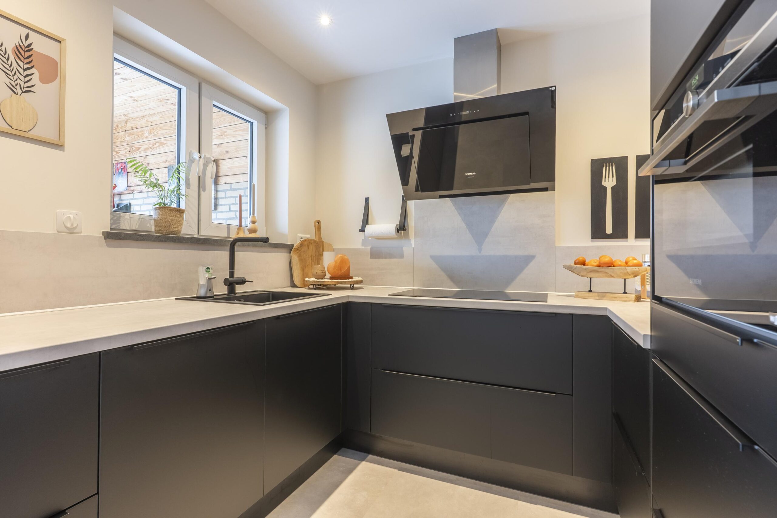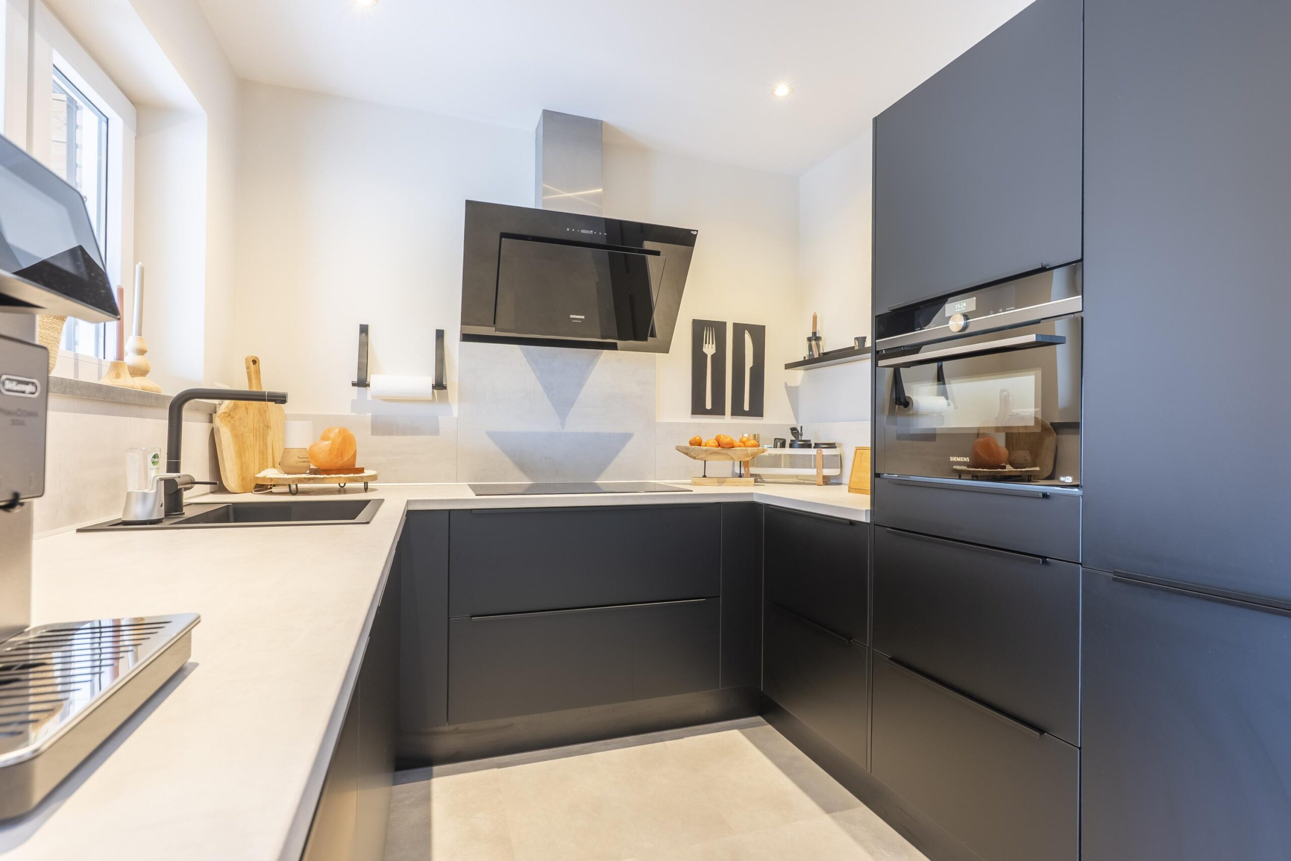 De woning beschikt over een ruime leefkeuken in de aanbouw met luxe moderne keukeninstallatie voorzien van Studioline Siemens inbouwapparatuur, waaronder: 90 cm inductiekookplaat, design afzuigkap, oven, vaatwasser en spoelbak.