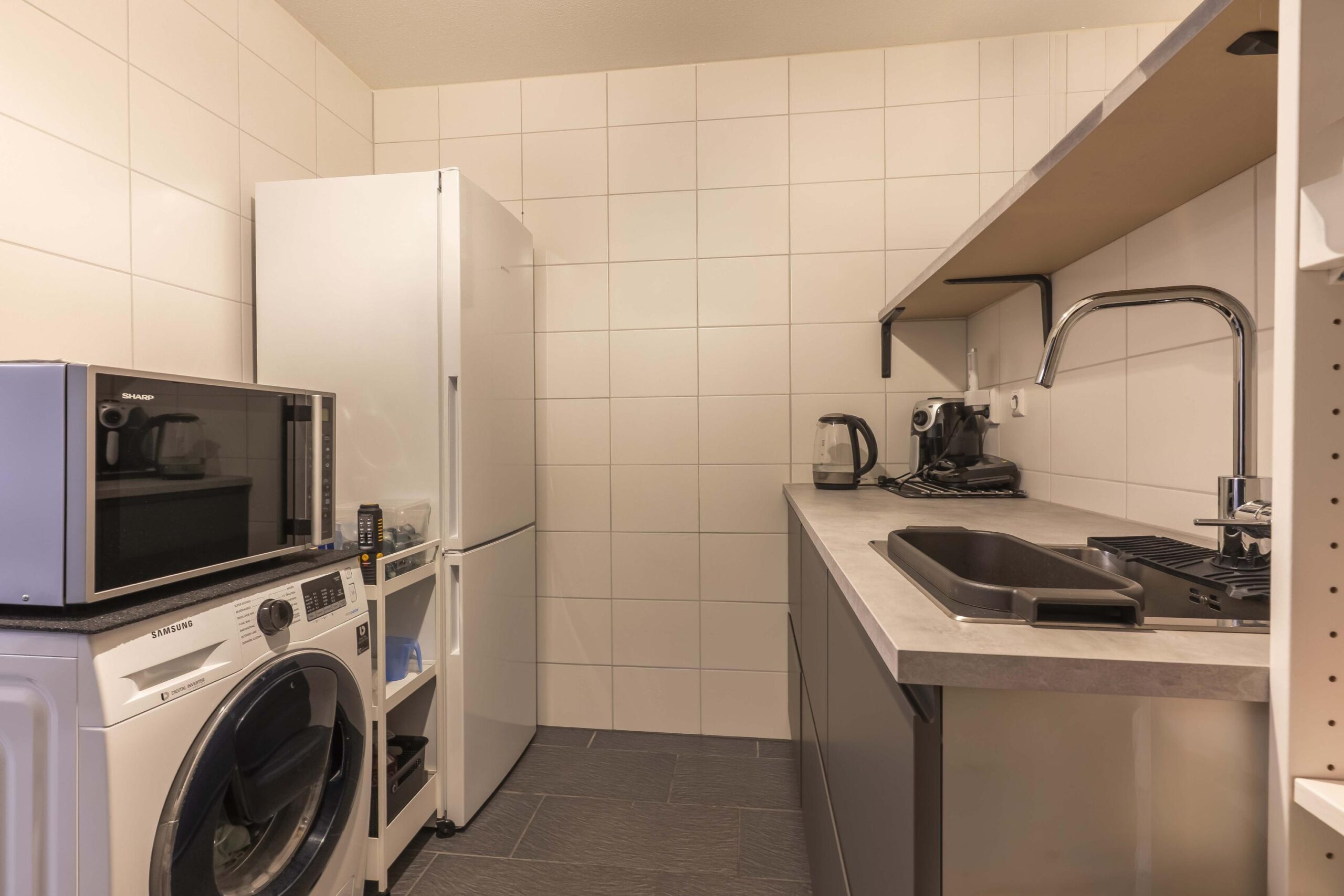 Aansluitend bevindt zich een volledig betegelde en praktisch ingerichte bijkeuken met extra aanrechtunit en wasmachine-opstelling.