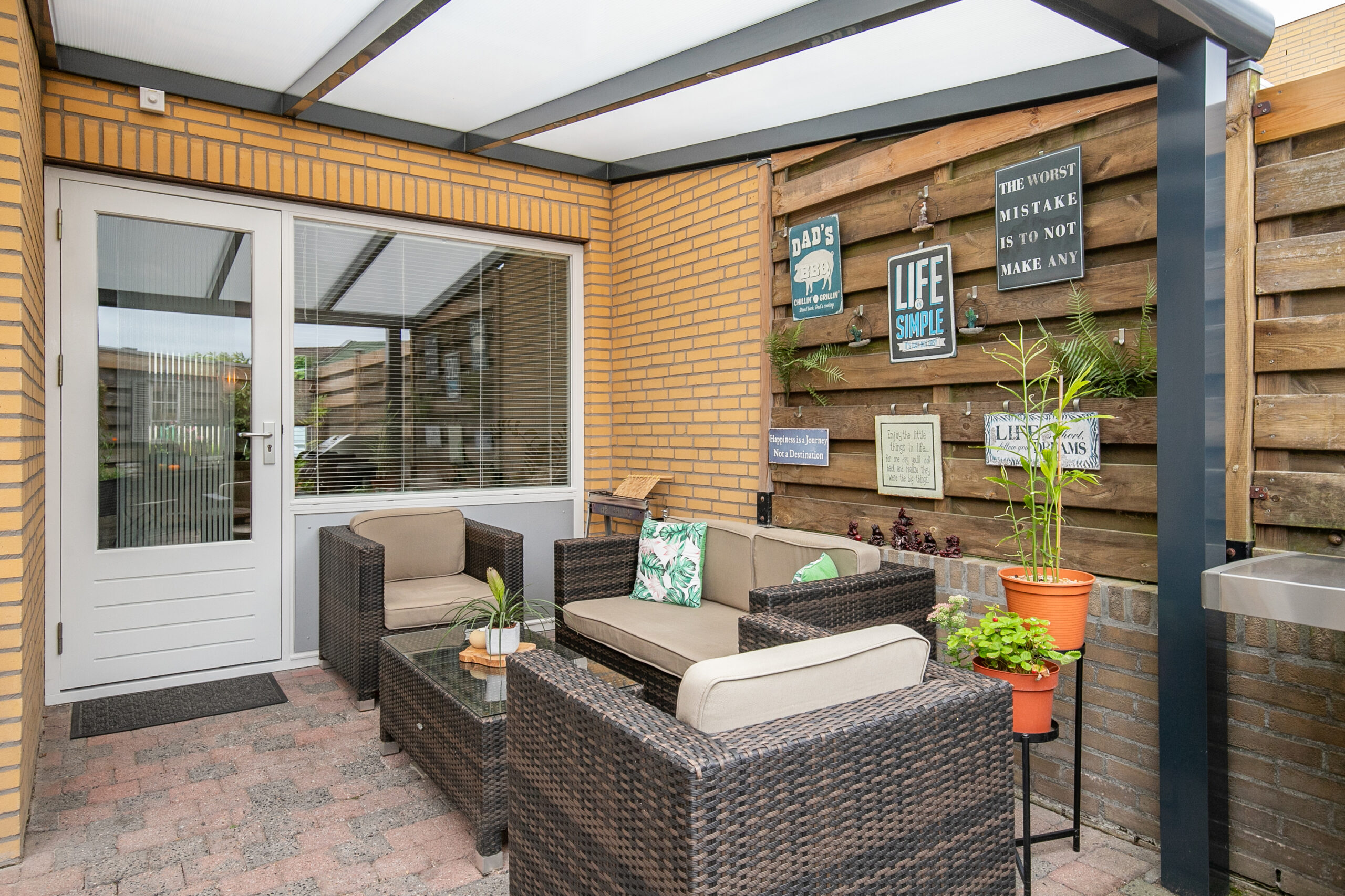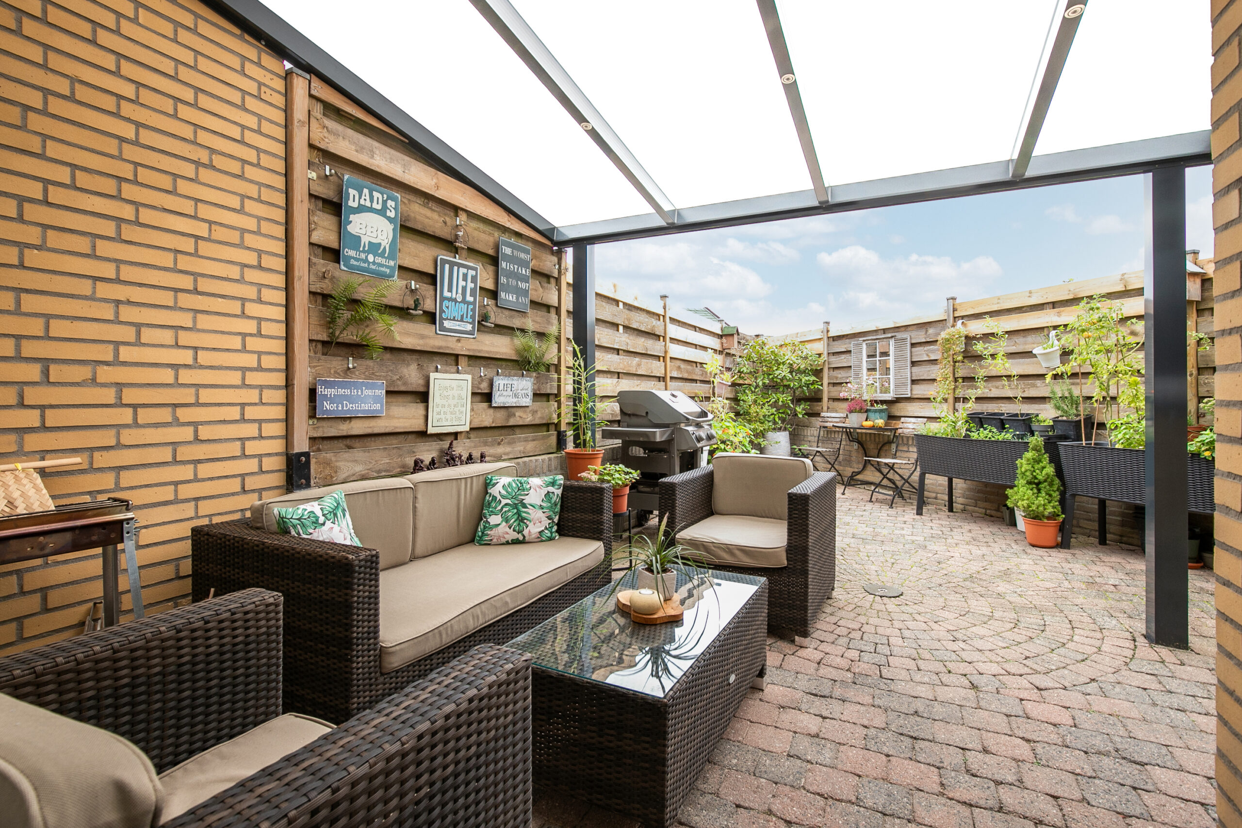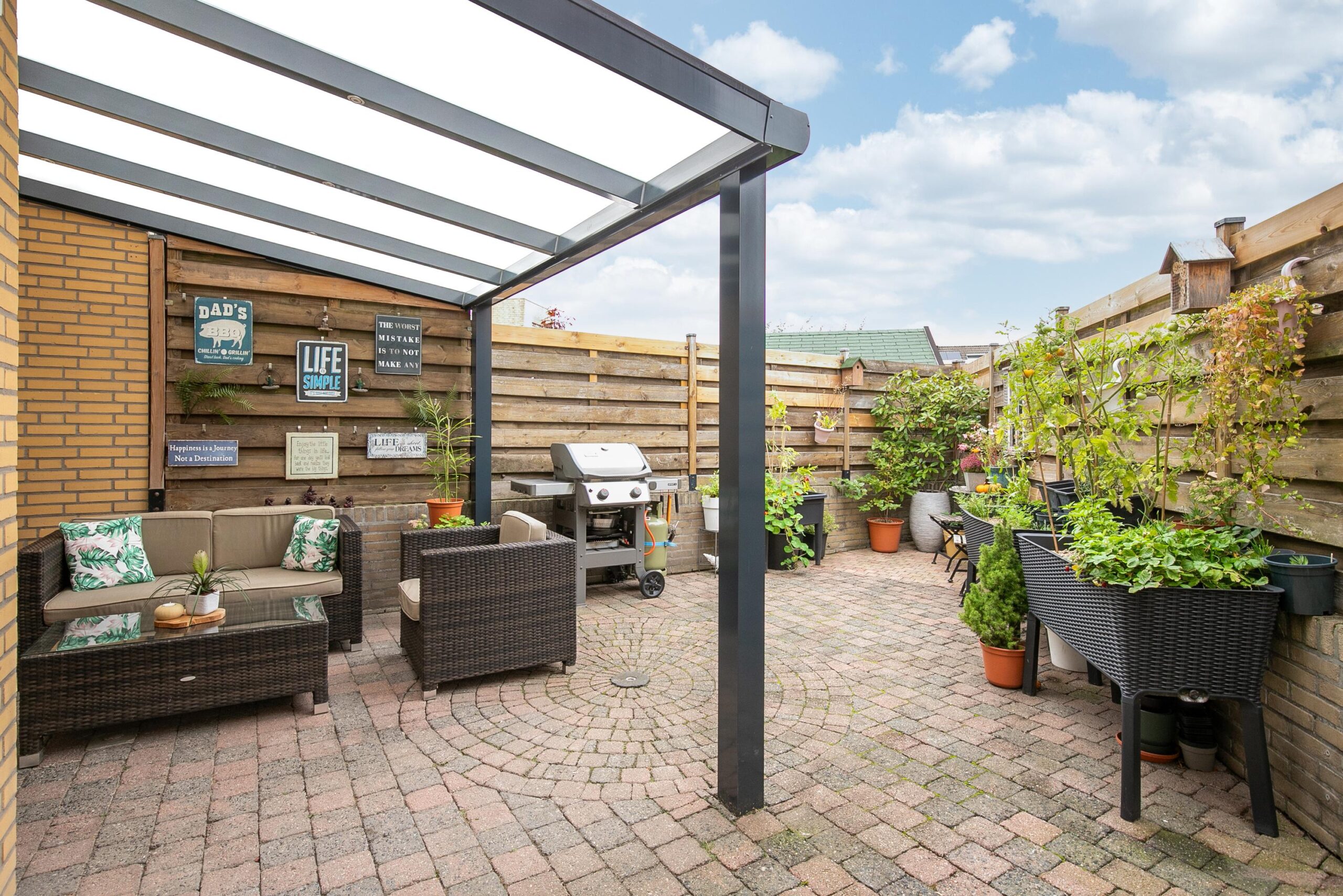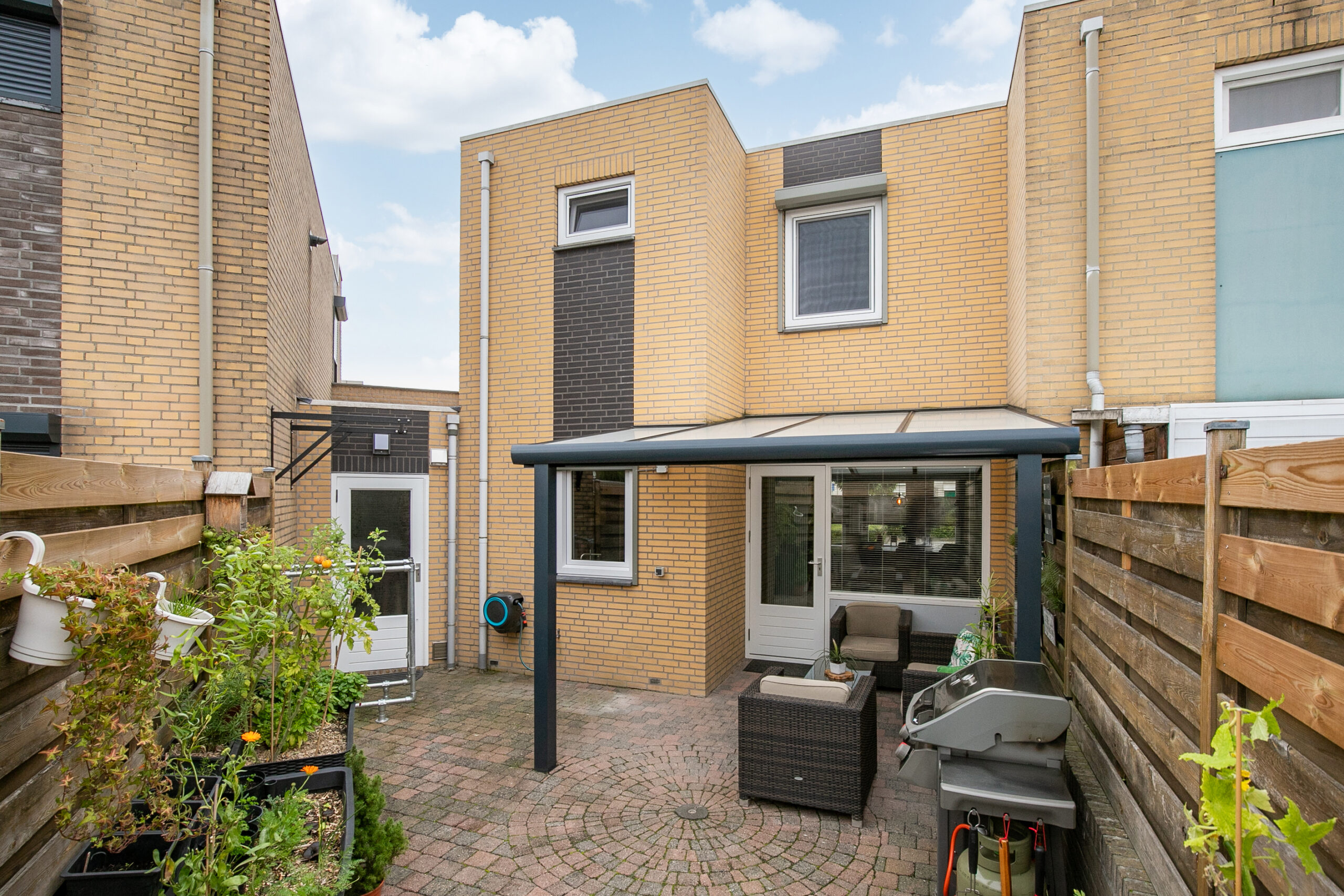De sfeervolle stadstuin is voorzien van een moderne antracietkleurige terrasoverkapping met led-inbouwspots. Dankzij de goede mate van privacy en het beklinkerde terras is dit een knusse plek om te ontspannen.