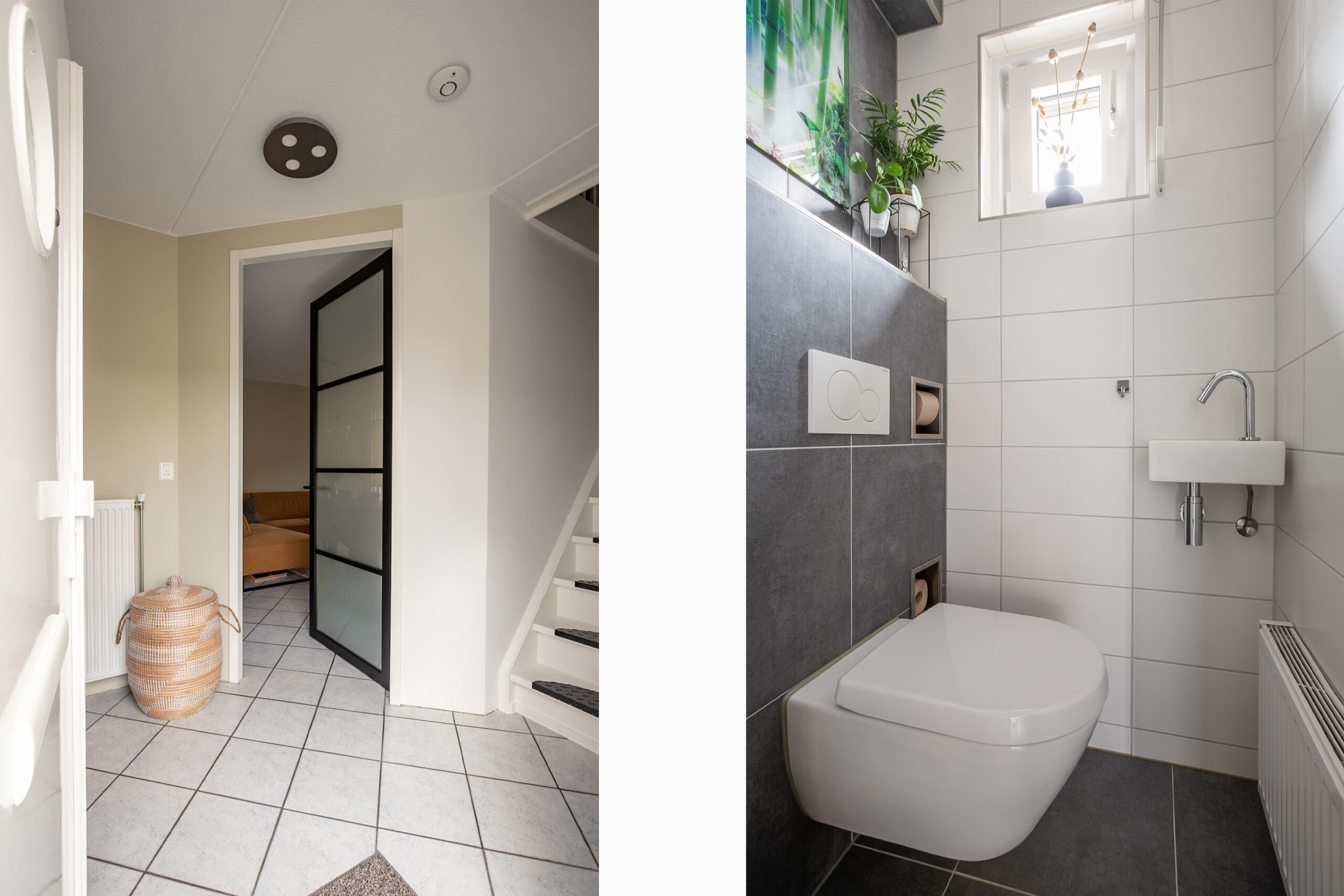 Via de oprit bereikt men de entree van de woning. Ontvangsthal met garderobenis, trap naar eerste verdieping, de meterkast en een modern, geheel betegeld toilet met vrijhangend closet, fonteintje, radiator en raam voor natuurlijke ventilatie.