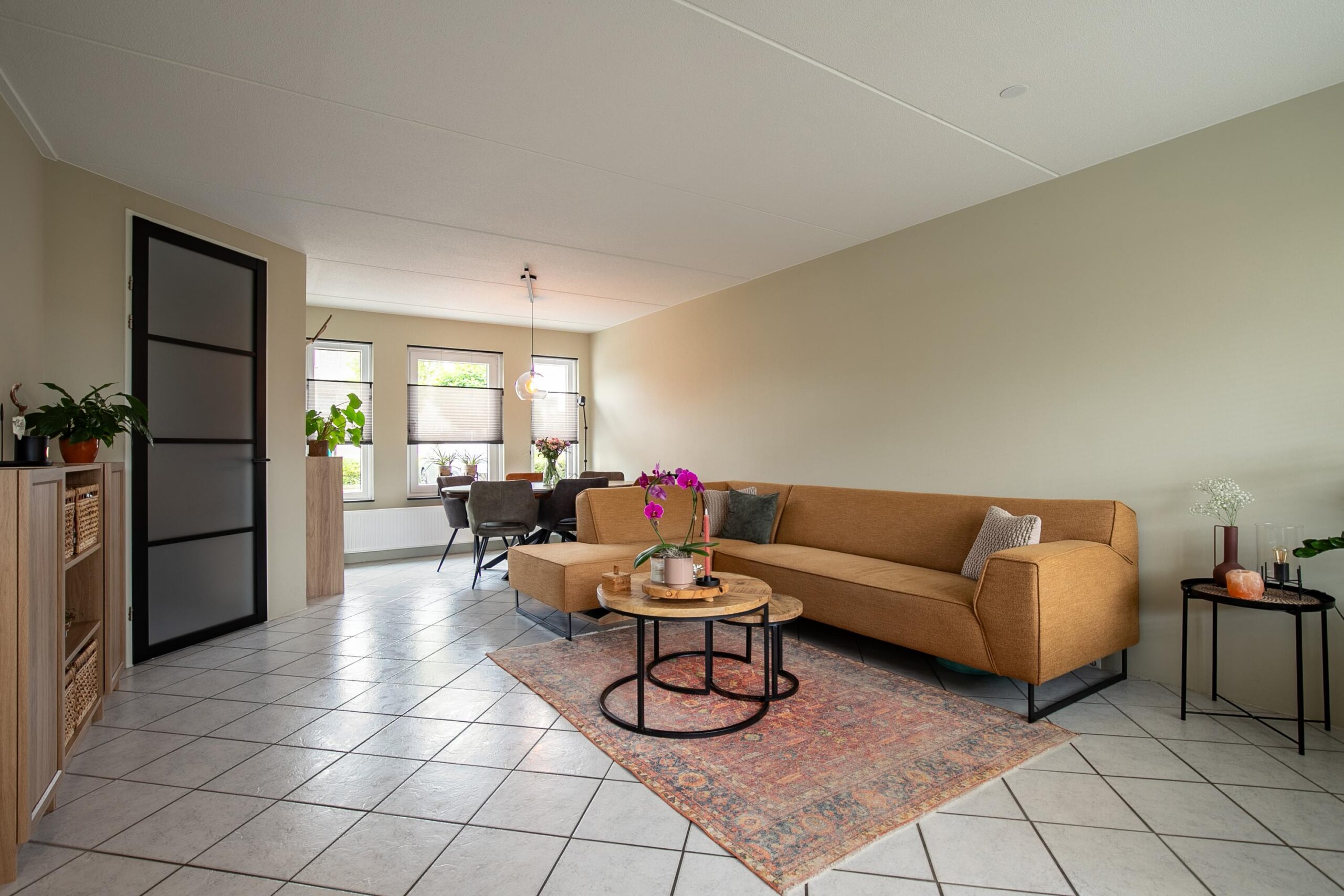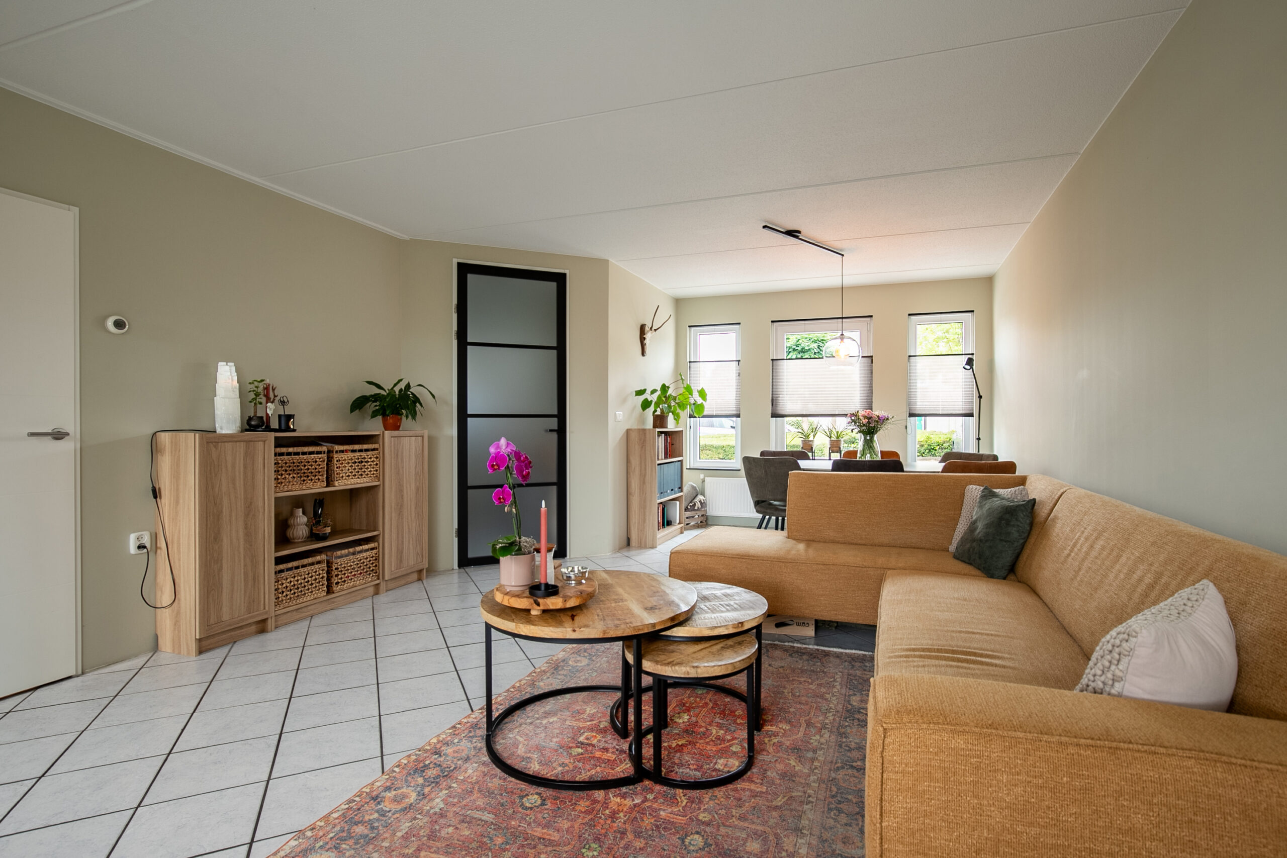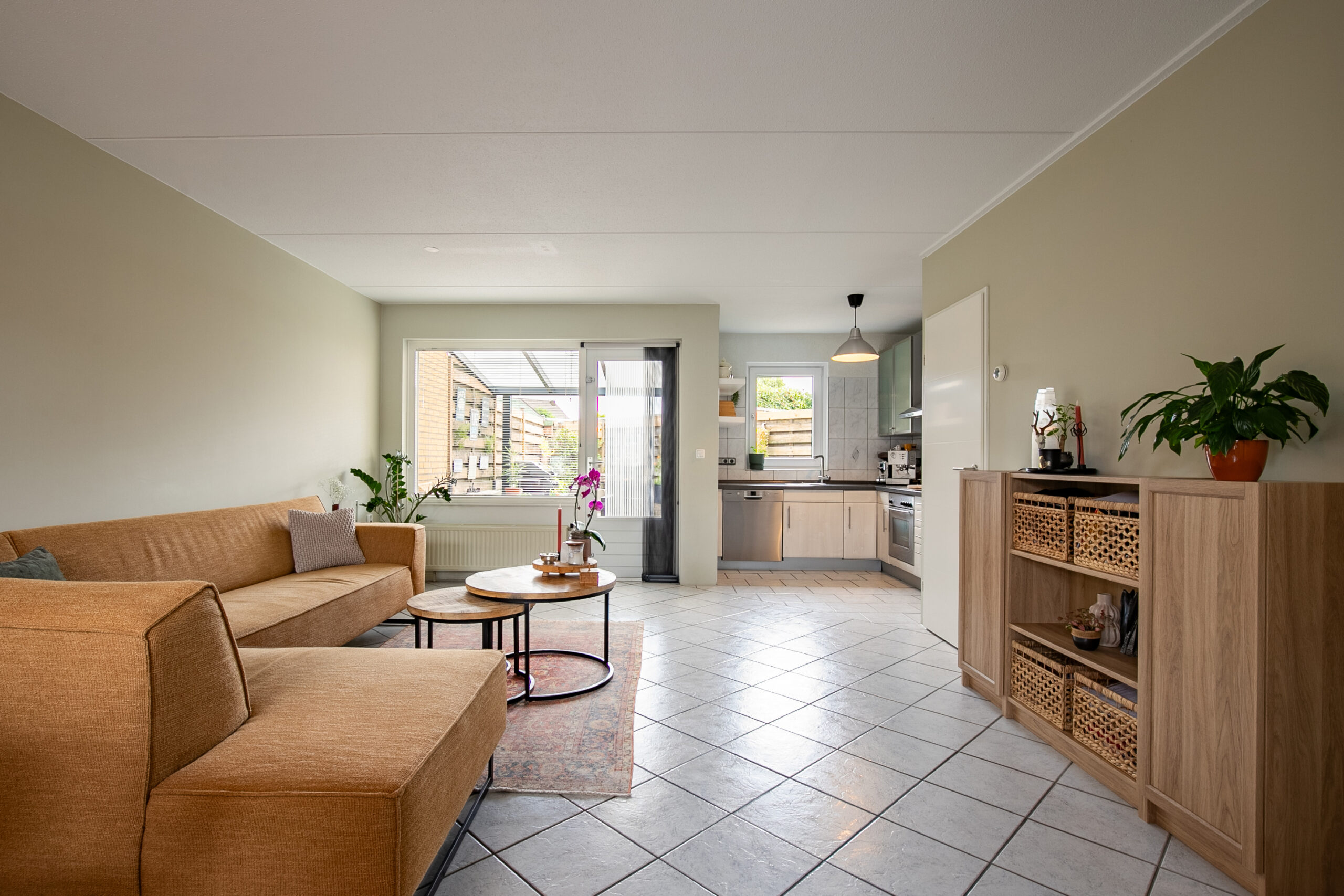De gezellige woonkamer is licht dankzij het drieluik aan raampartijen aan de voorzijde. De witte plavuizen vloer en strakke wandafwerking geven de ruimte een frisse uitstraling. Verder is er een praktische trapkast aanwezig en staat de woonkamer in open verbinding met de keuken.
