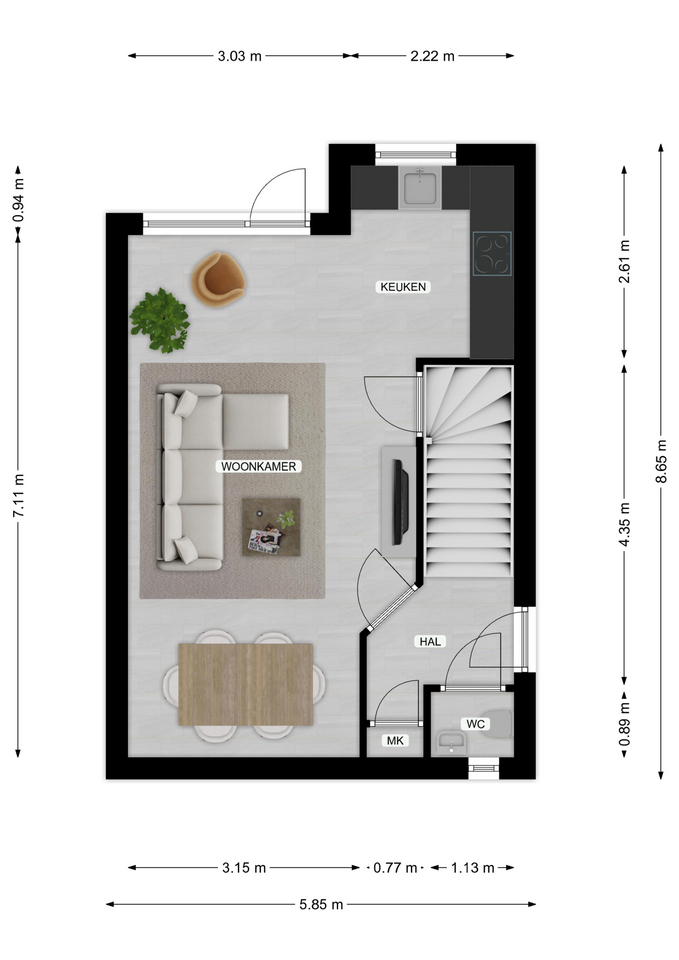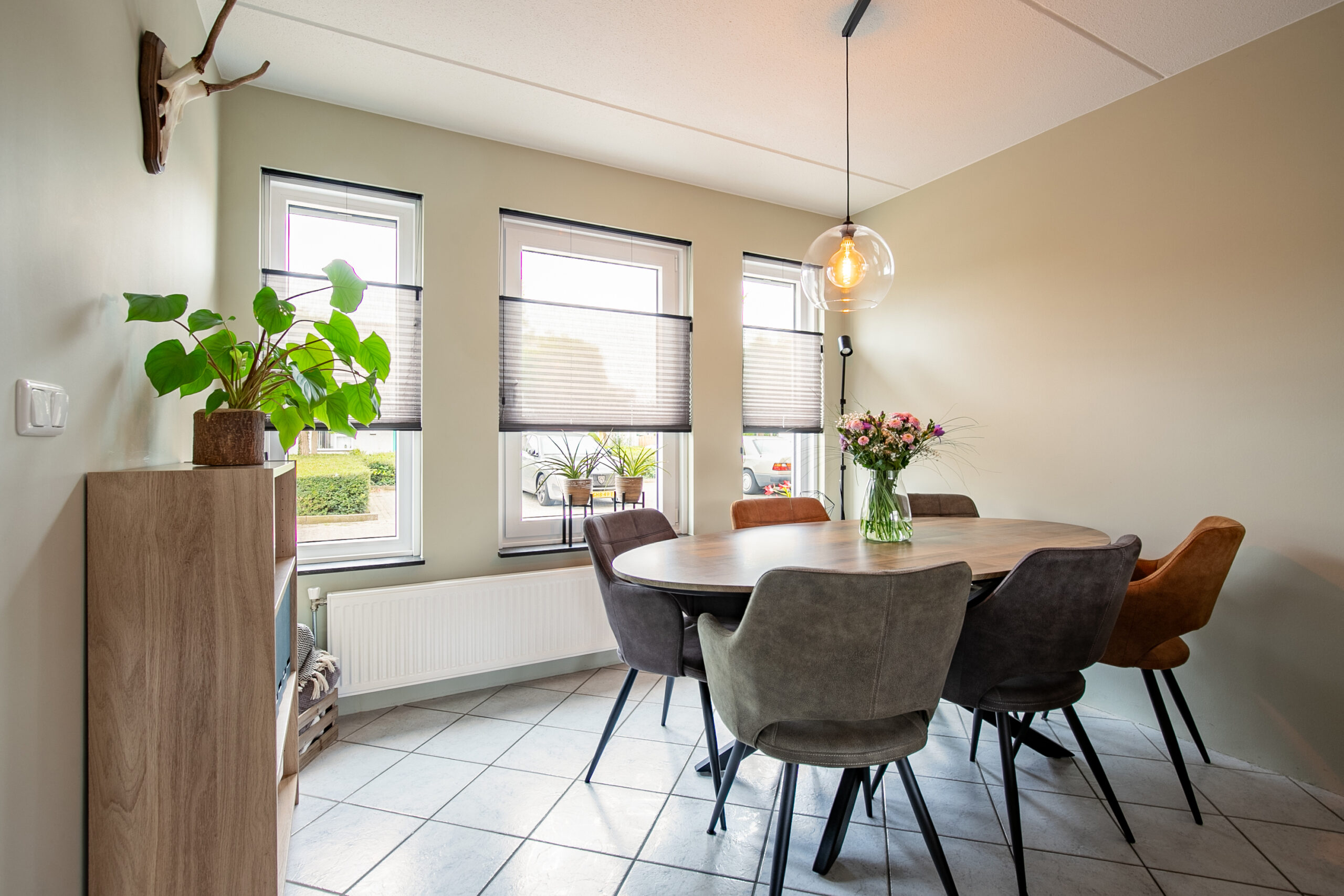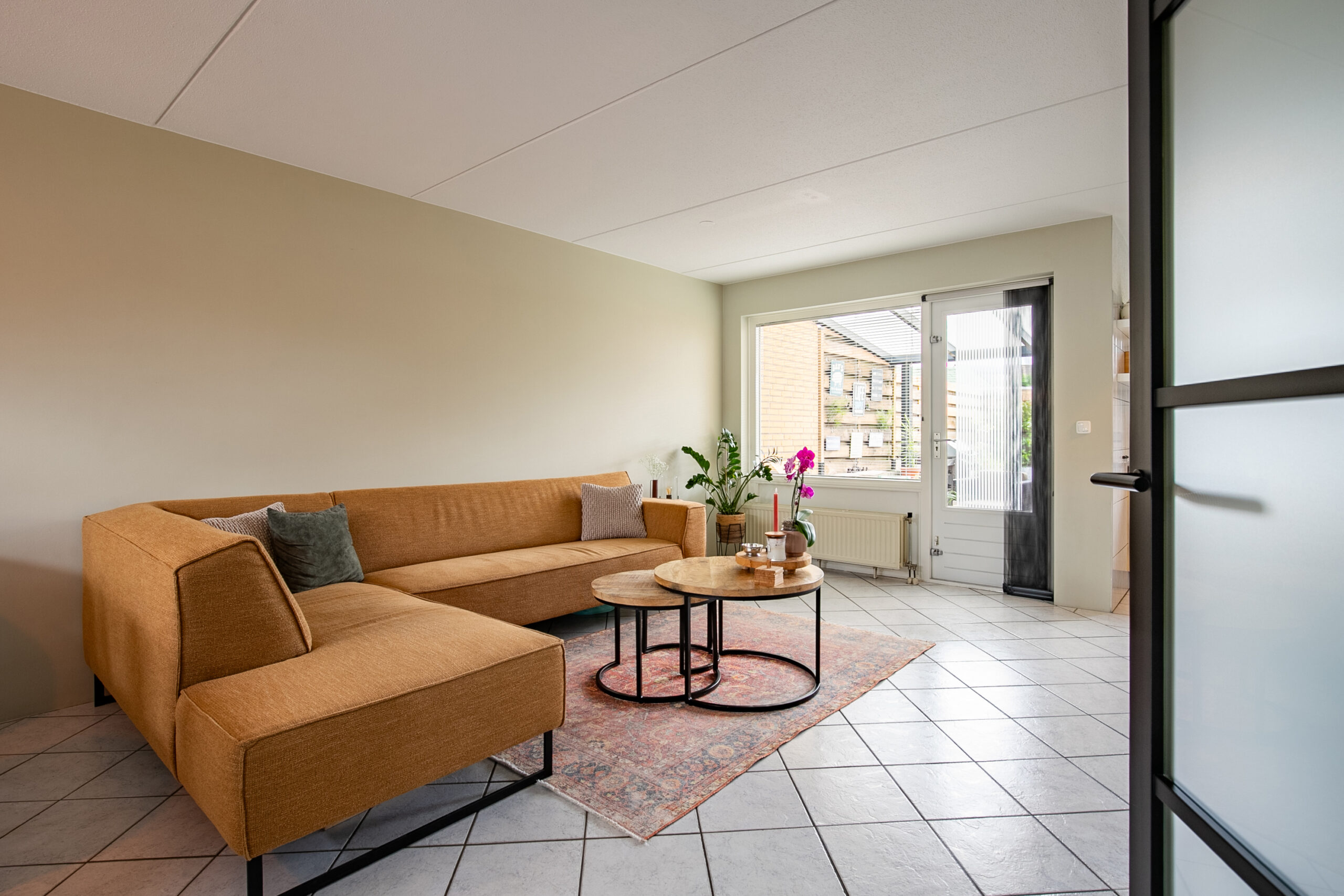 De gezellige woonkamer is licht dankzij het drieluik aan raampartijen aan de voorzijde. De witte plavuizen vloer en strakke wandafwerking geven de ruimte een frisse uitstraling. Verder is er een praktische trapkast aanwezig en staat de woonkamer in open verbinding met de keuken.
