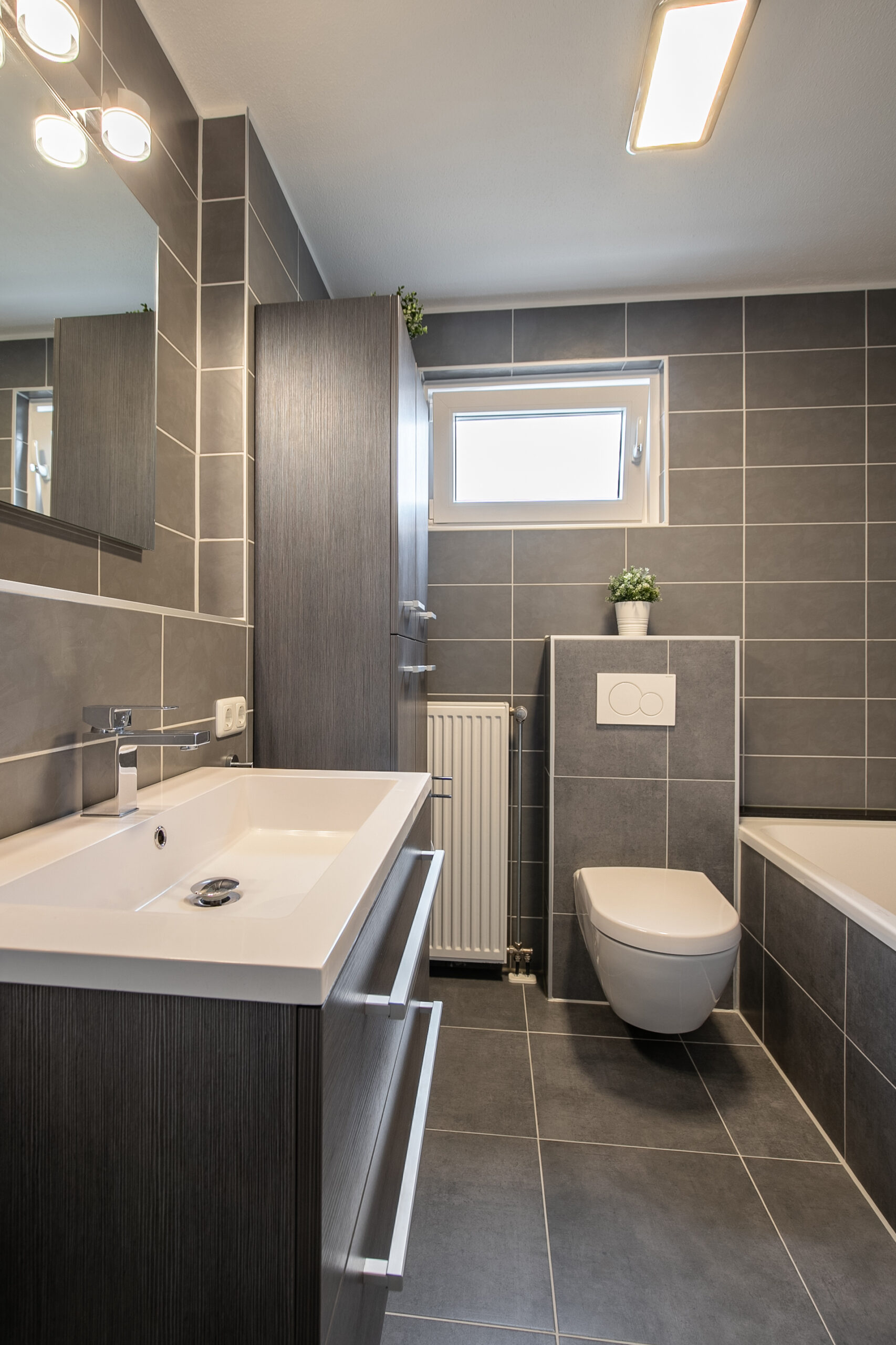 De geheel betegelde badkamer is modern ingericht met een tweede vrijhangend toilet, ligbad, radiator, wastafel met bijpassend badmeubel en een raam voor natuurlijke ventilatie. Verder is er een separate bergkast met de combi cv-ketel (Nefit, huur, bwj. 2019) en de mechanische afzuiging voor badkamer en keuken.