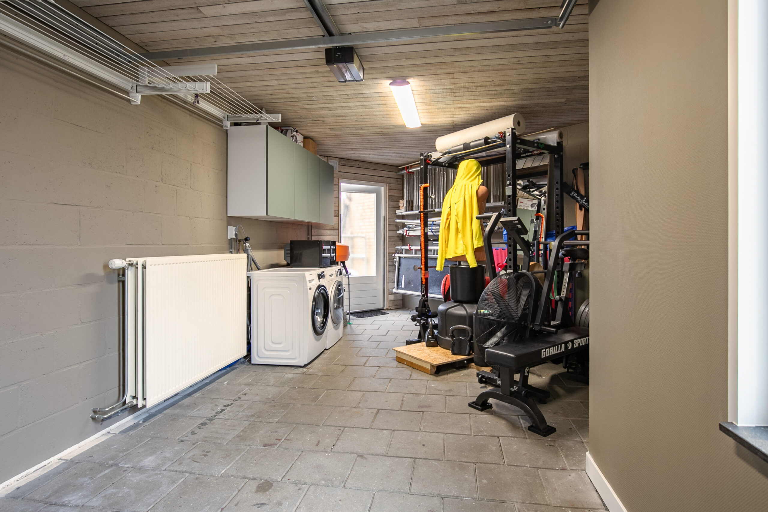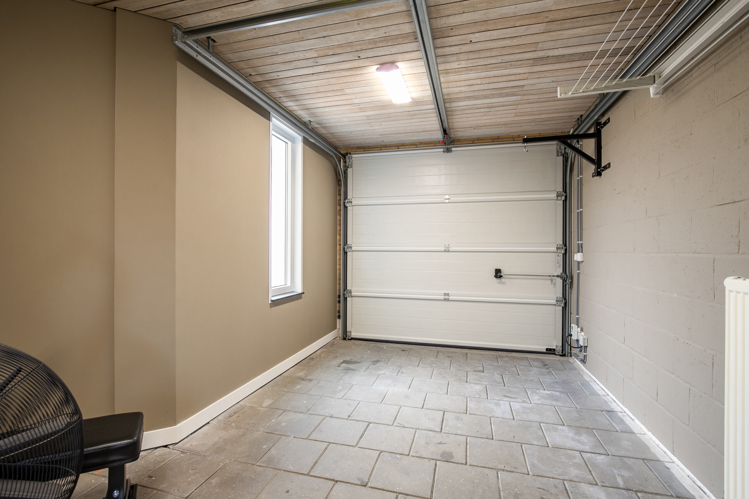 De garage is een echte meerwaarde, uitgerust met een elektrisch bedienbare sectionaalpoort (met afstandsbediening en Bluetooth via de telefoon), verwarming, isolatiepakket, aansluitpunten voor witgoedapparatuur en een loopdeur naar de tuin.